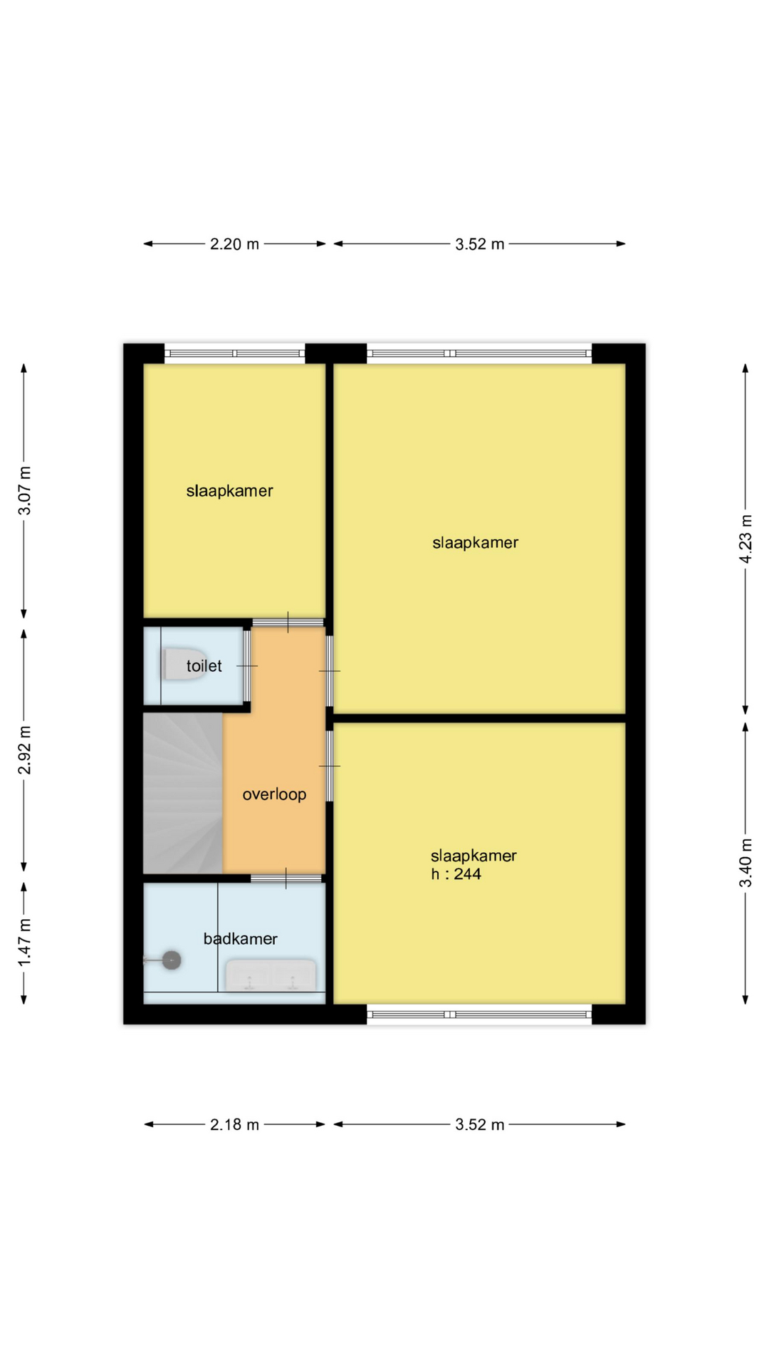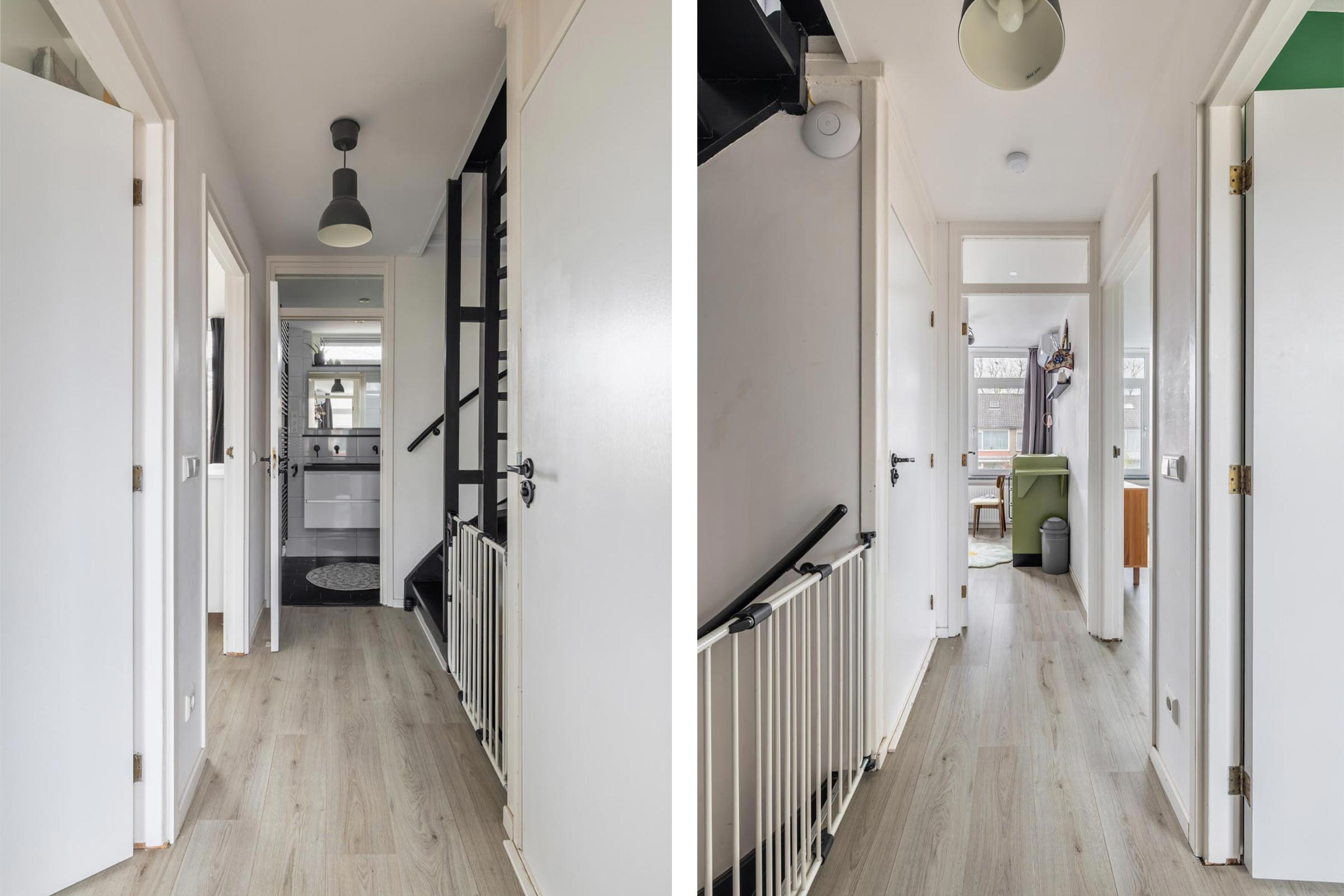 De overloop biedt toegang tot drie slaapkamers, een separate toiletruimte en de badkamer.