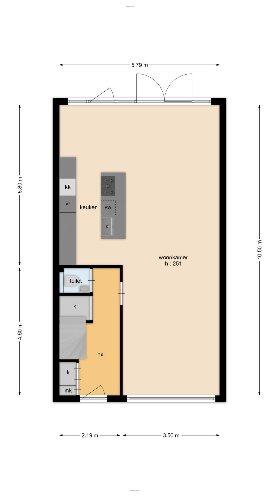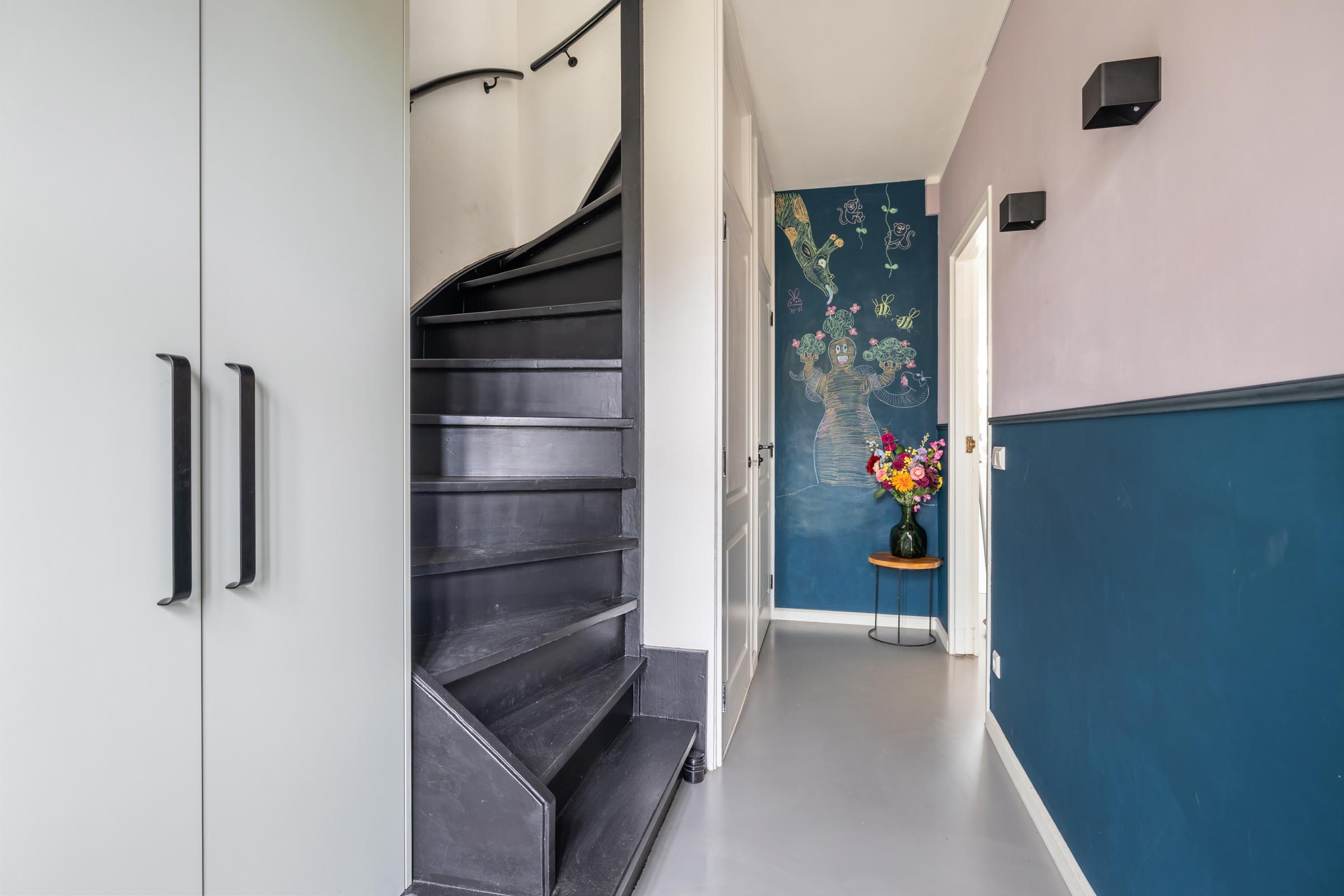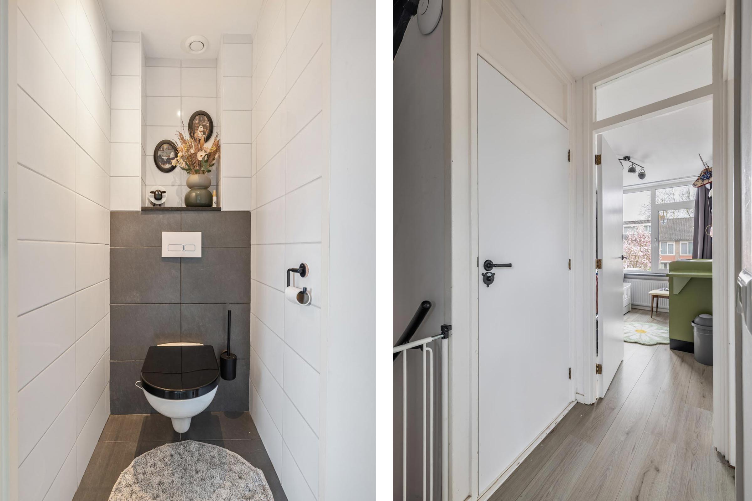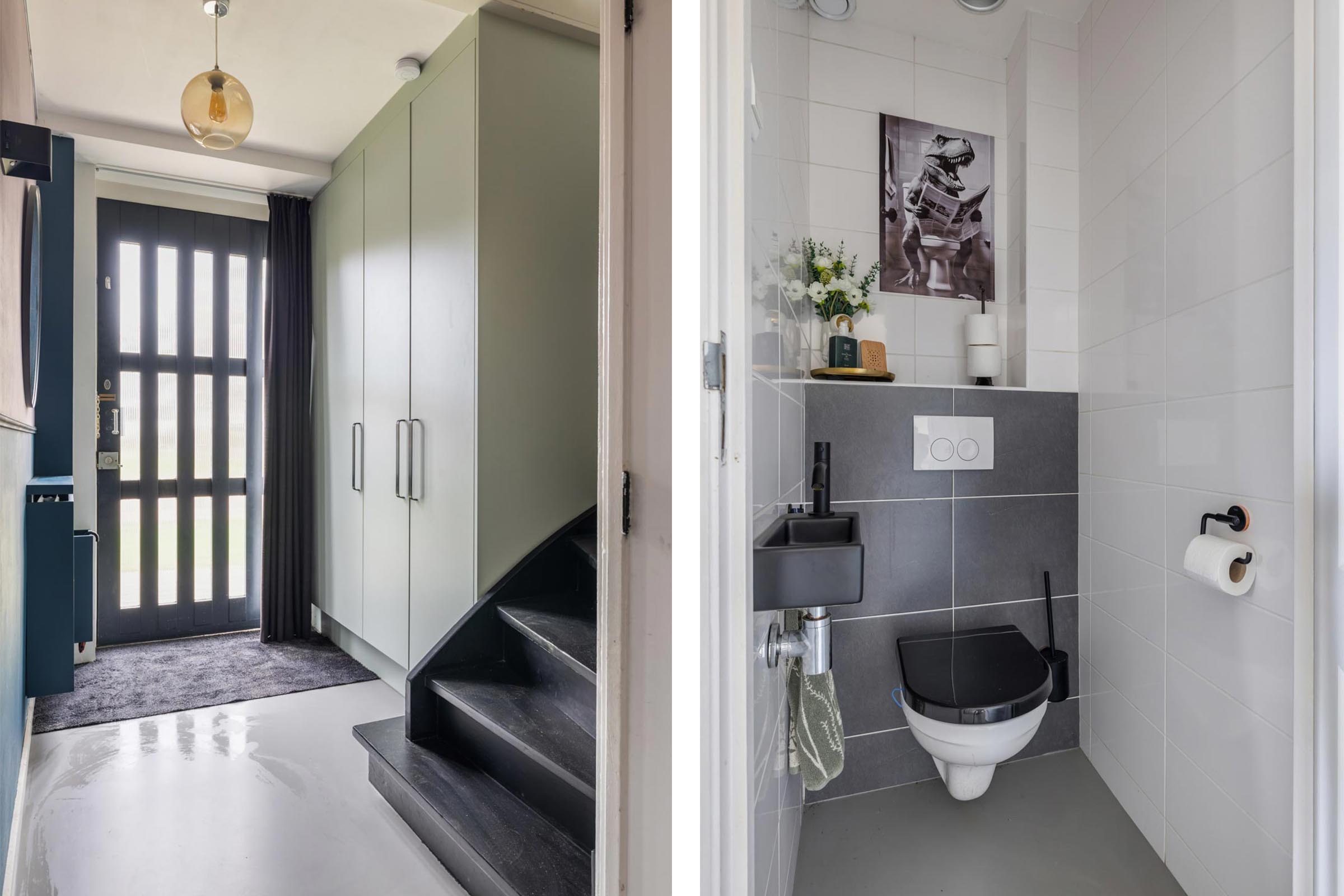 Je komt binnen in een verzorgde hal met maatwerk kastenwand en een moderne meterkast. Hier bevinden zich tevens de trapopgang, trapkast en een strak afgewerkte toiletruimte met zwevend toilet.