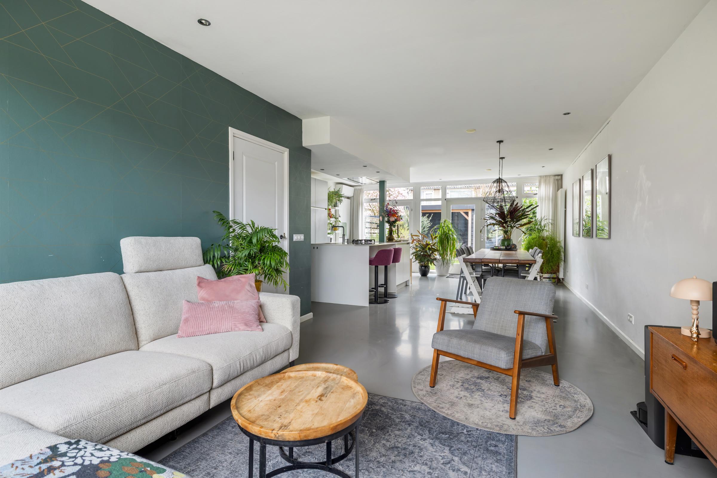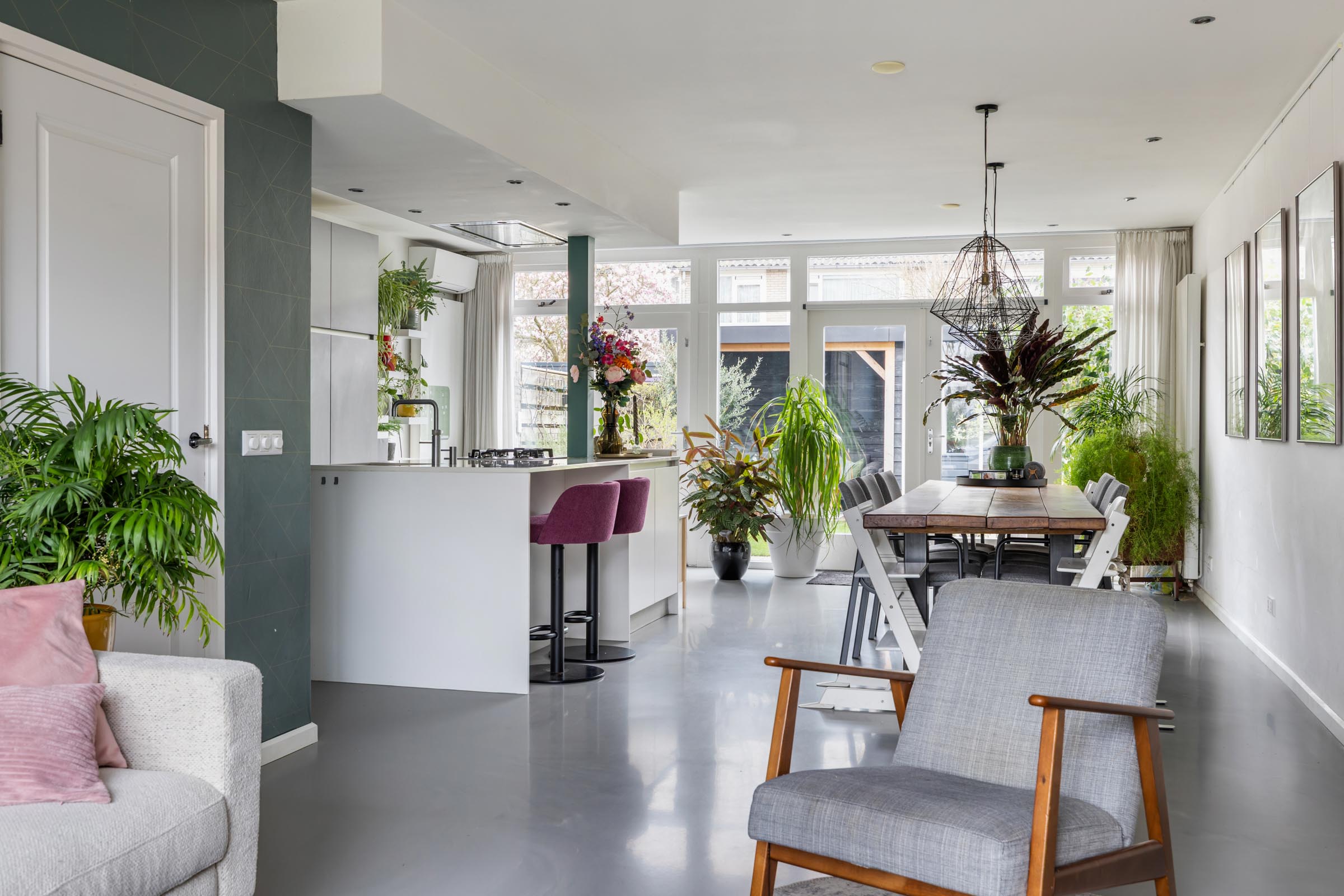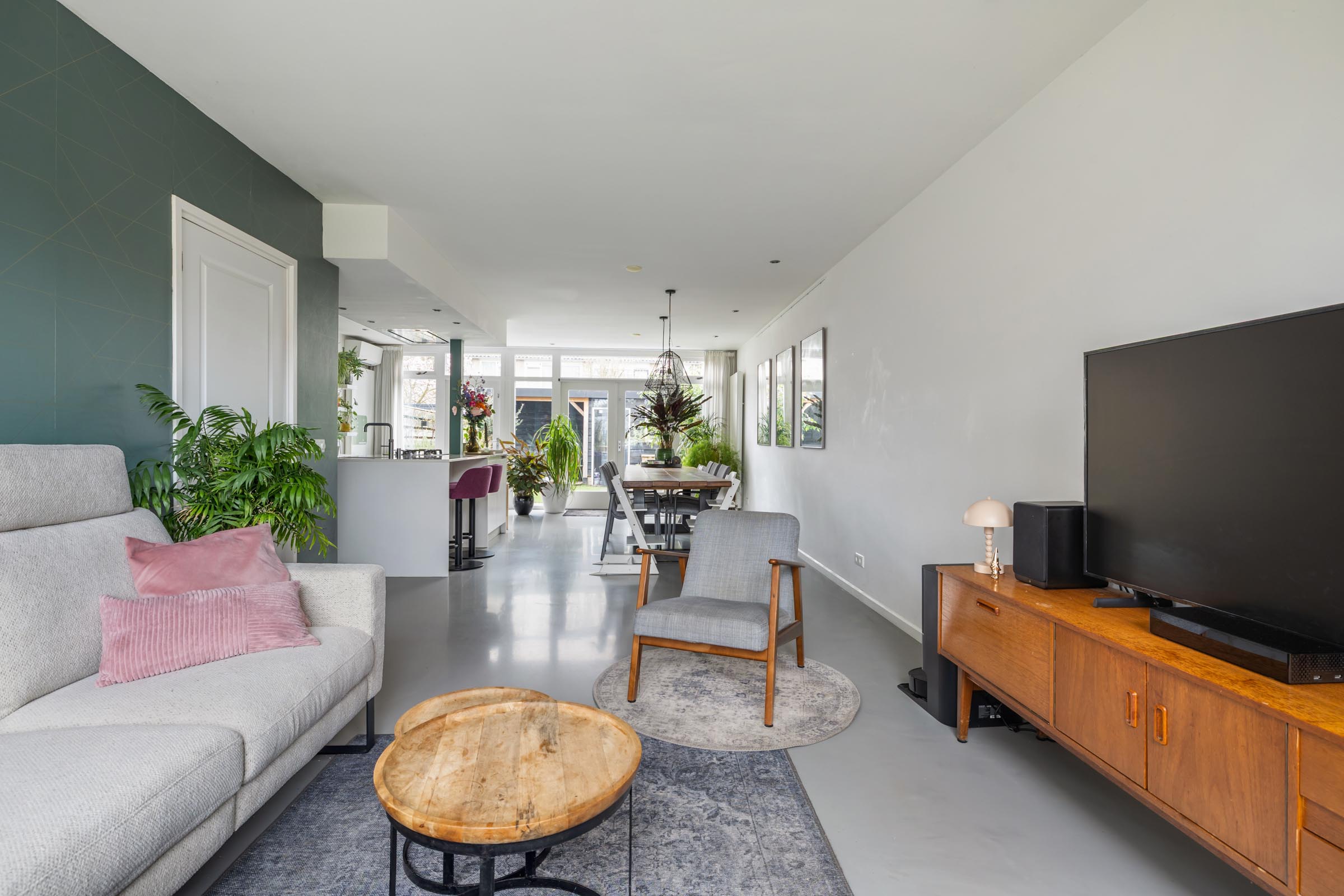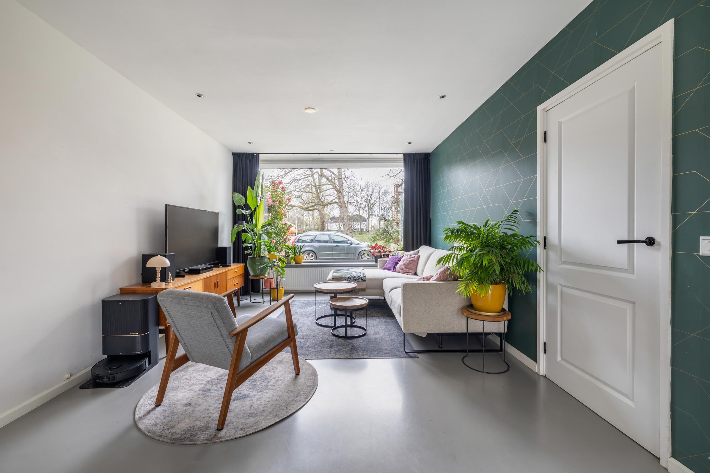 De uitgebouwde woonkamer is een echte eyecatcher: ruim, licht en modern afgewerkt met een fraaie gietvloer, strak gestucte wanden en plafond met inbouwspots. Dankzij de grote raampartijen aan de voorzijde geniet je van veel lichtinval en een vrij uitzicht.