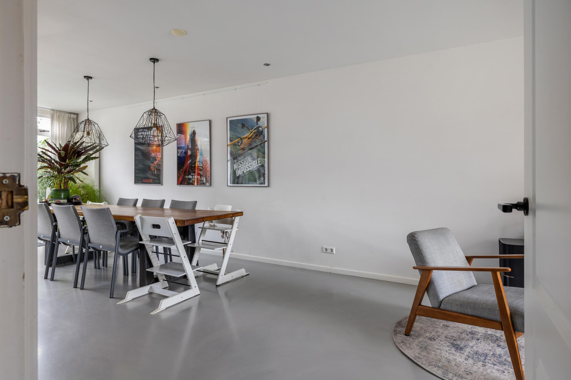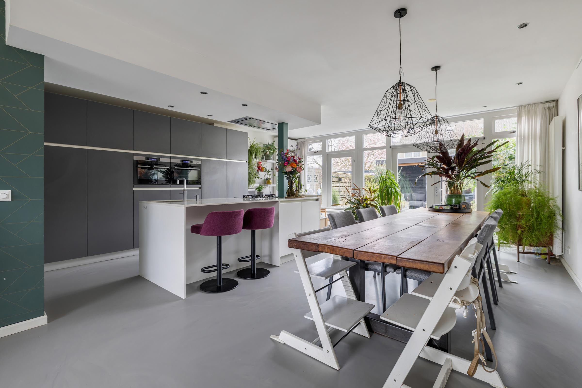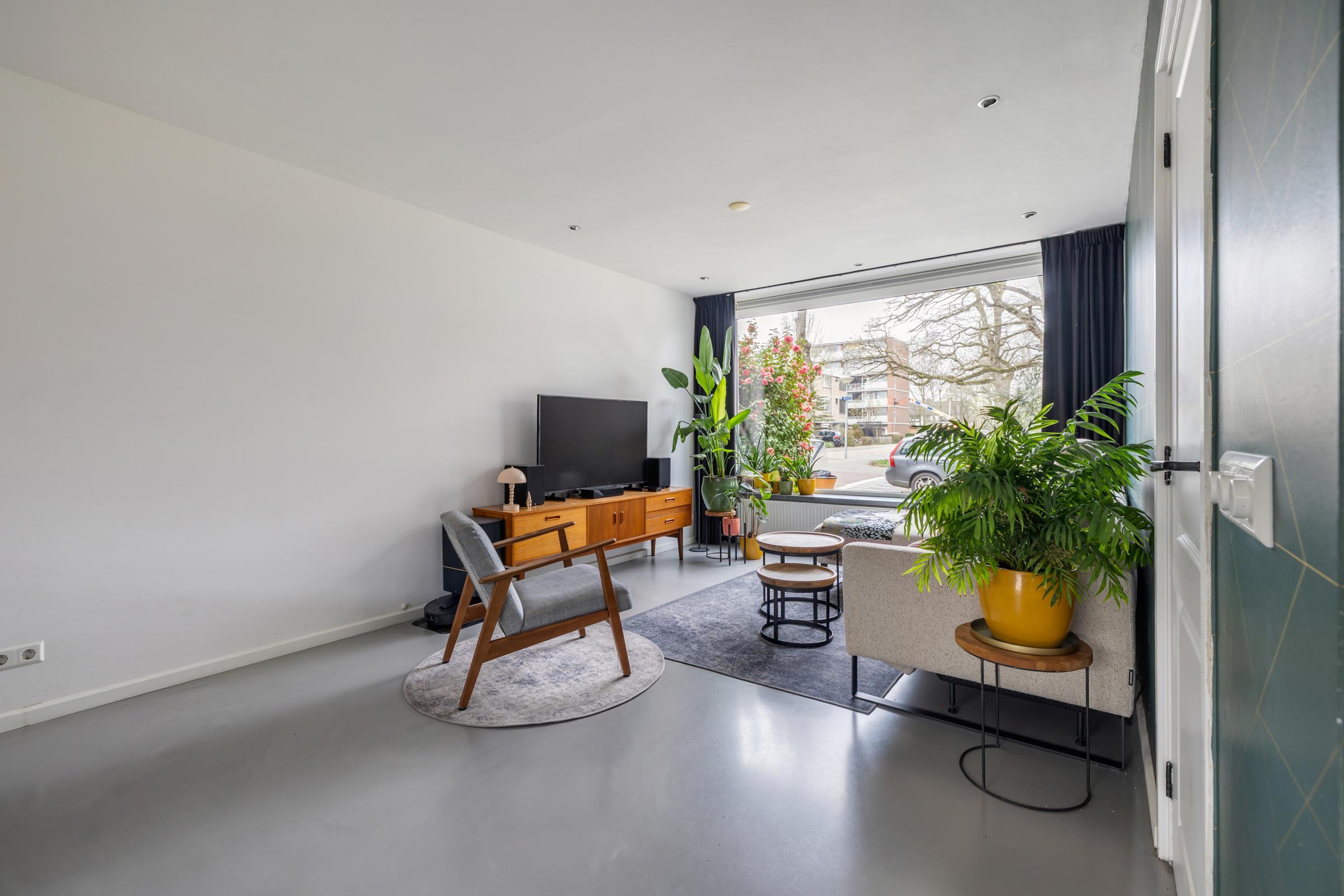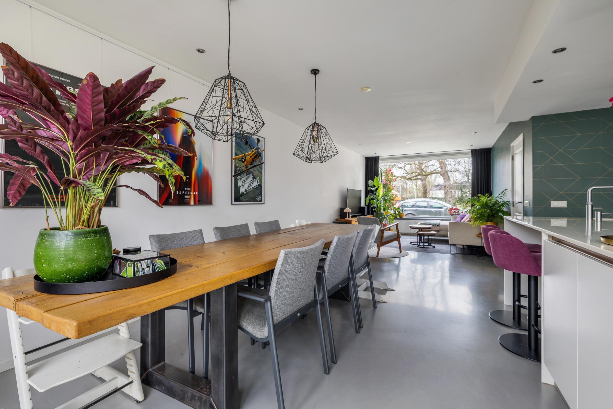 De uitgebouwde woonkamer is een echte eyecatcher: ruim, licht en modern afgewerkt met een fraaie gietvloer, strak gestucte wanden en plafond met inbouwspots. Dankzij de grote raampartijen aan de voorzijde geniet je van veel lichtinval en een vrij uitzicht.