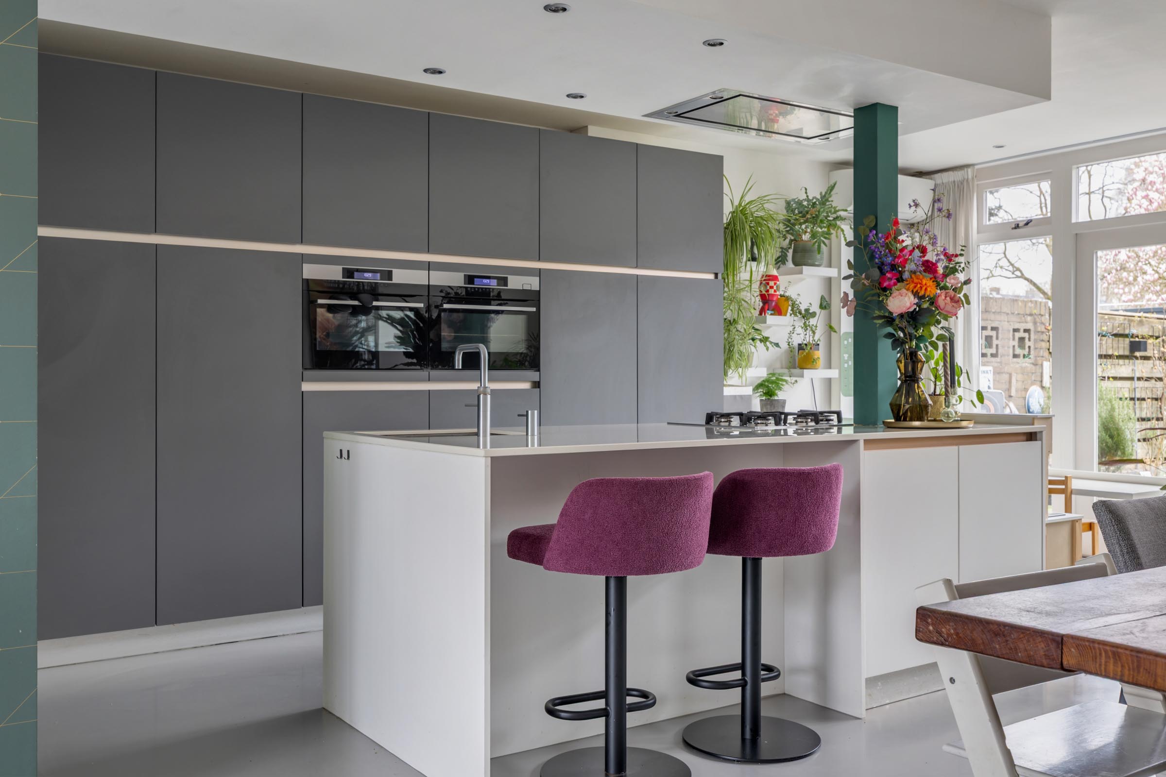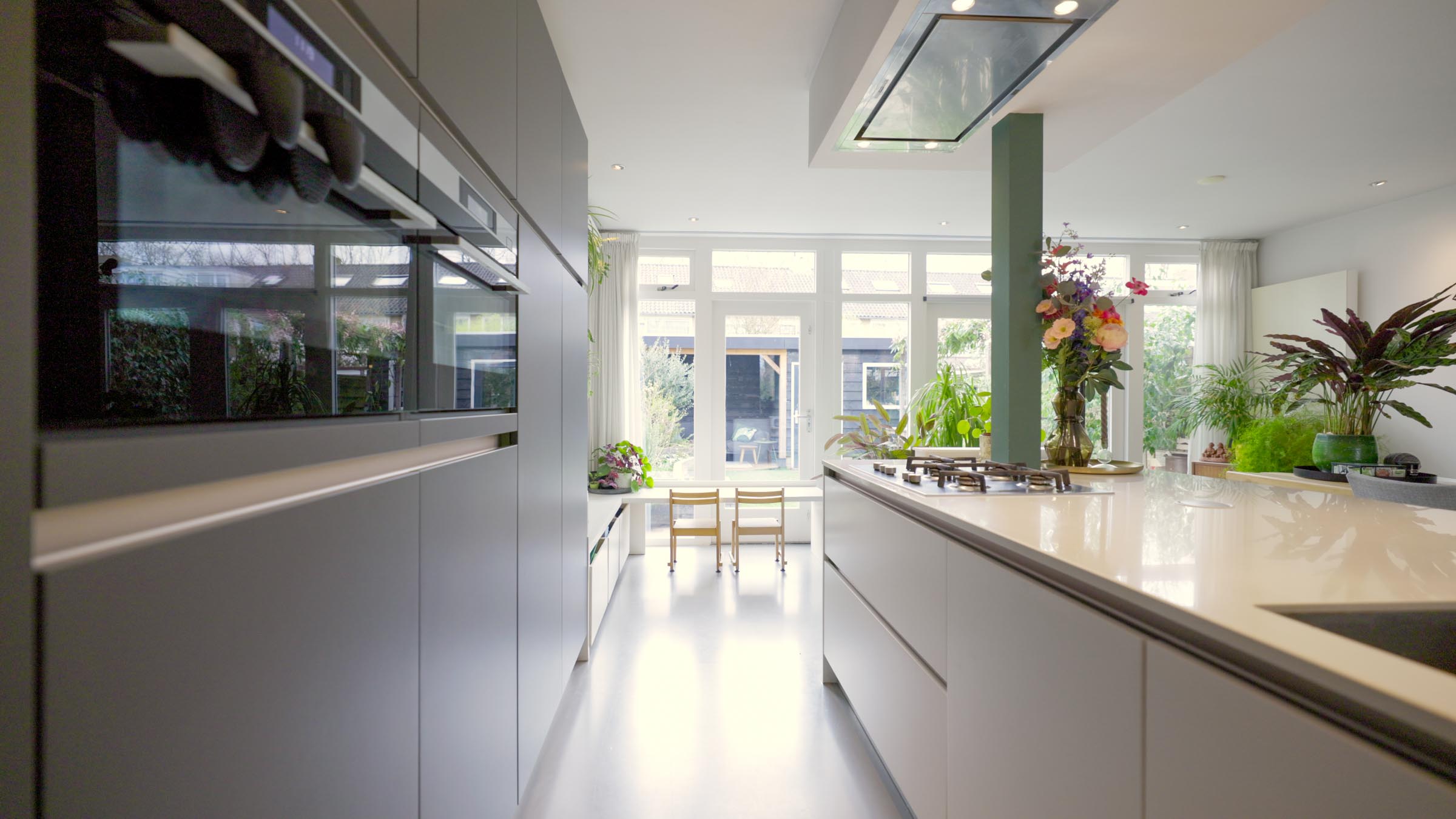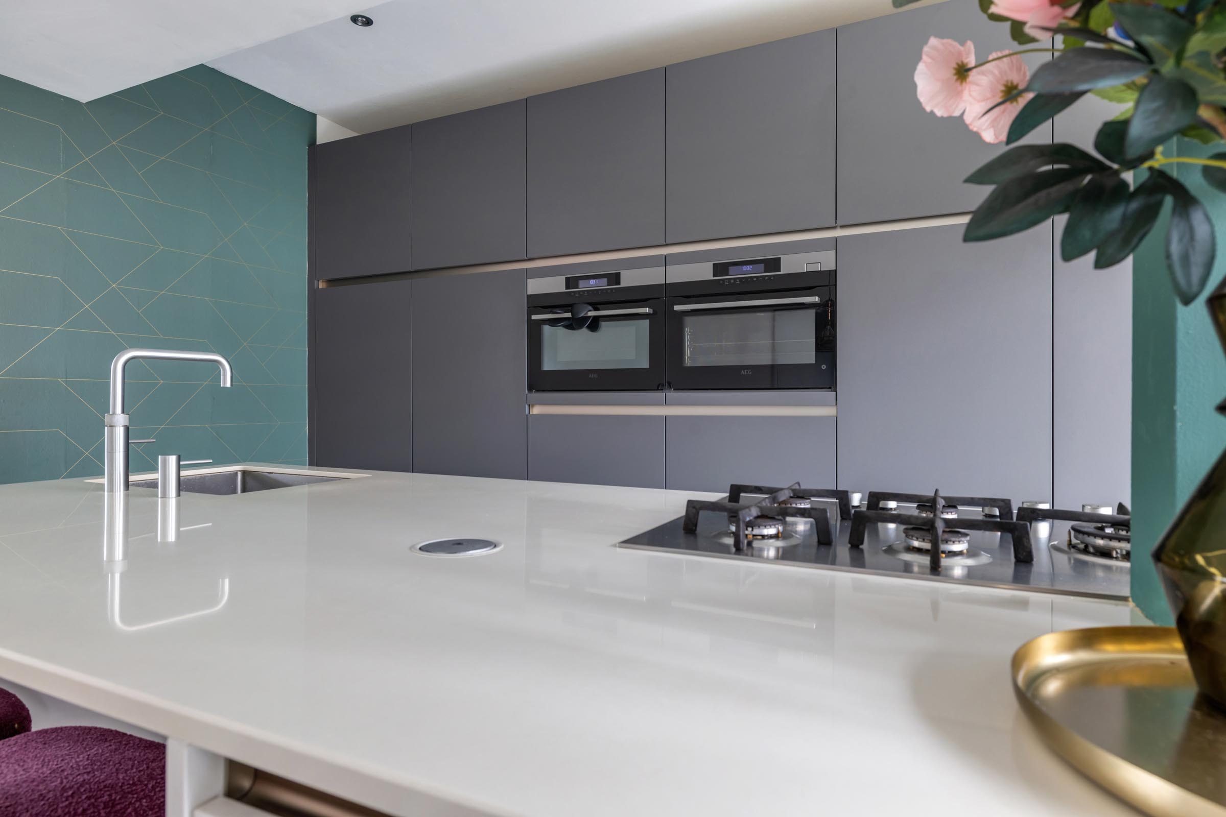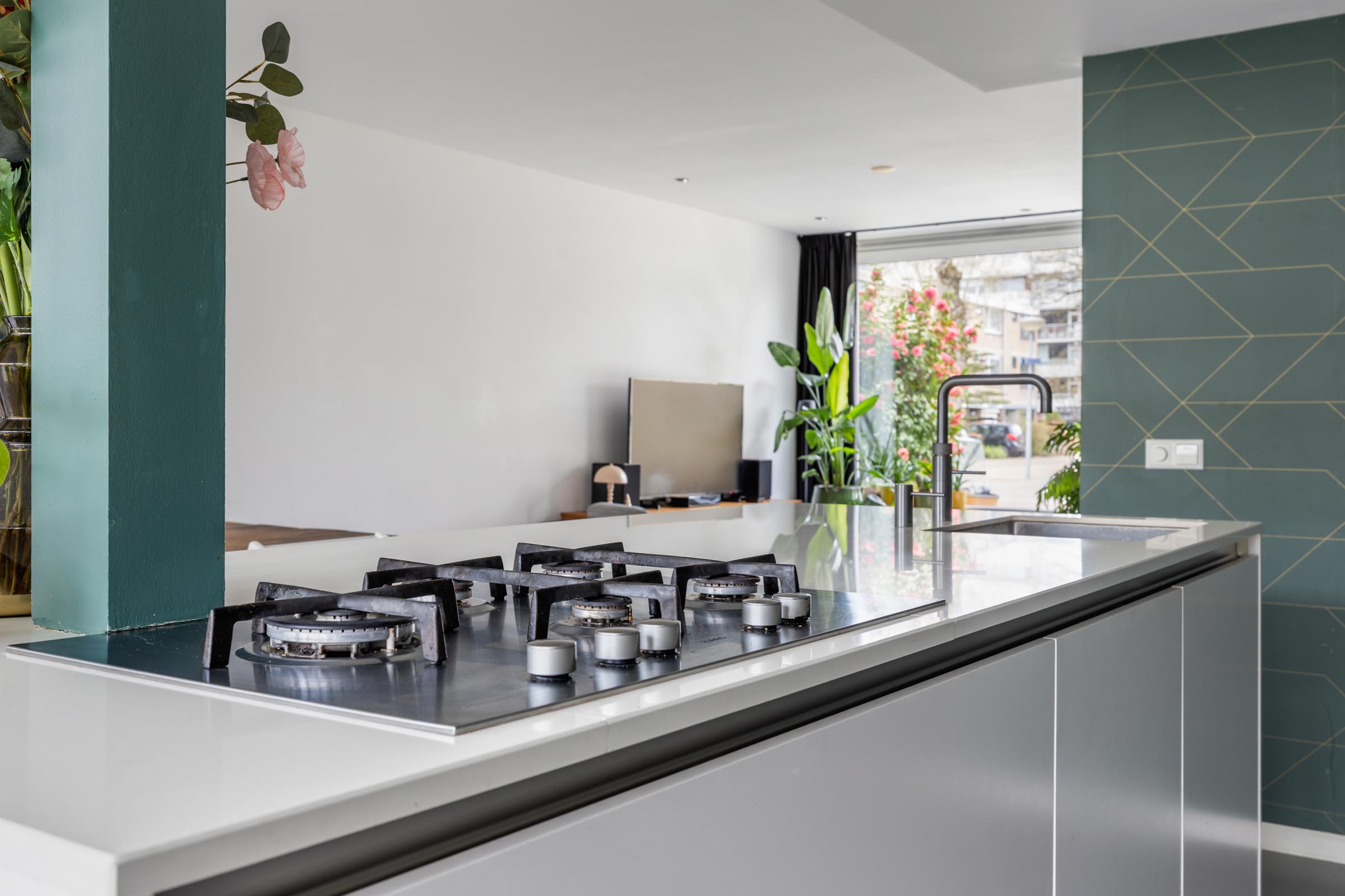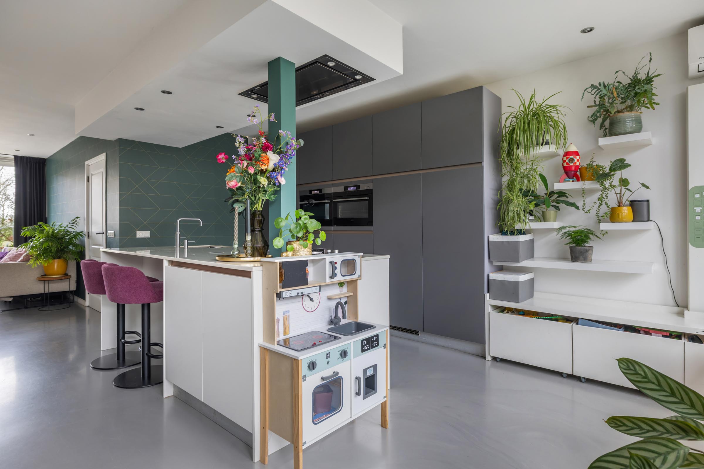 De woonkamer loopt naadloos over in de luxe open keuken met kookeiland. Deze moderne leefkeuken is voorzien van een composiet werkblad, Quooker, vaatwasser, 5-pits gaskookplaat, afzuigkap en volop bergruimte. De vaste kastenwand beschikt over diverse inbouwapparatuur, waaronder een koelkast, vriezer, combi oven/magnetron en een combi-stoomoven.