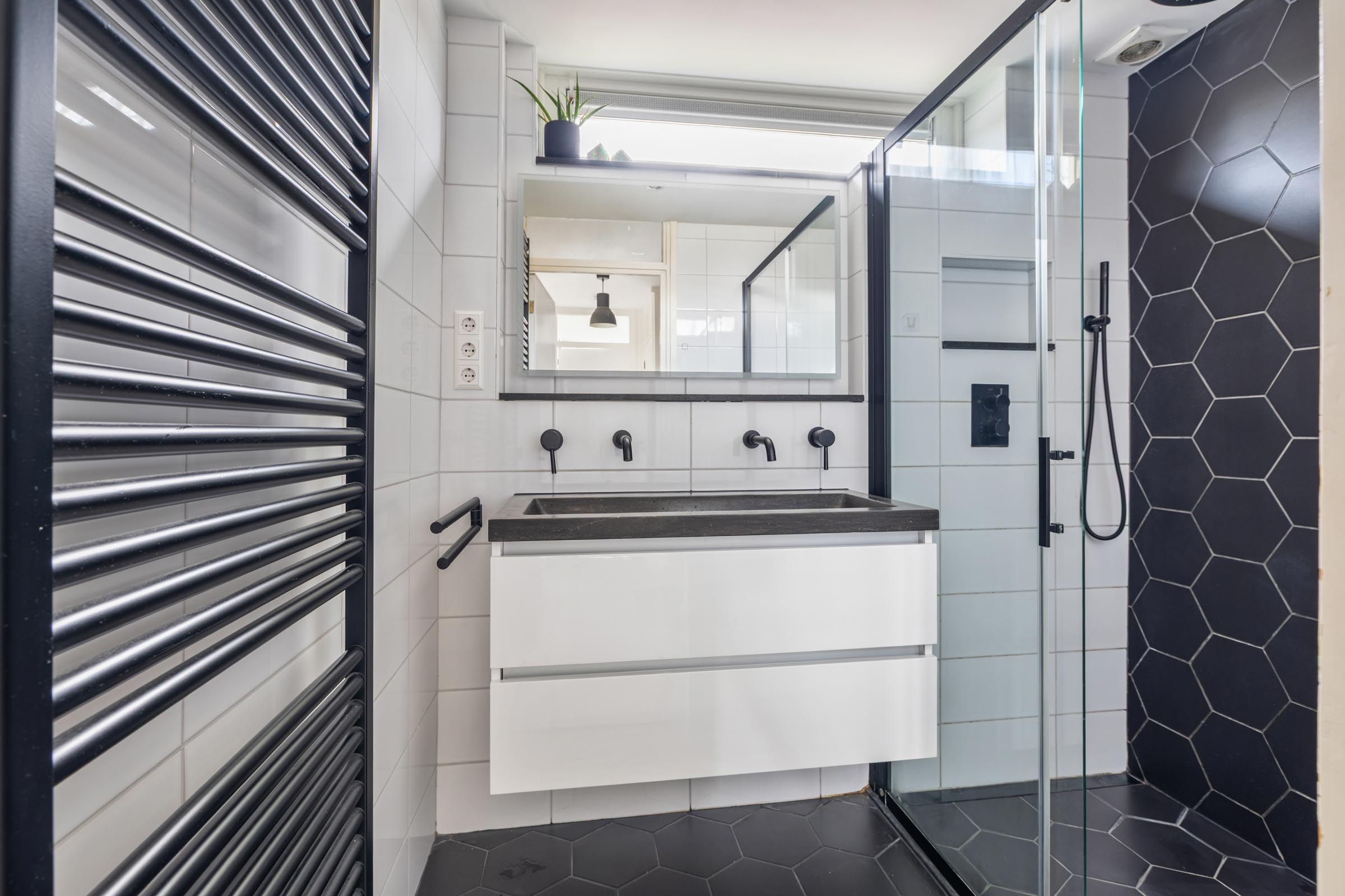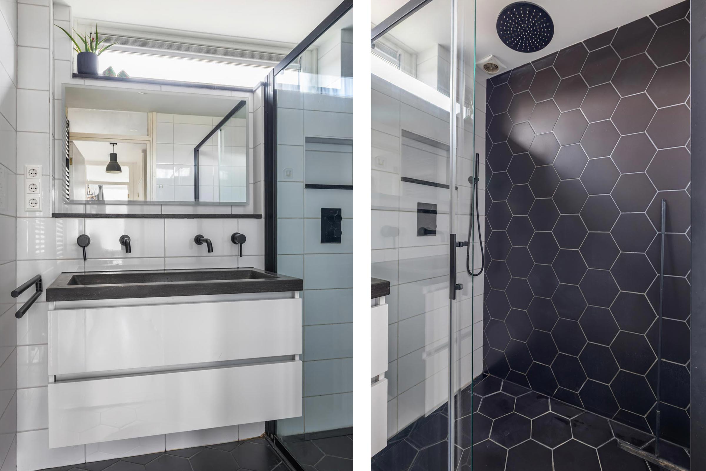 De moderne badkamer is compleet uitgerust met een inloopdouche, wastafelmeubel en designradiator.