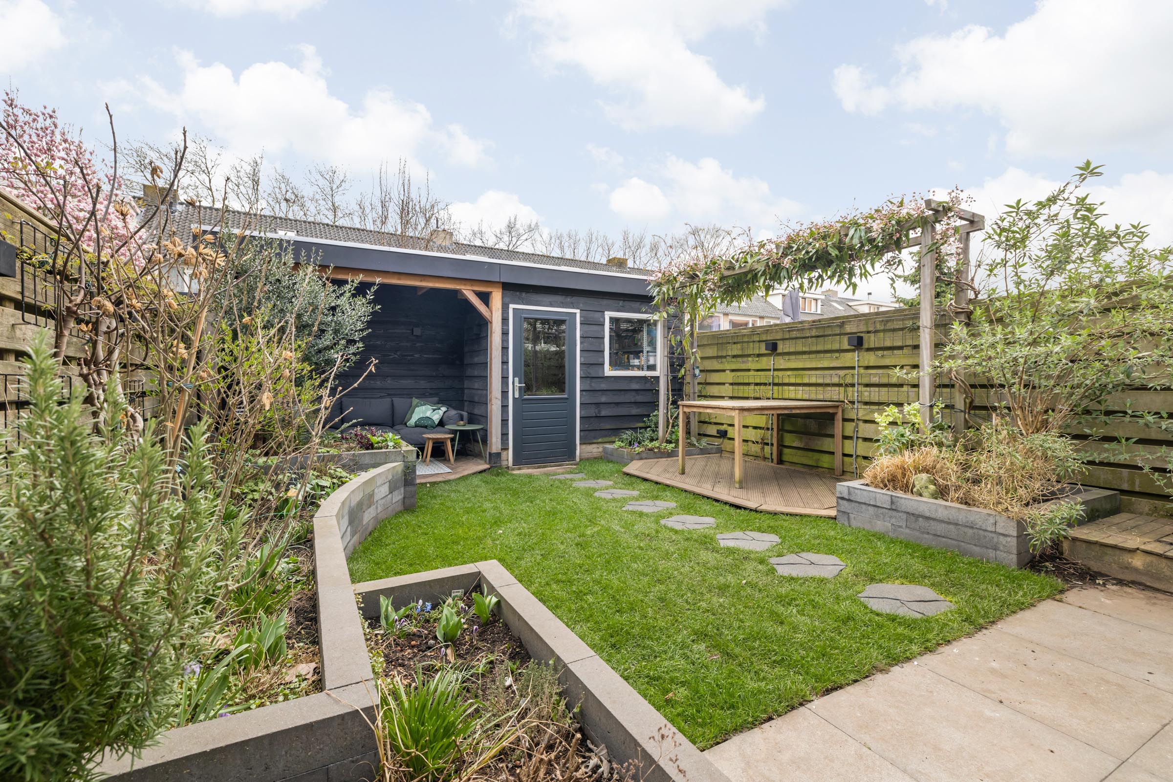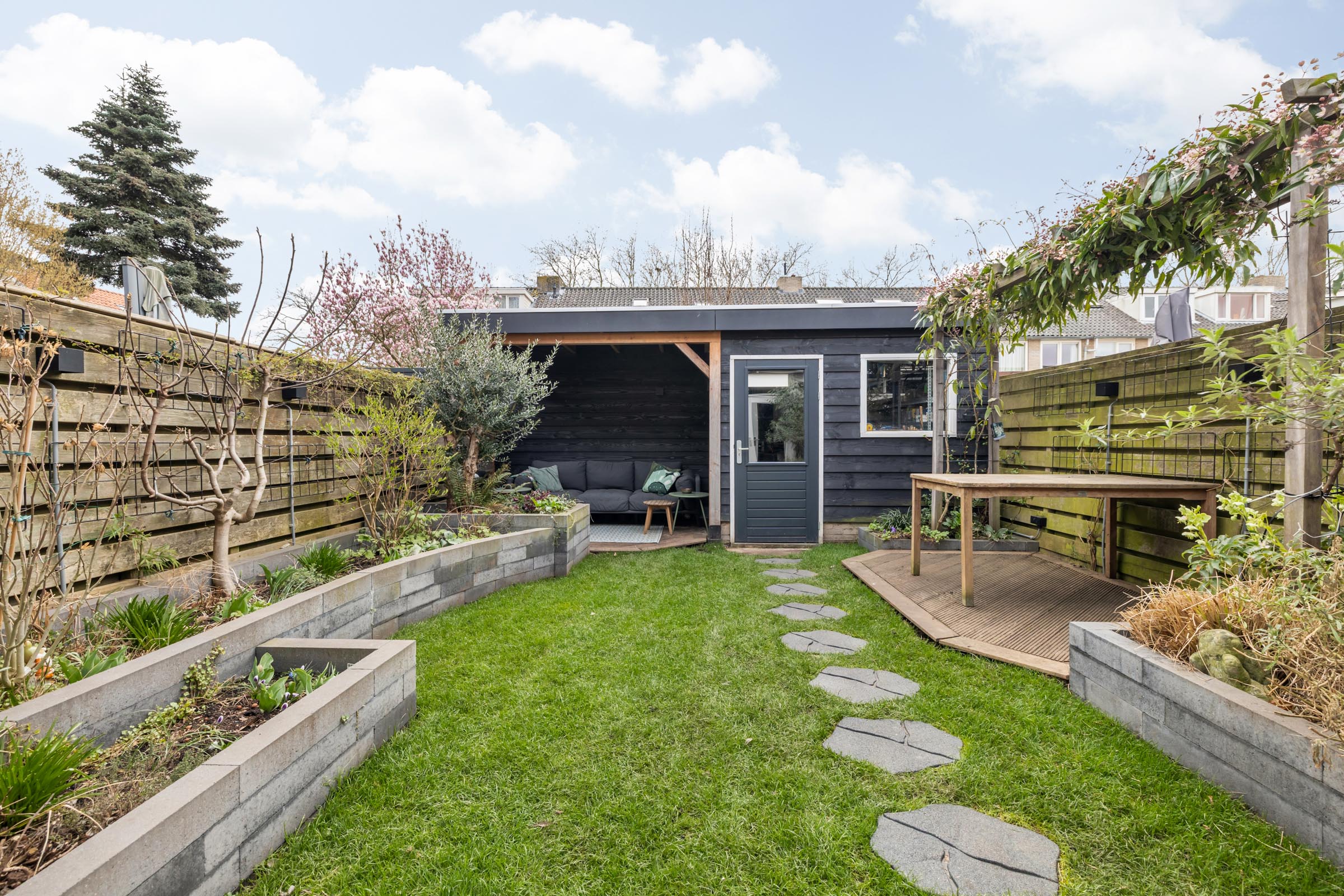 De fraai aangelegde achtertuin ligt gunstig op het zuidoosten en is voorzien van een elektrisch zonnescherm, gazon, border met diverse vaste beplanting (tuinplan) en een gezellige overkapping. Achterin vind je een stenen berging met elektra en overdekte achterom.