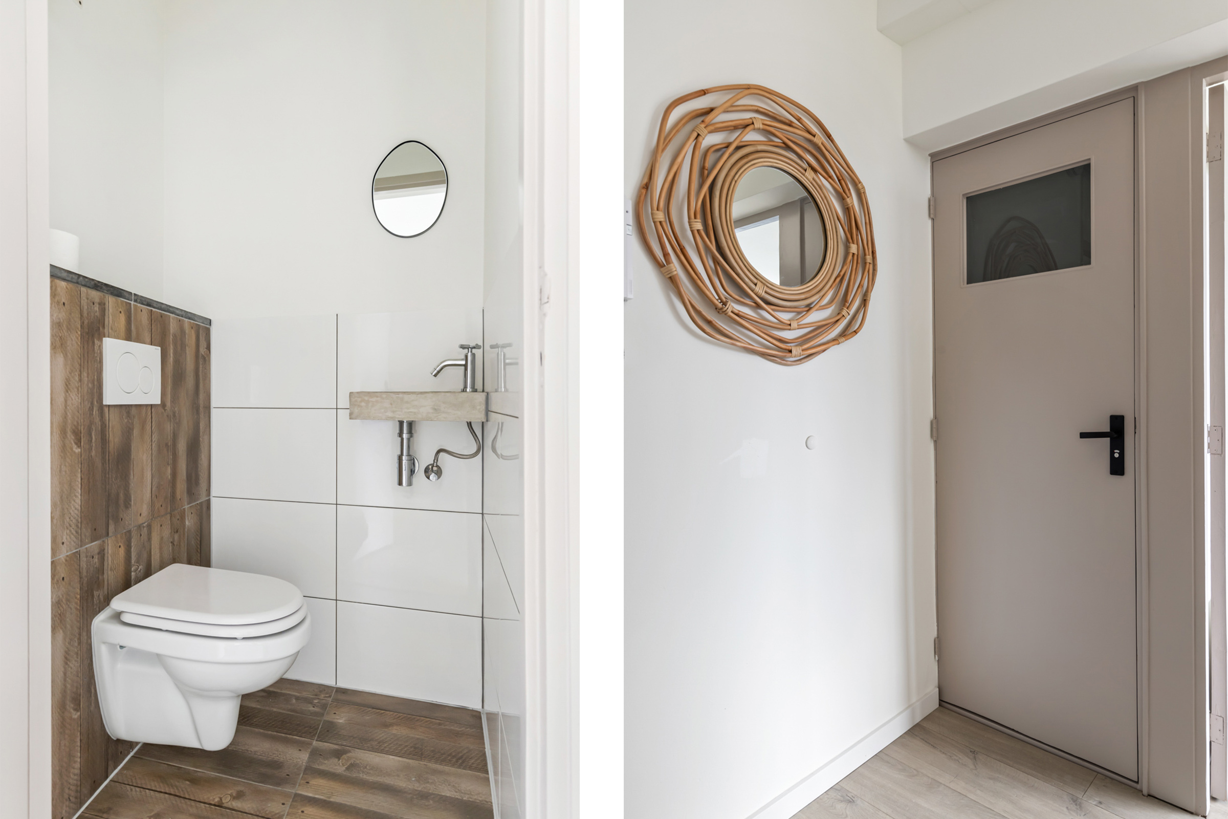 Separate toiletruimte met vrijhangend toilet en fonteintje.