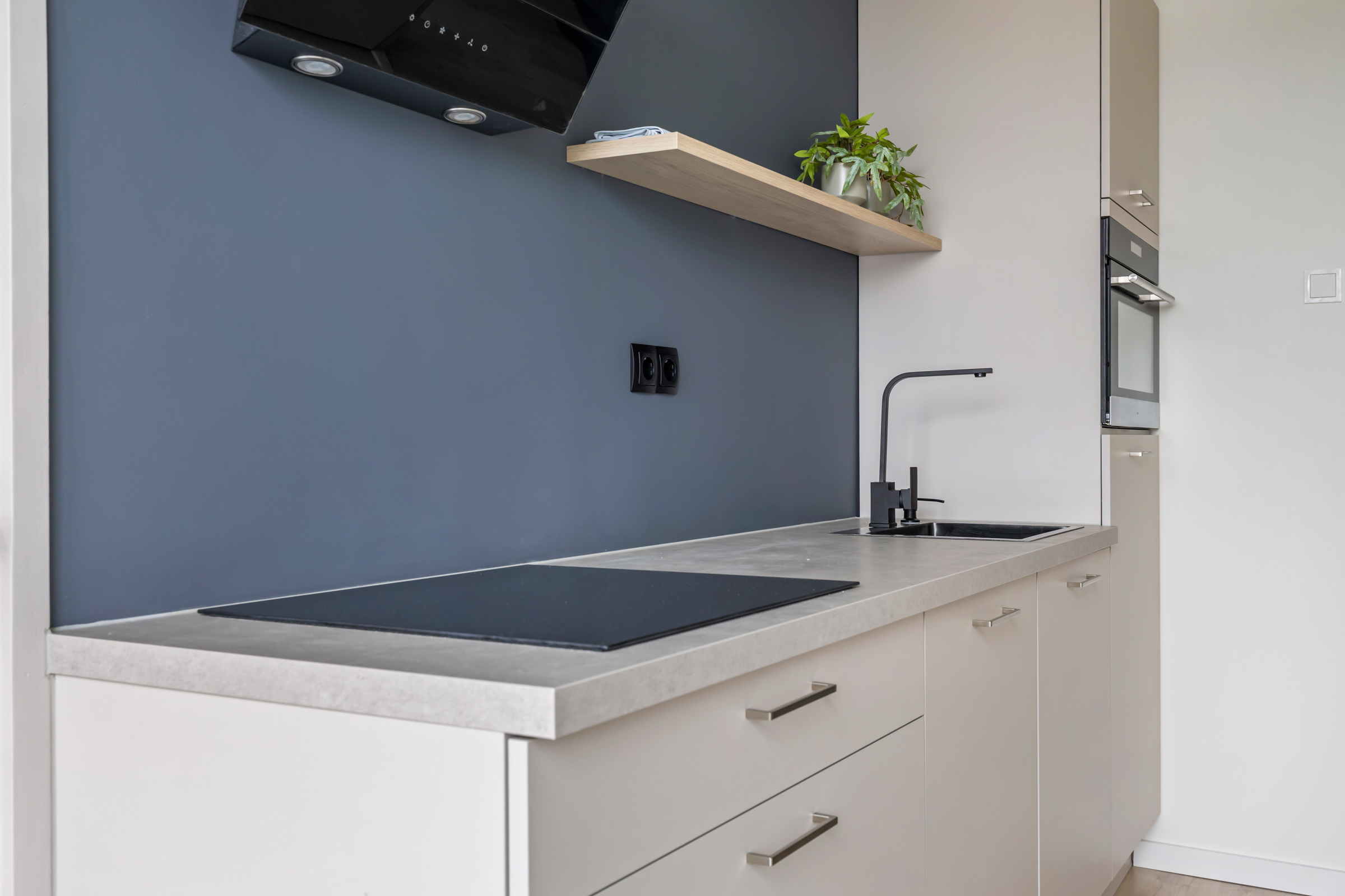 Nieuwe dichte keuken voorzien van inbouwapparatuur: vaatwasser, 4-pits inductiekookplaat, afzuigkap, inbouwkoelkast en een combi oven/magnetron.