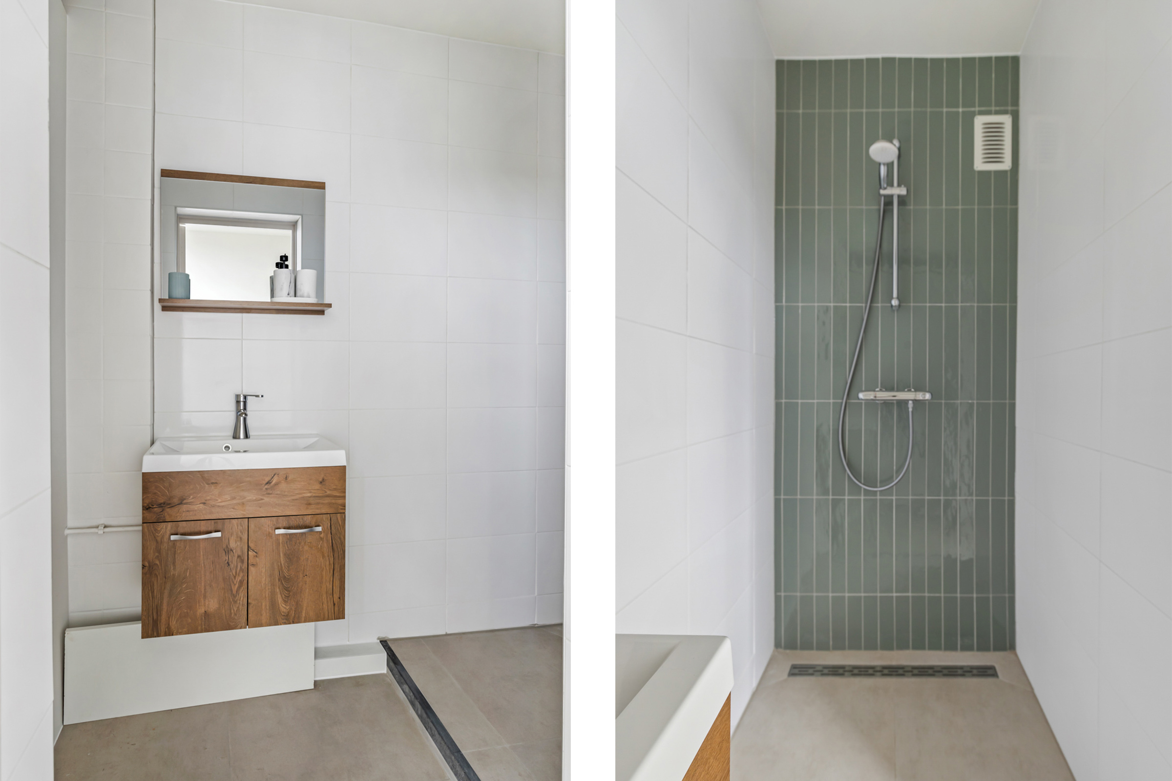 Geheel vernieuwde badkamer met stijlvolle betegeling, comfortabele inloopdouche met thermostaatkraan en modern wastafelmeubel met spiegel.