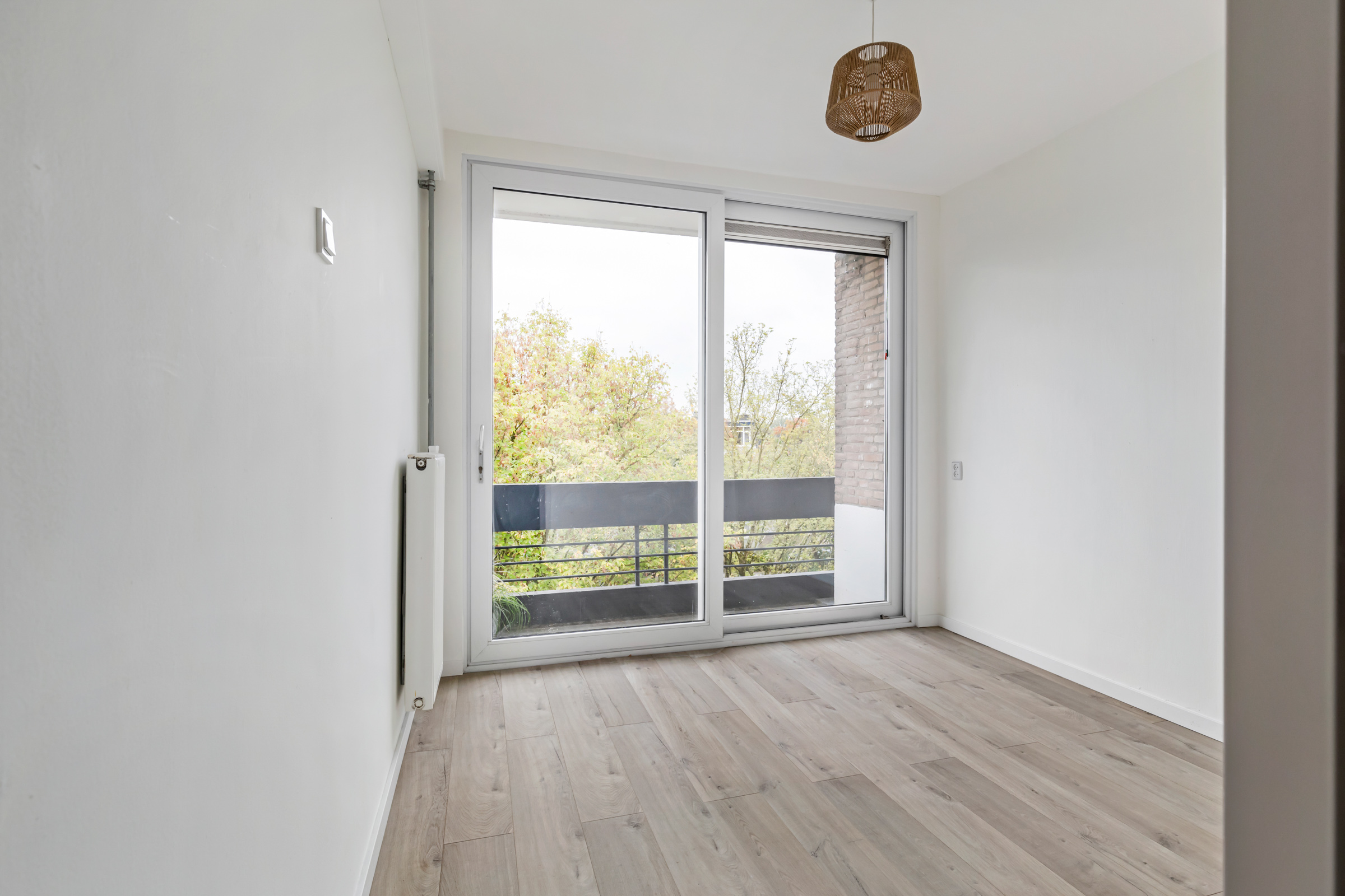Ruime doorzonwoonkamer (ca. 30m²) met veel licht, inbouwkast en toegang tot het balkon aan de achterzijde.