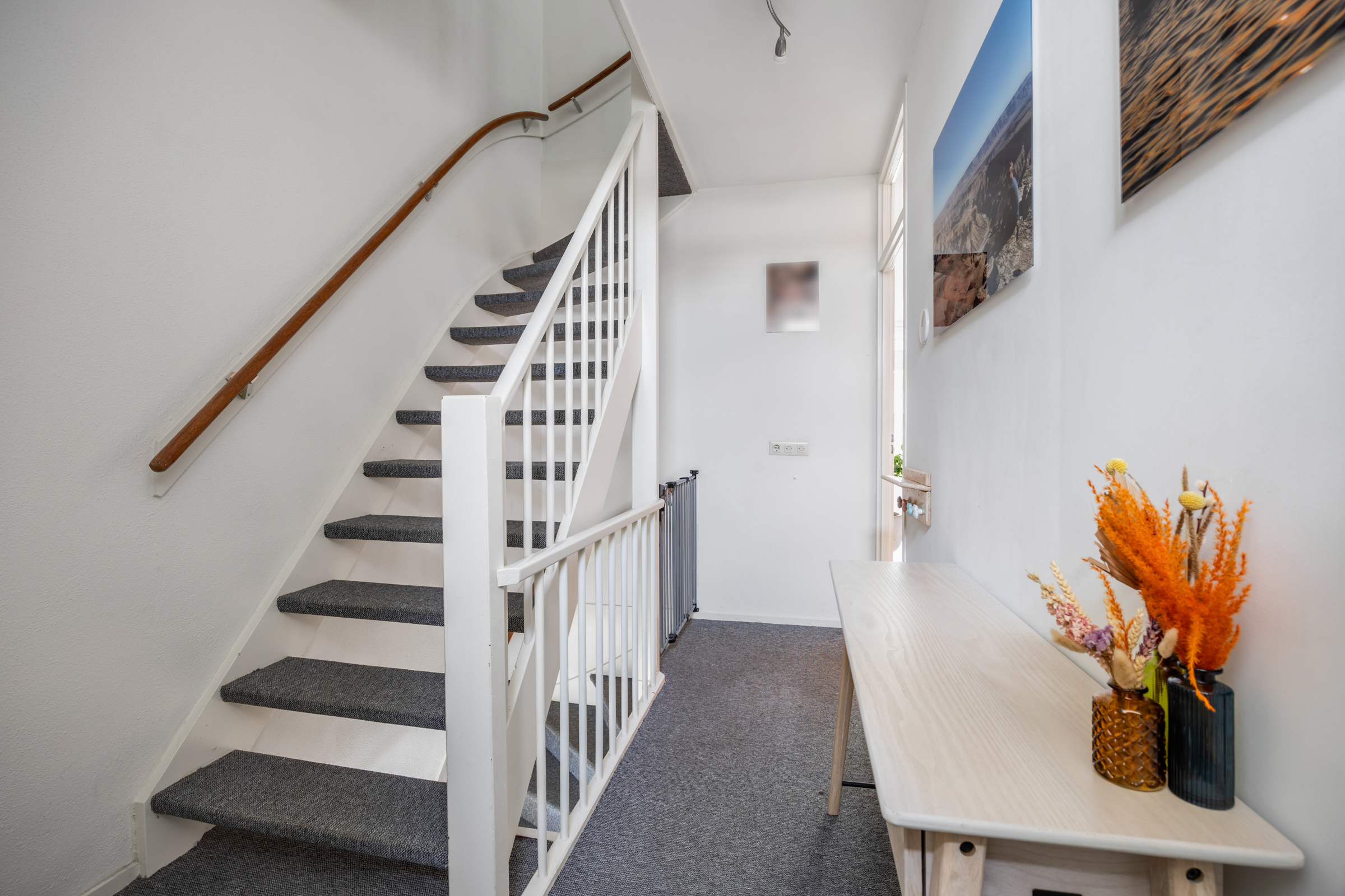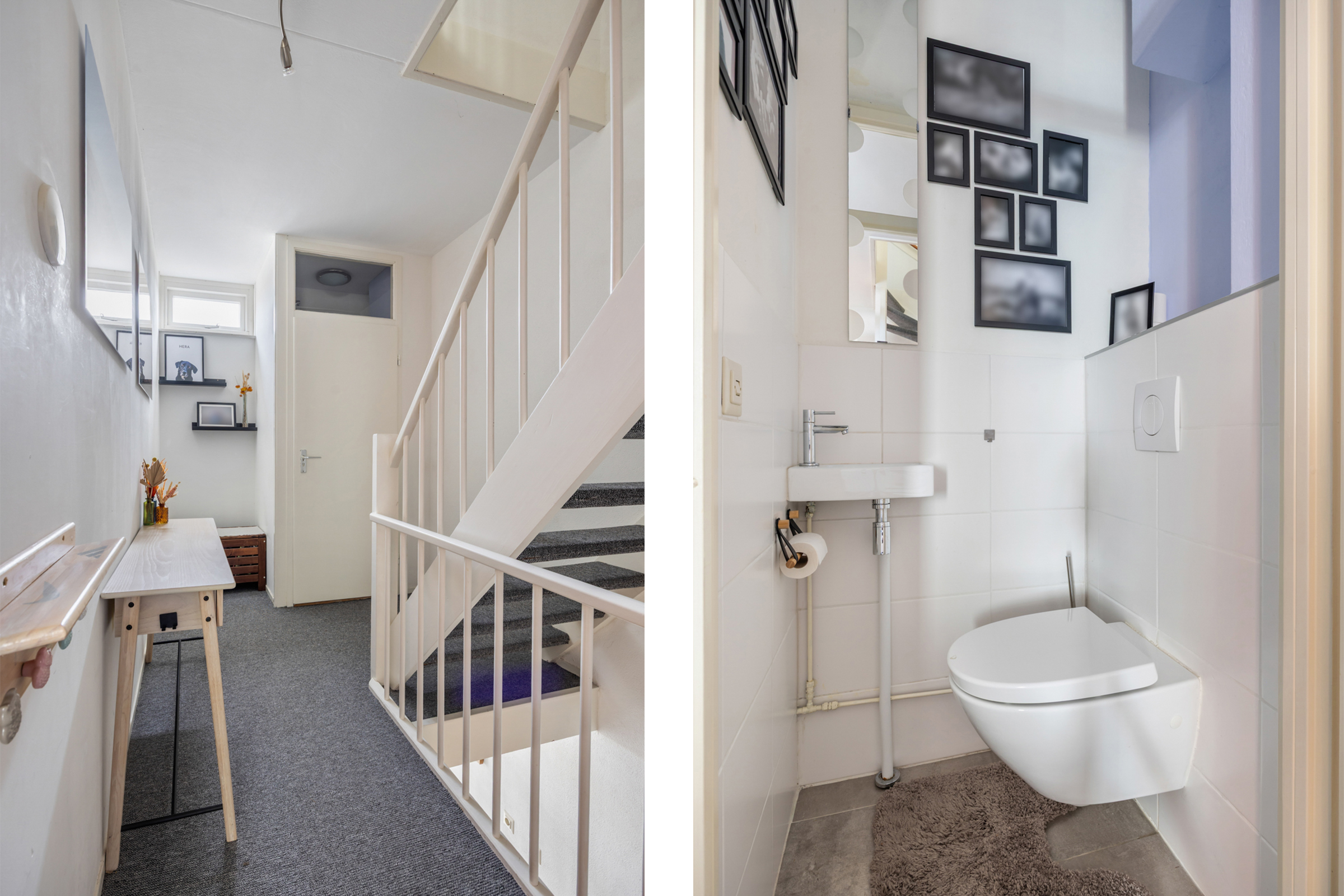 De overloop biedt toegang tot de moderne toiletruimte, woonkamer en trapopgang naar de tweede verdieping.