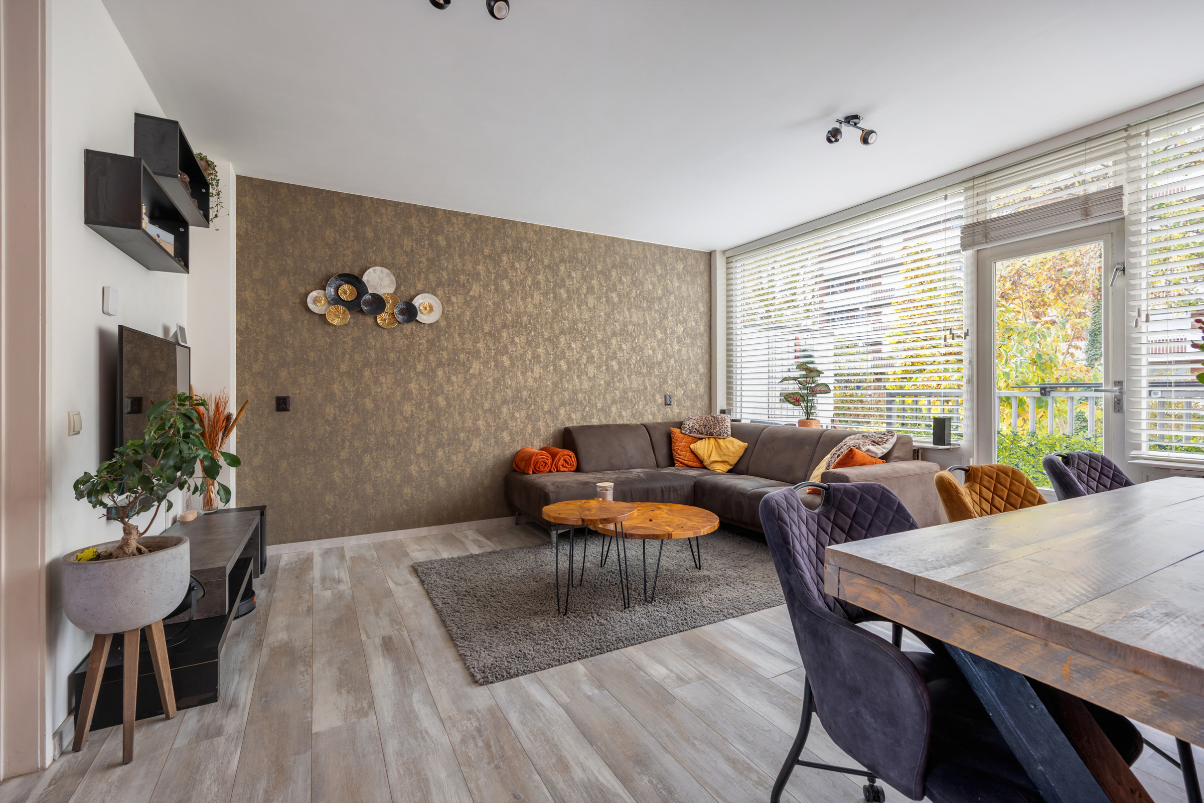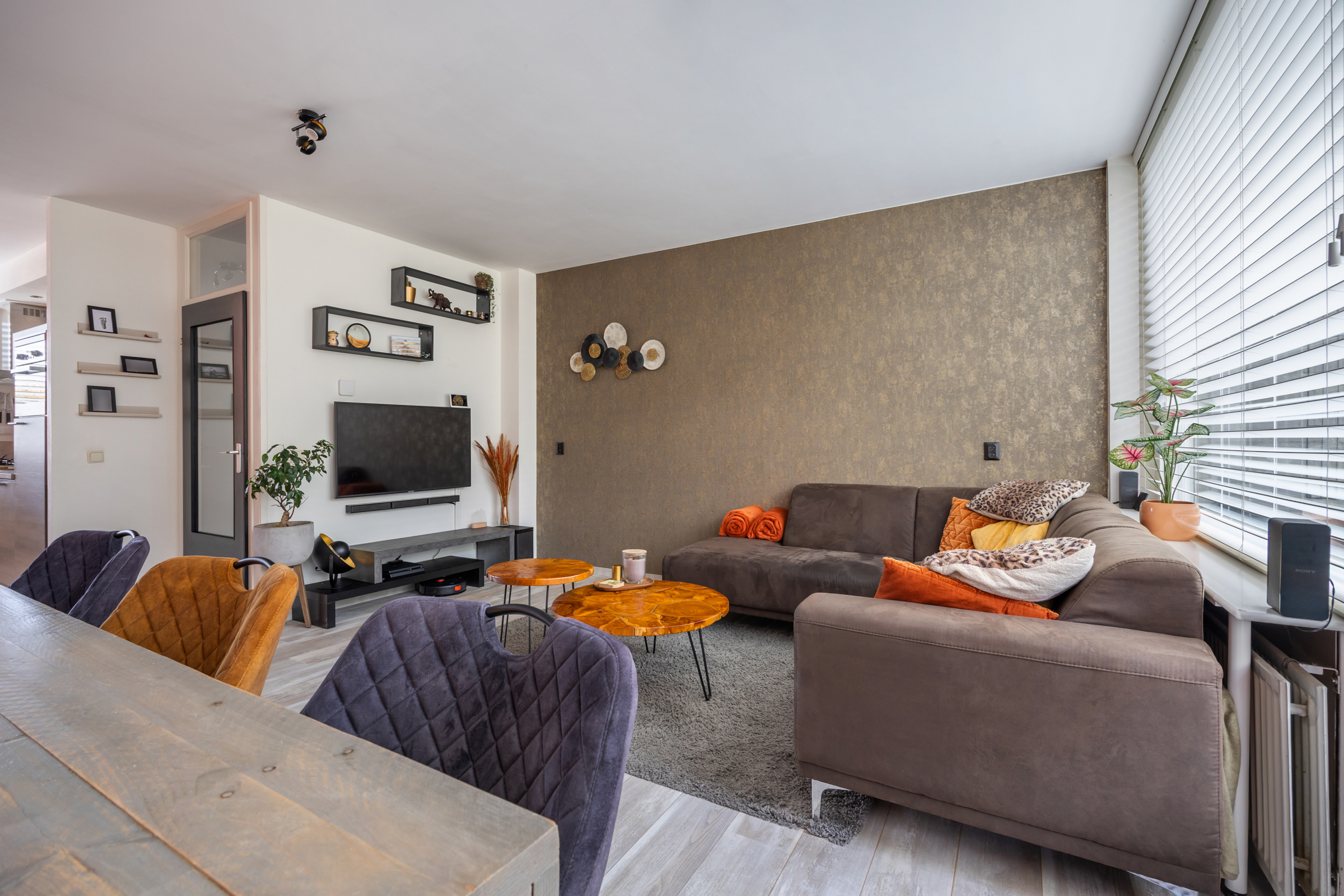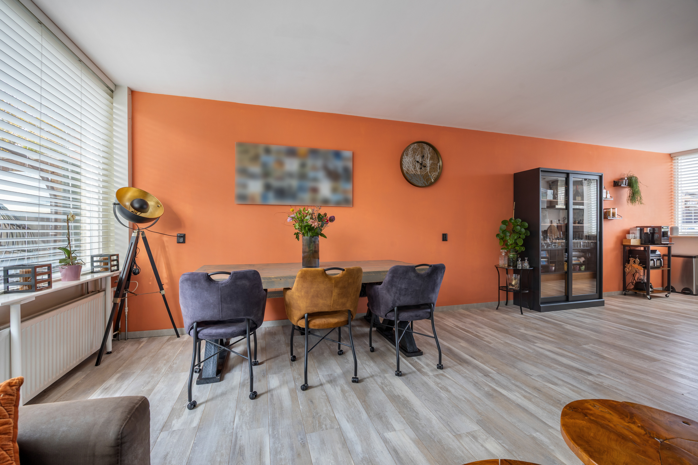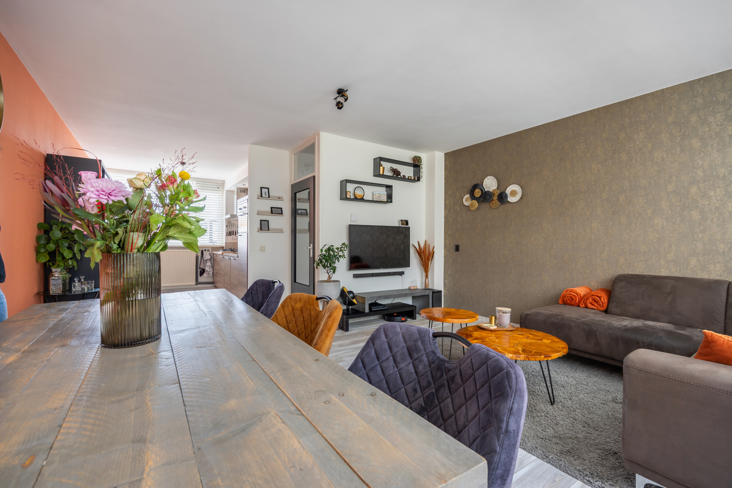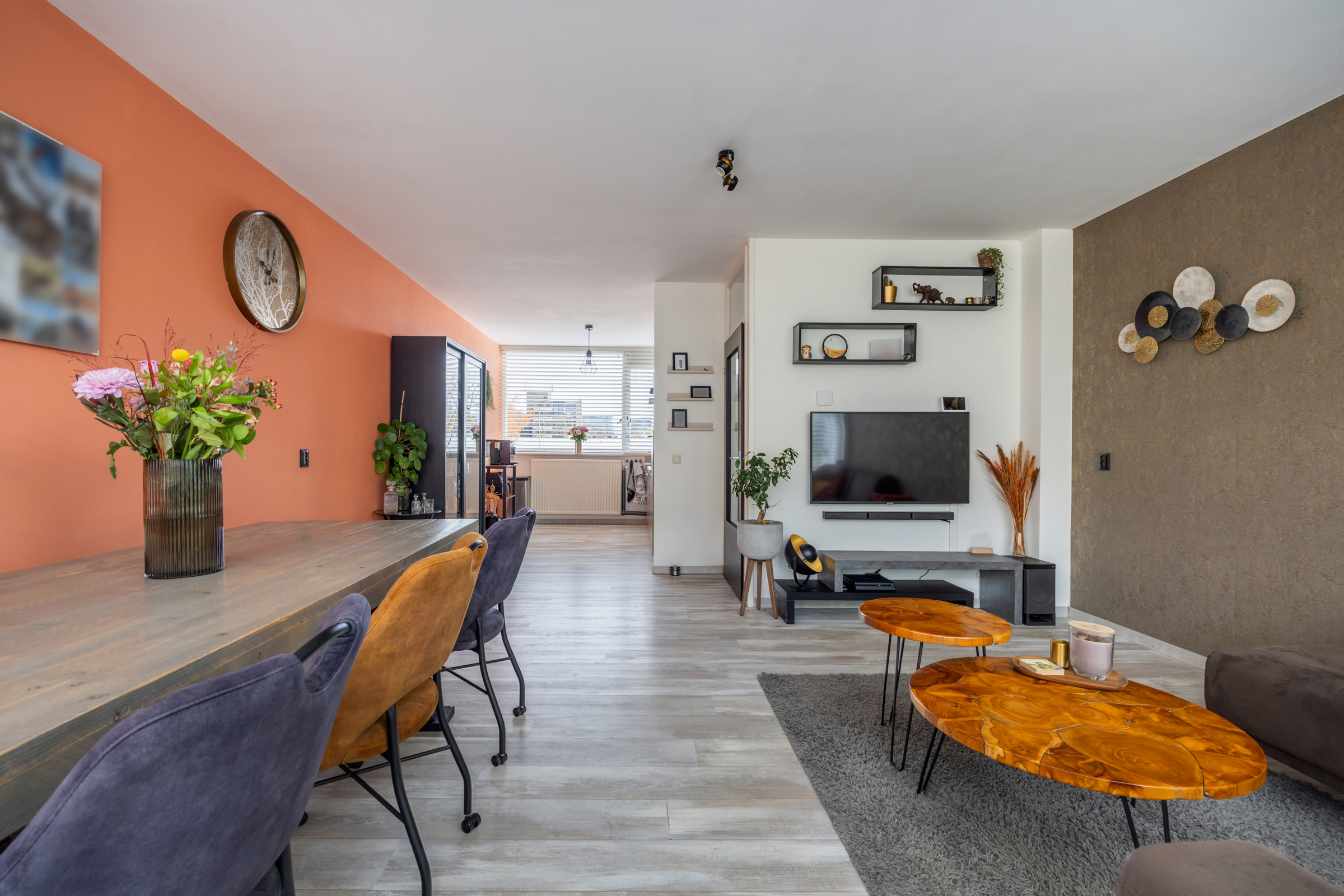 De lichte, ruime woonkamer is een heerlijke plek om te ontspannen. Dankzij de grote raampartijen, nette laminaatvloer en gestuukte afwerking geniet je hier van een stijlvolle en sfeervolle leefruimte. Via de loopdeur stap je het brede balkon op, gelegen op het zonnige zuidwesten — perfect voor een borrel in de avondzon!