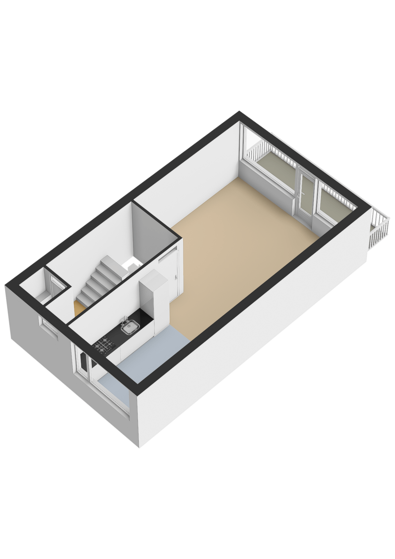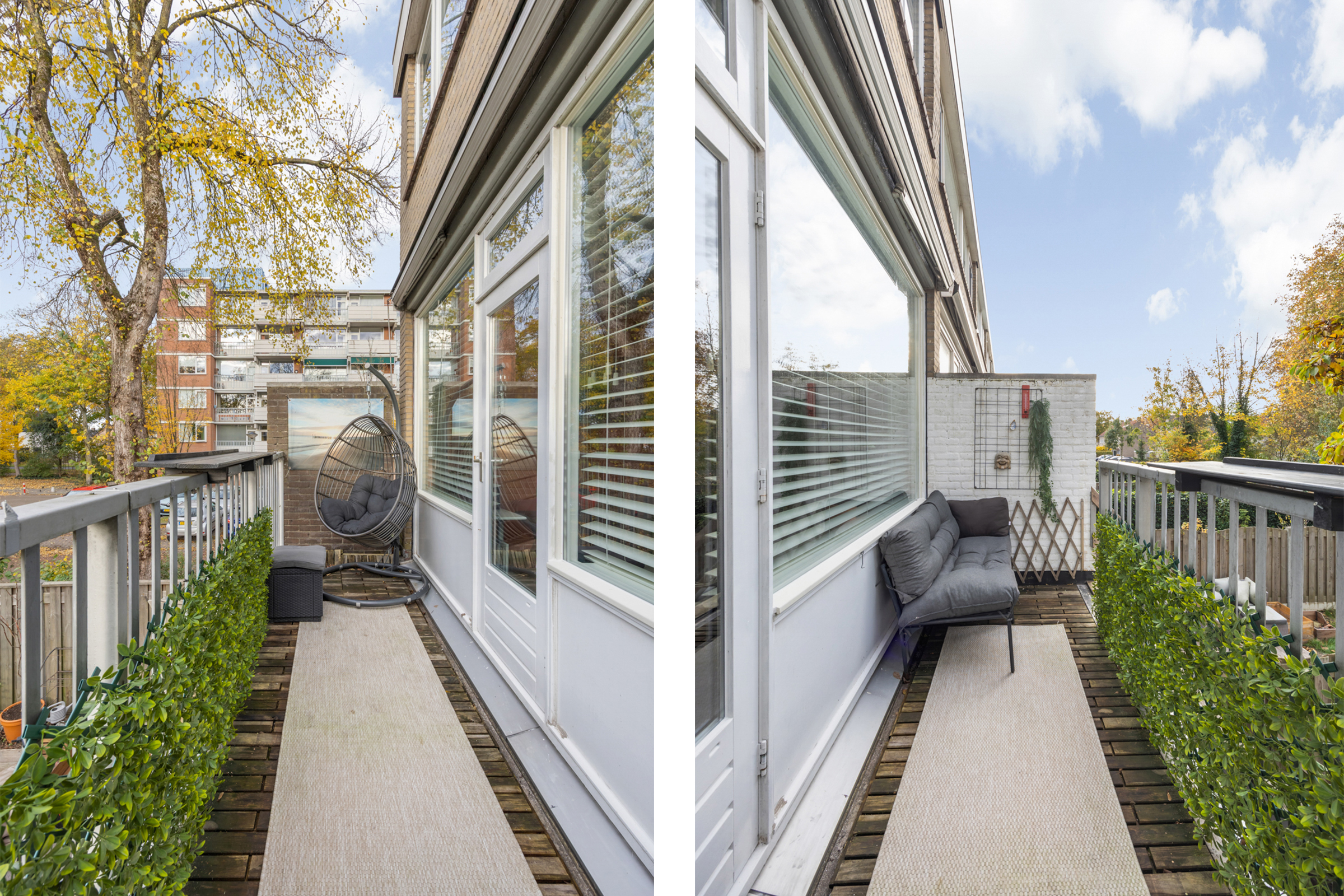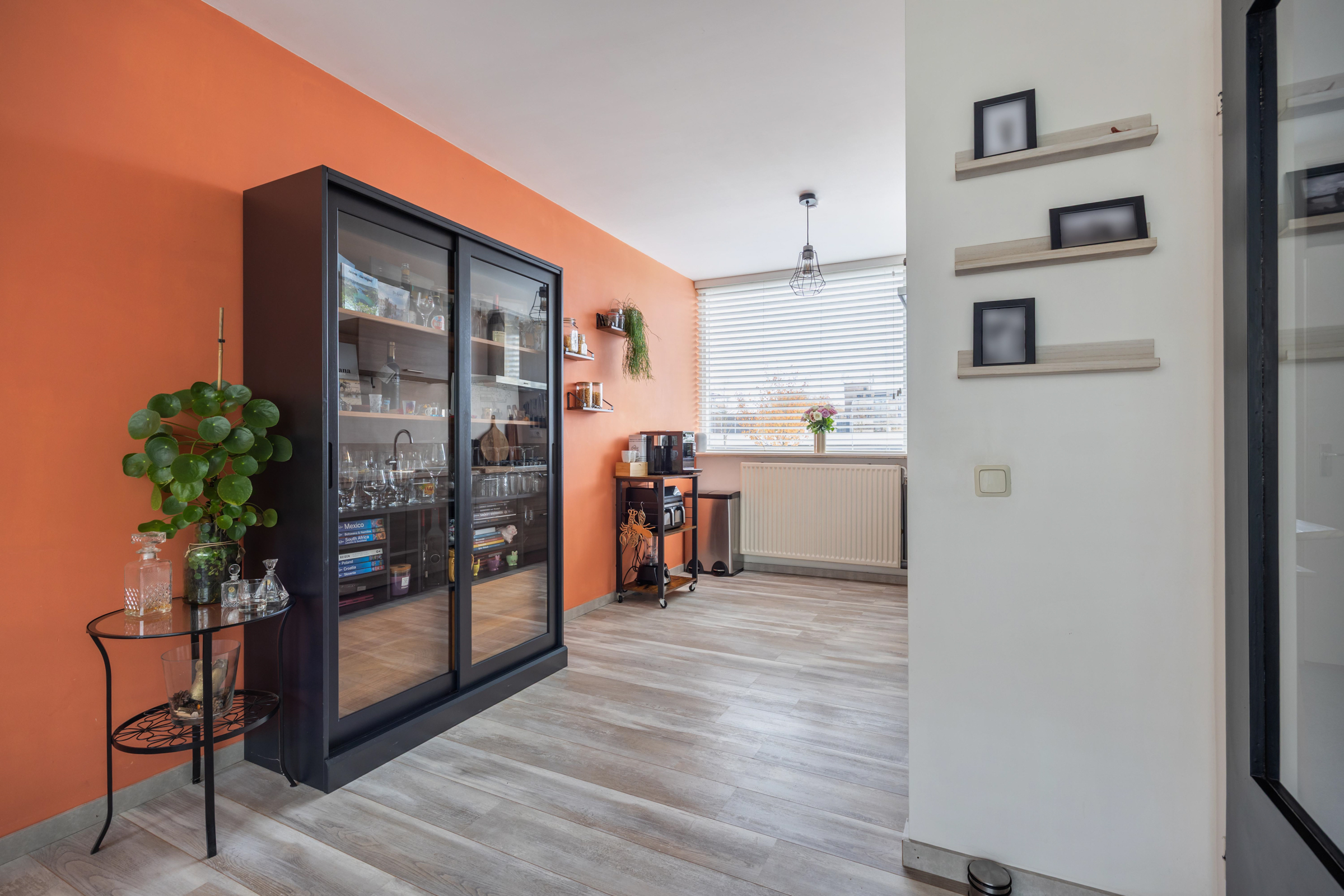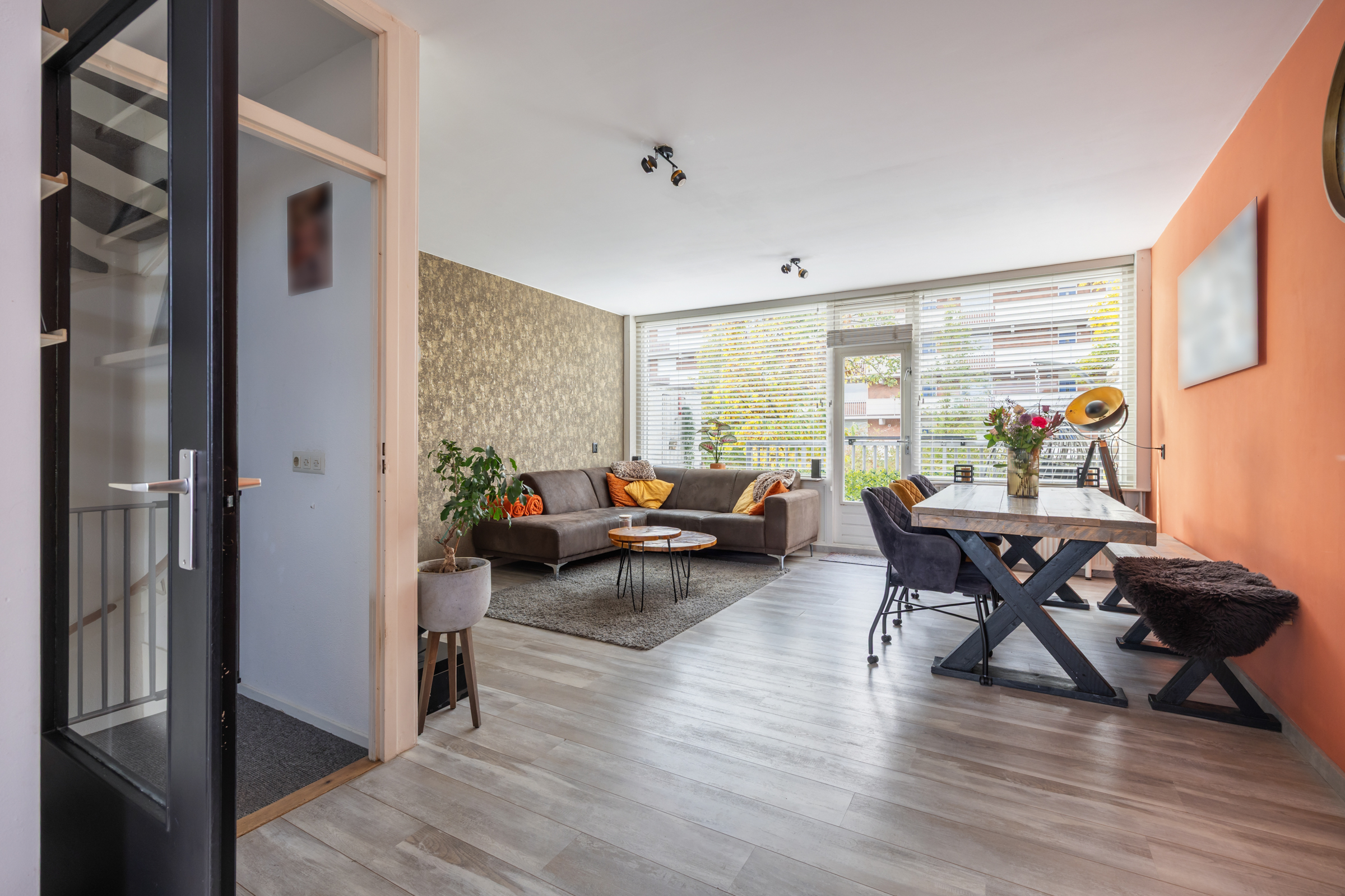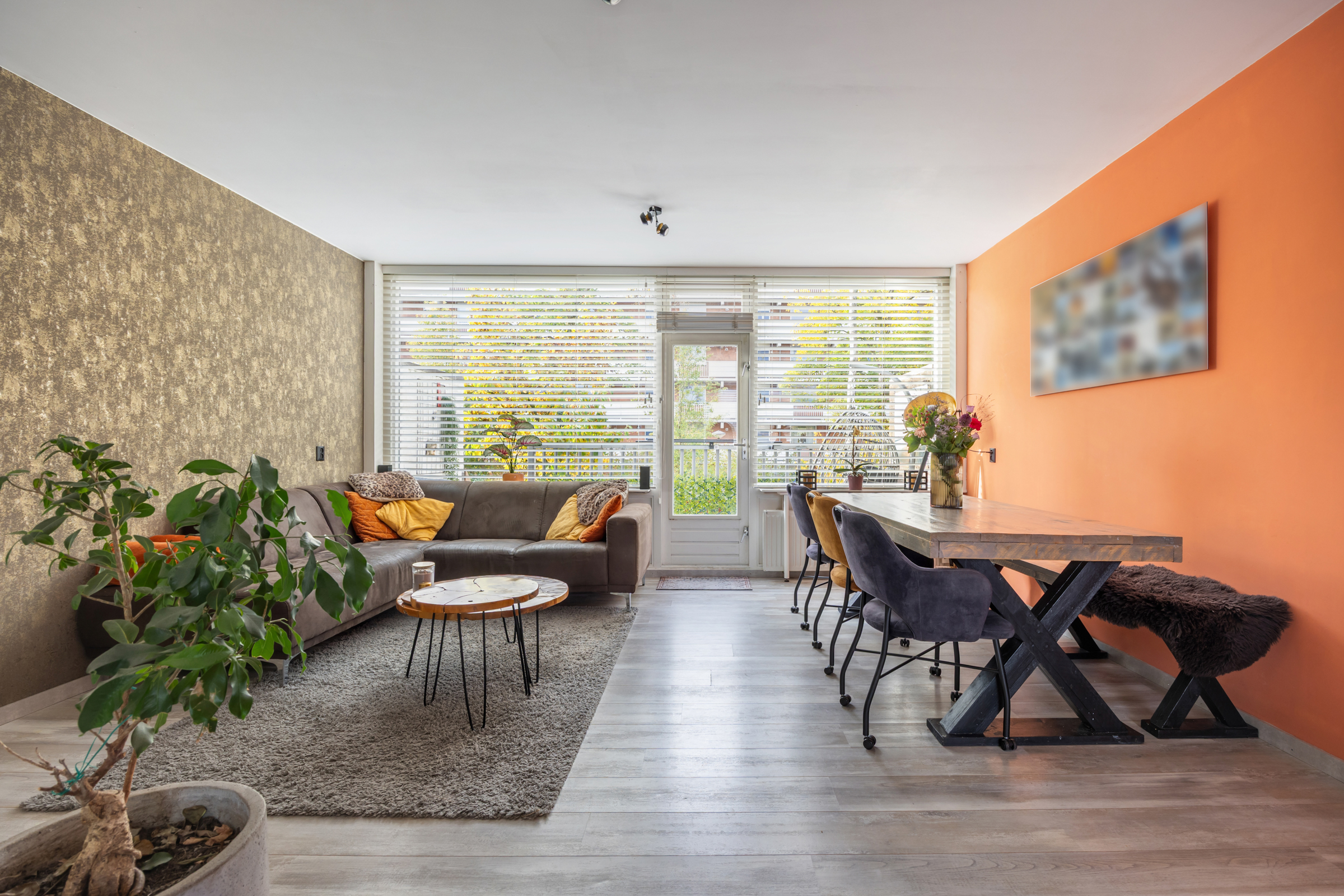De lichte, ruime woonkamer is een heerlijke plek om te ontspannen. Dankzij de grote raampartijen, nette laminaatvloer en gestuukte afwerking geniet je hier van een stijlvolle en sfeervolle leefruimte. Via de loopdeur stap je het brede balkon op, gelegen op het zonnige zuidwesten — perfect voor een borrel in de avondzon!