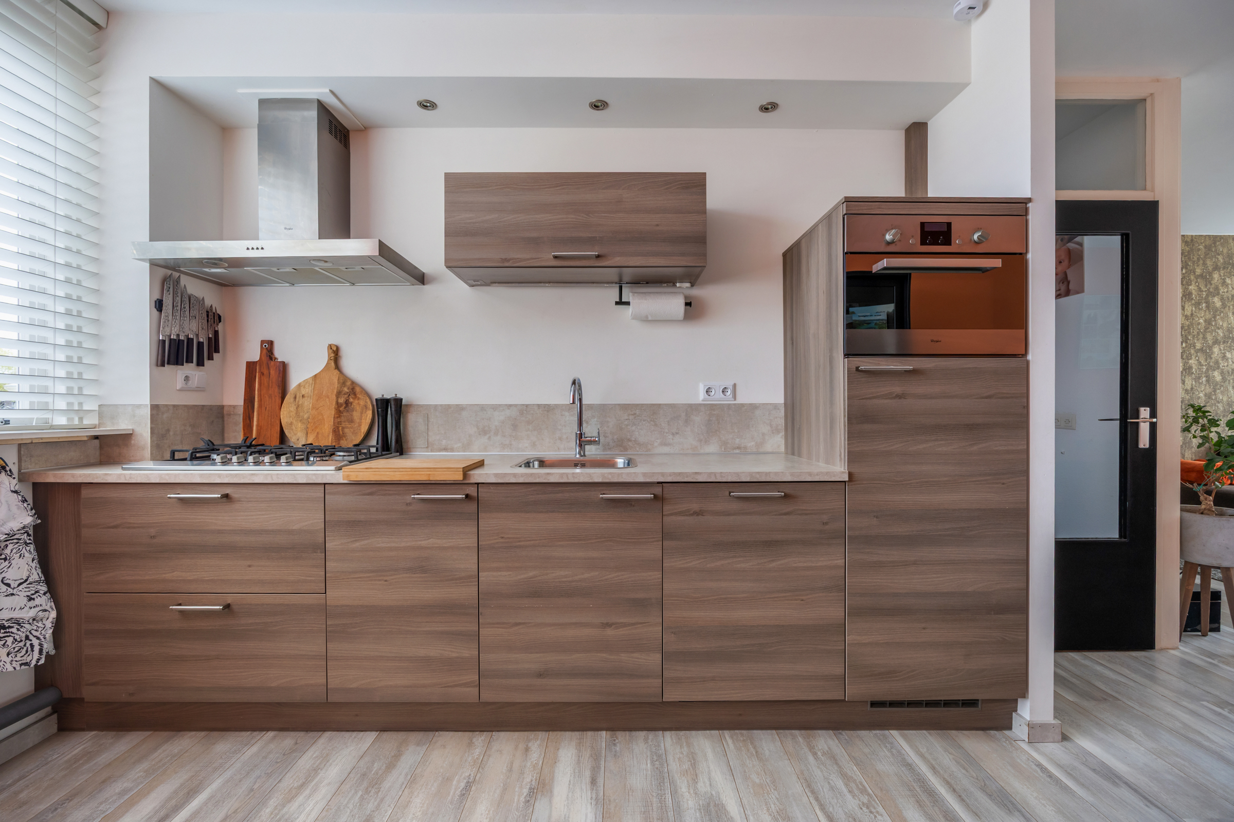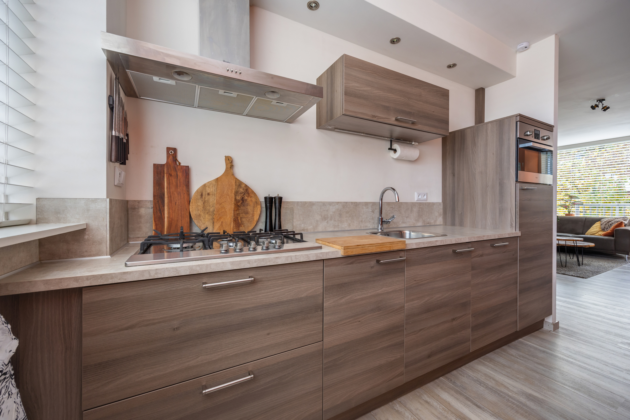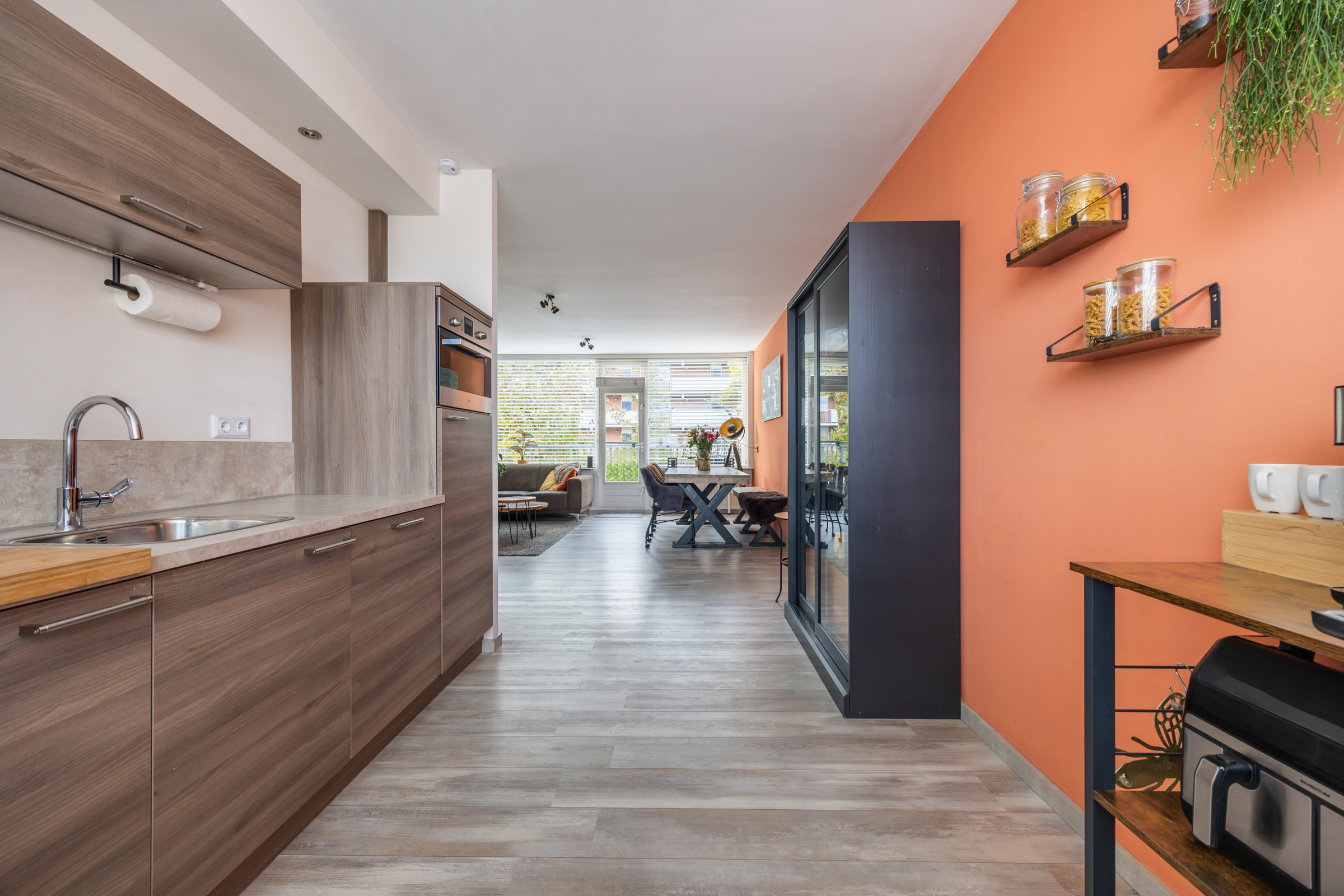 De open keuken (2017) bevindt zich aan de voorzijde en is uitgevoerd in een rechte opstelling met kunststof werkblad en diverse inbouwapparatuur: koelkast met vrieslade, 5-pits gasfornuis, afzuigkap, rvs-spoelbak, combi oven/magnetron en vaatwasser.