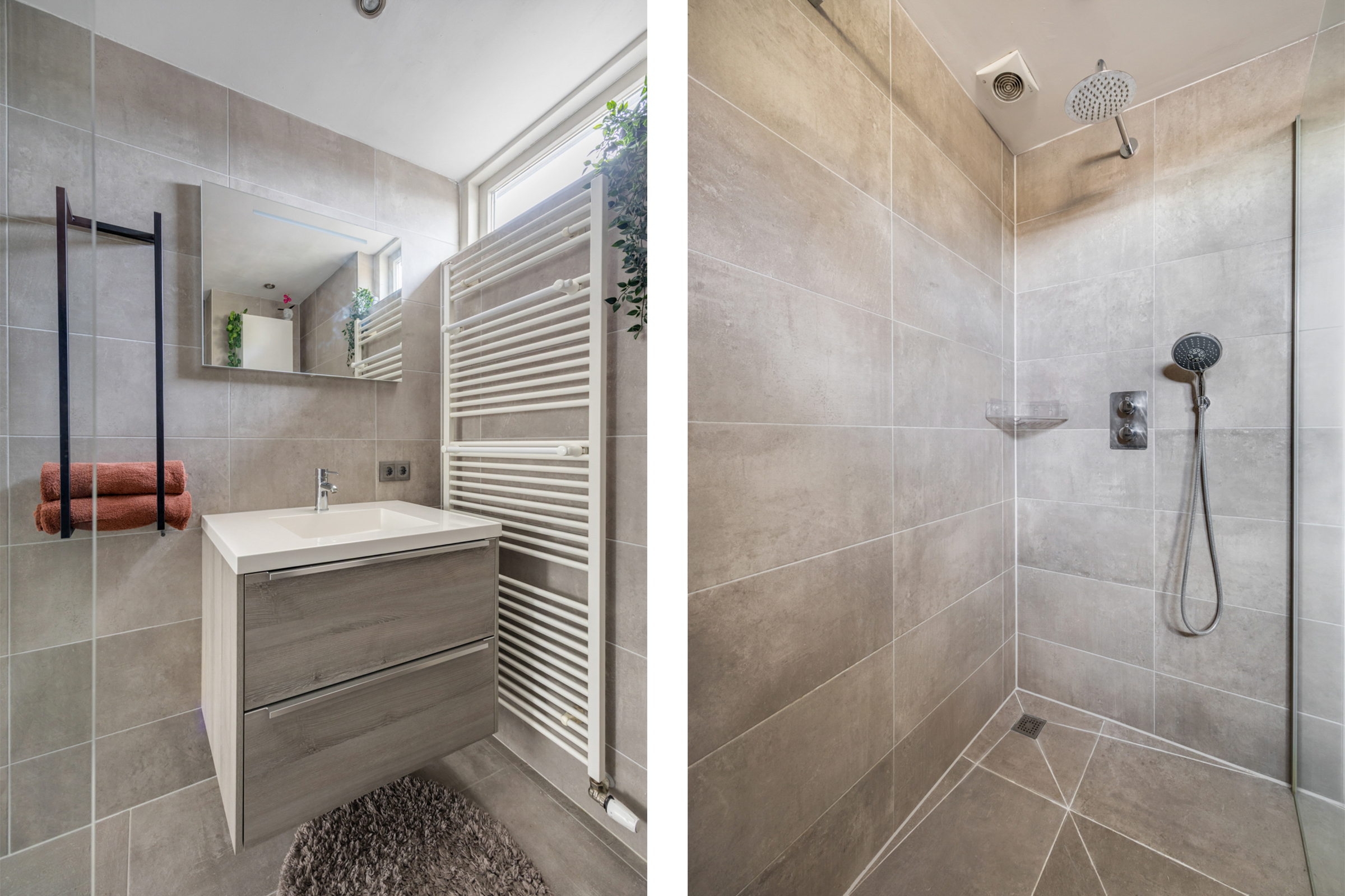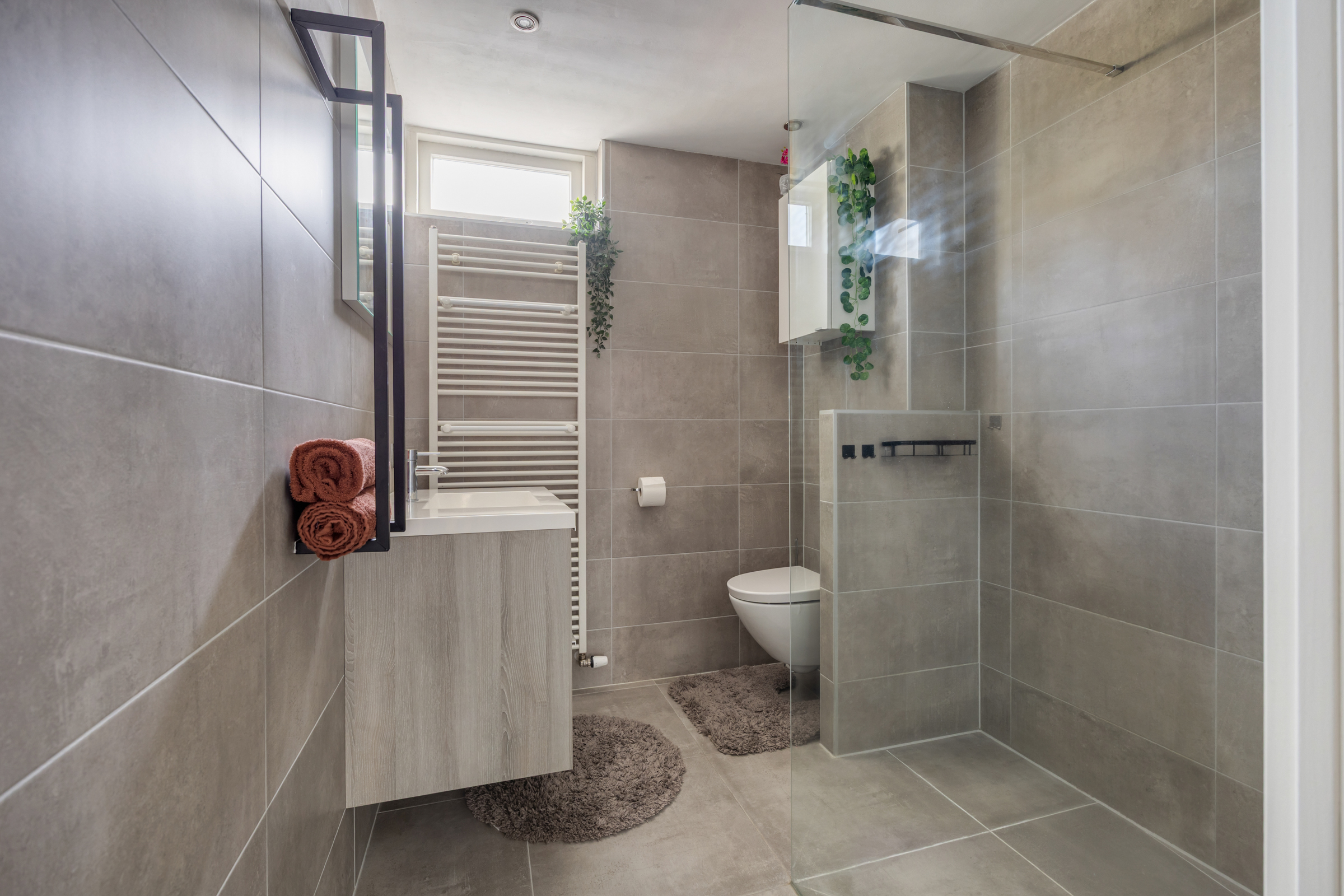 De moderne, volledig betegelde badkamer (2017) is voorzien van een ruime inloopdouche met inbouw thermostaatkraan, regen- en handdouche, vrijhangend toilet, wastafelmeubel, designradiator en mechanische ventilatie.