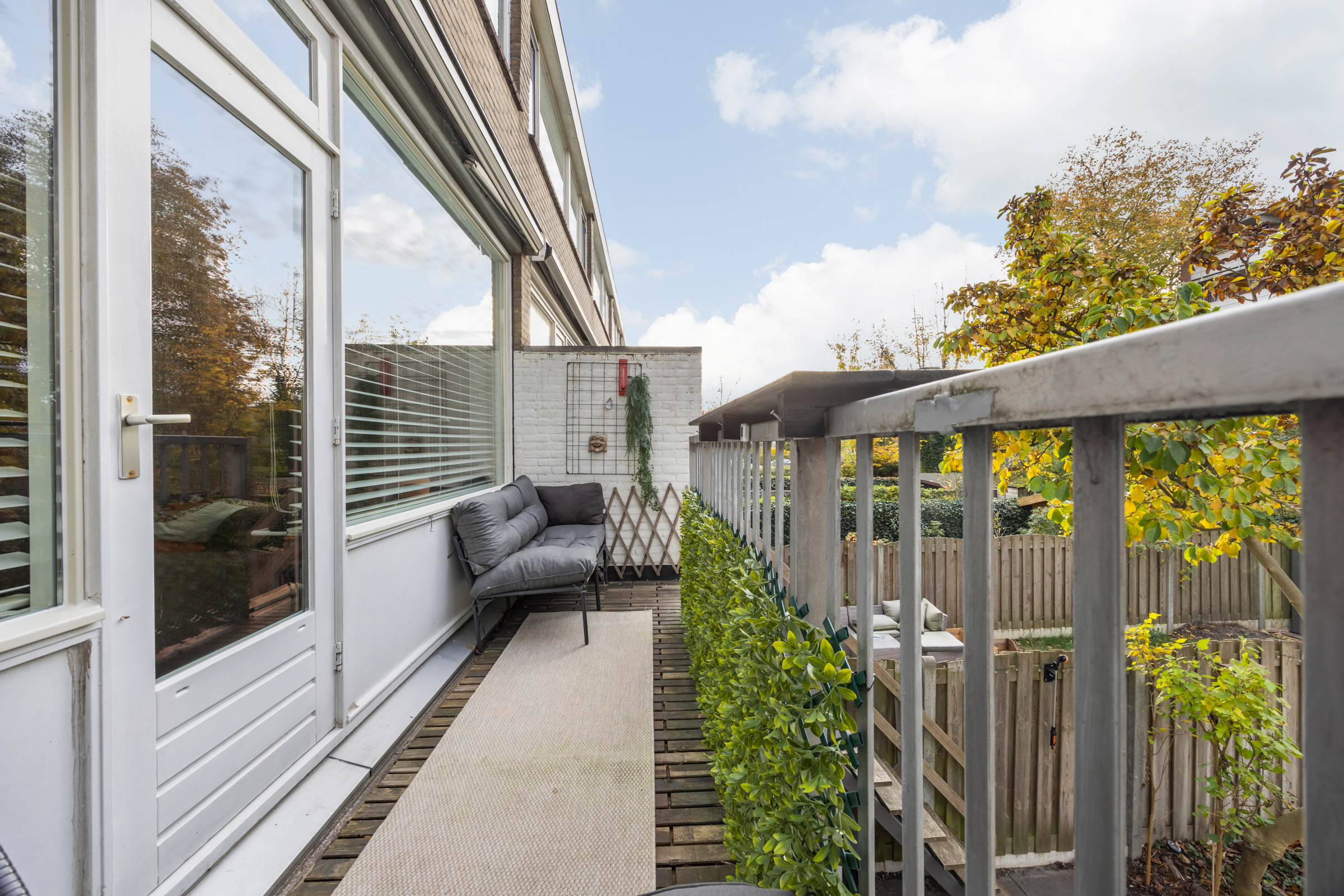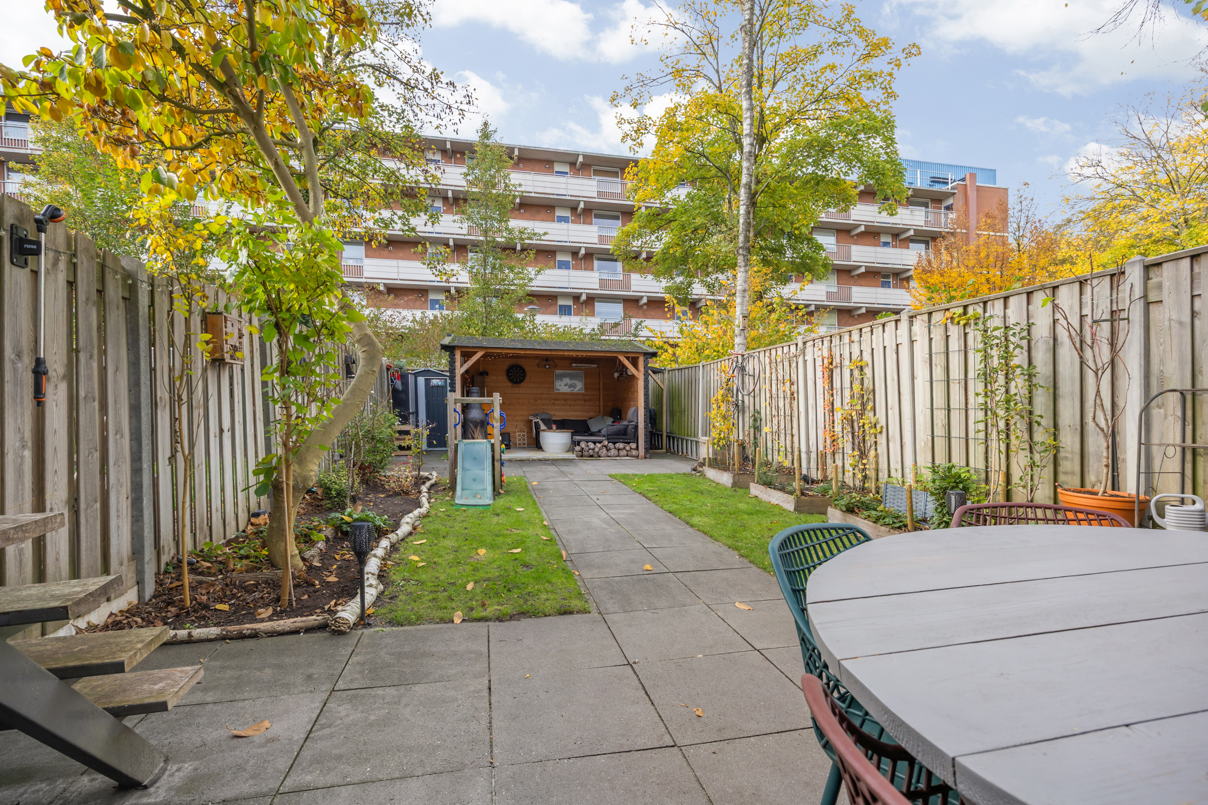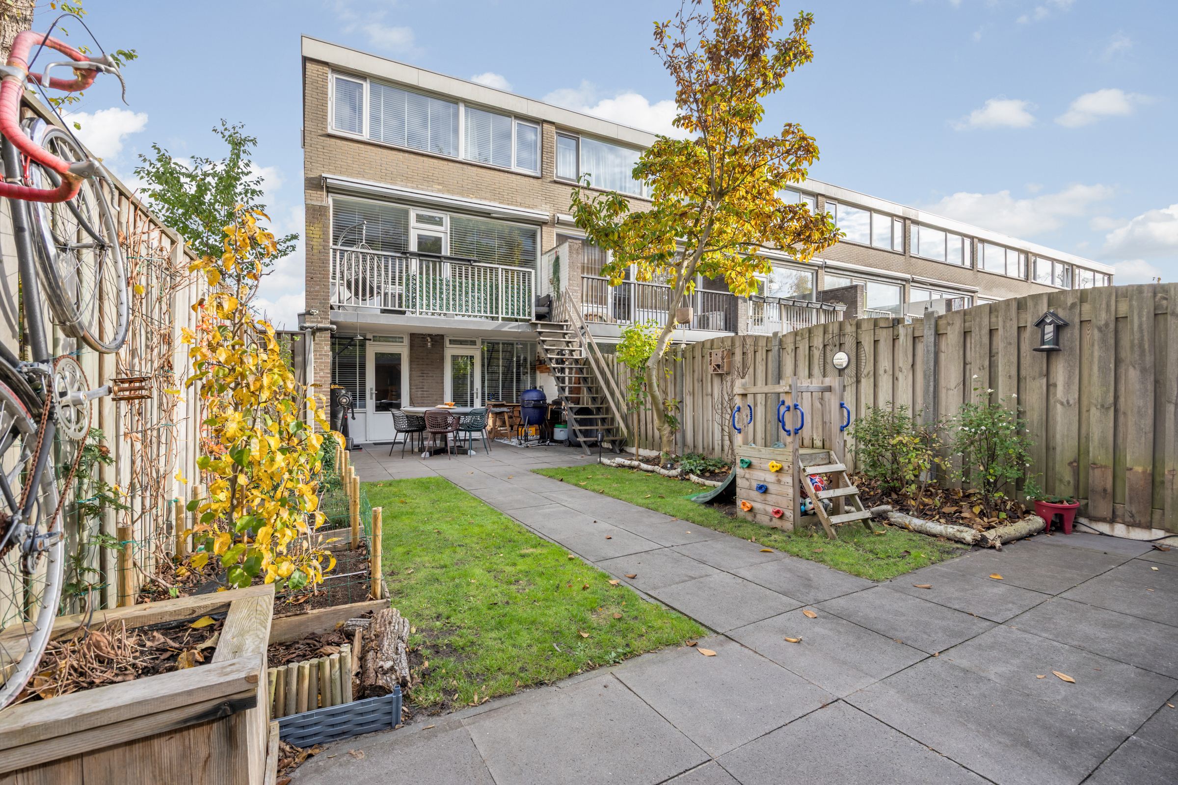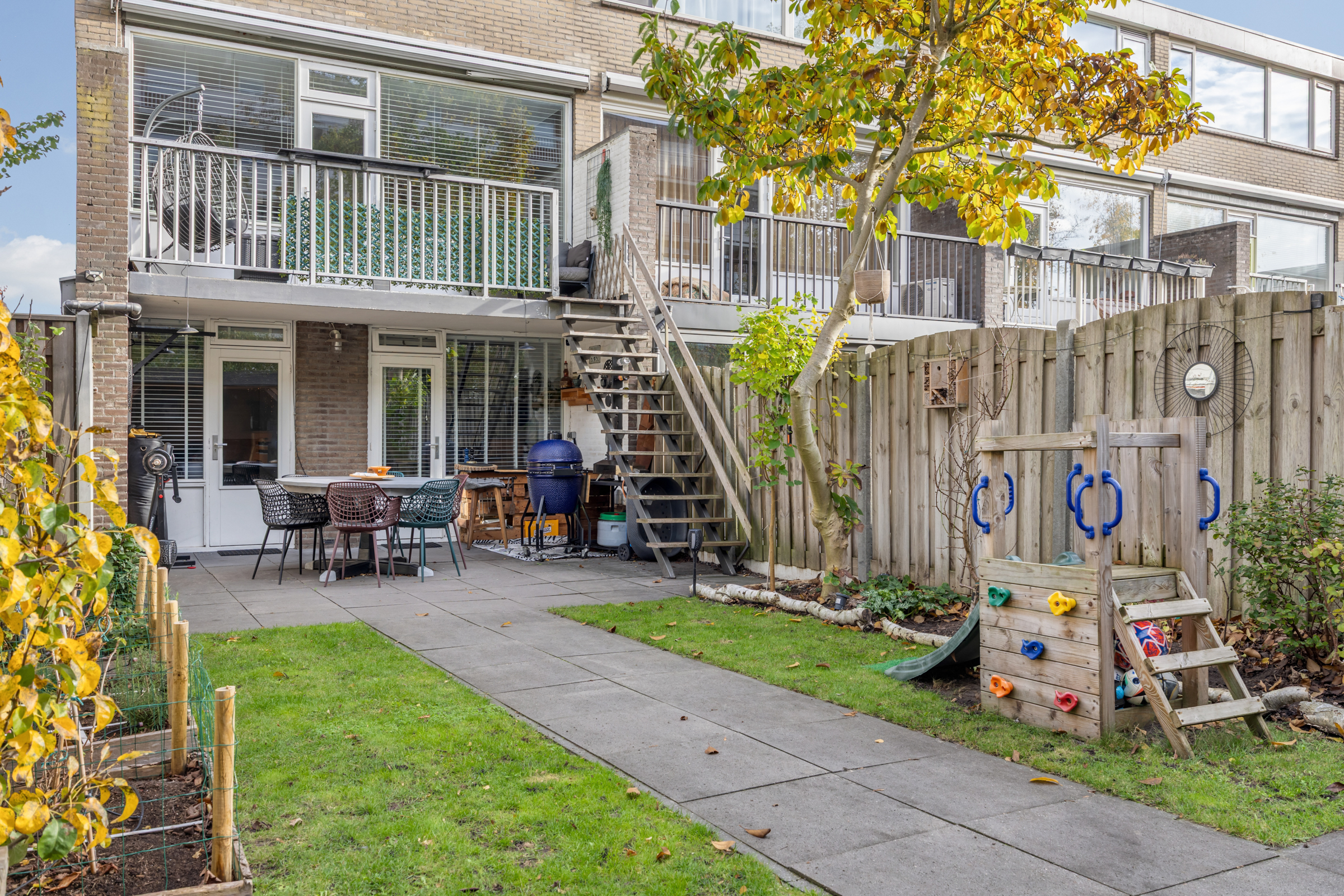 De circa 16 meter diepe achtertuin is fraai aangelegd en gunstig gelegen op het zuidwesten. Hier geniet je de hele dag van de zon! De tuin beschikt over twee terrassen, een verzorgd gazon, borders met vaste beplanting, een vaste trap naar het balkon op de eerste verdieping en een sfeervolle houten overkapping (2022) waar het heerlijk vertoeven is. Via de poort aan de zijkant is de tuin ook achterom bereikbaar.
