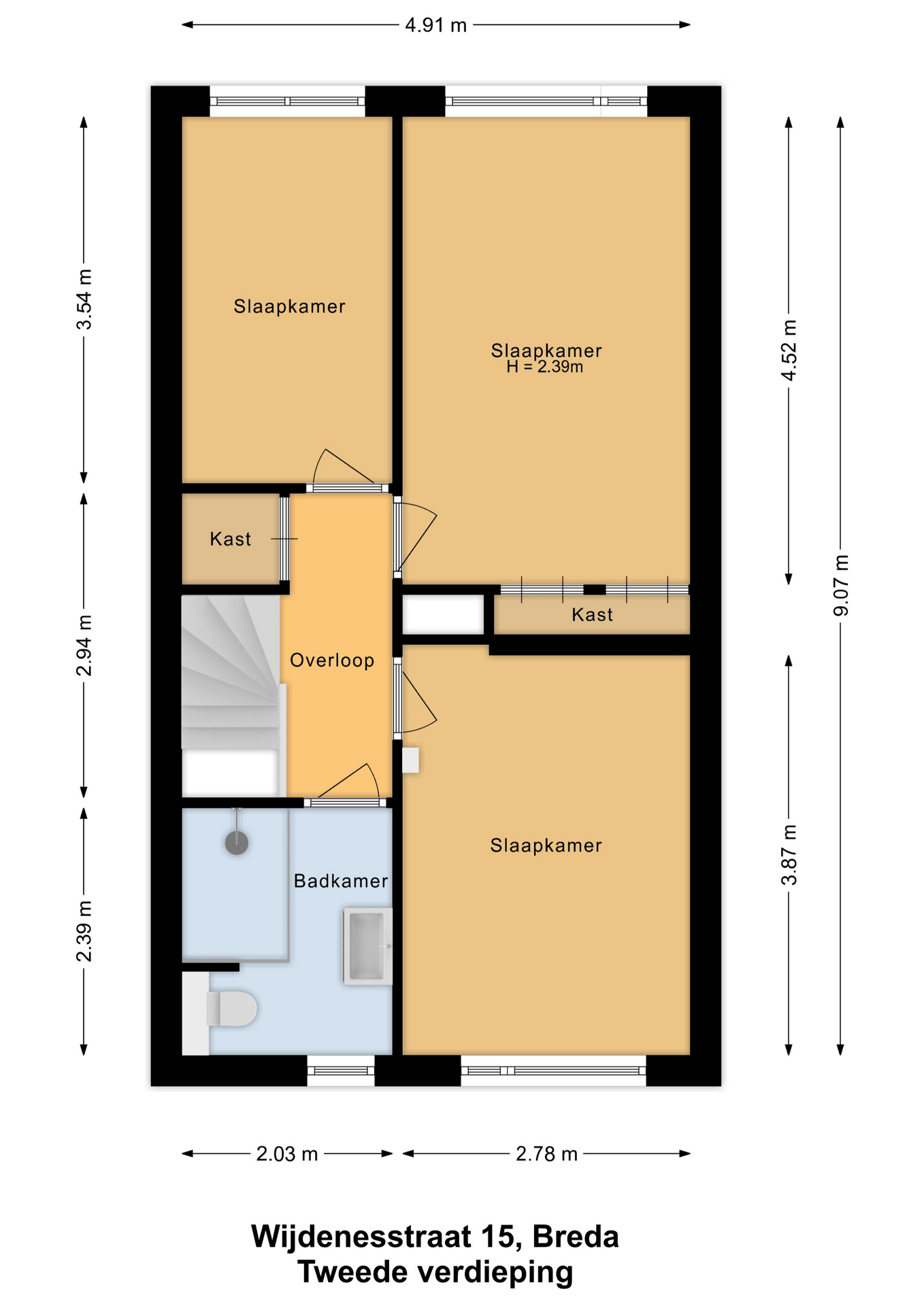 Slaapkamer II (ca. 4.52 x 2.78 m) – eveneens aan de achterzijde, met airconditioning en een ruime inbouwkast.