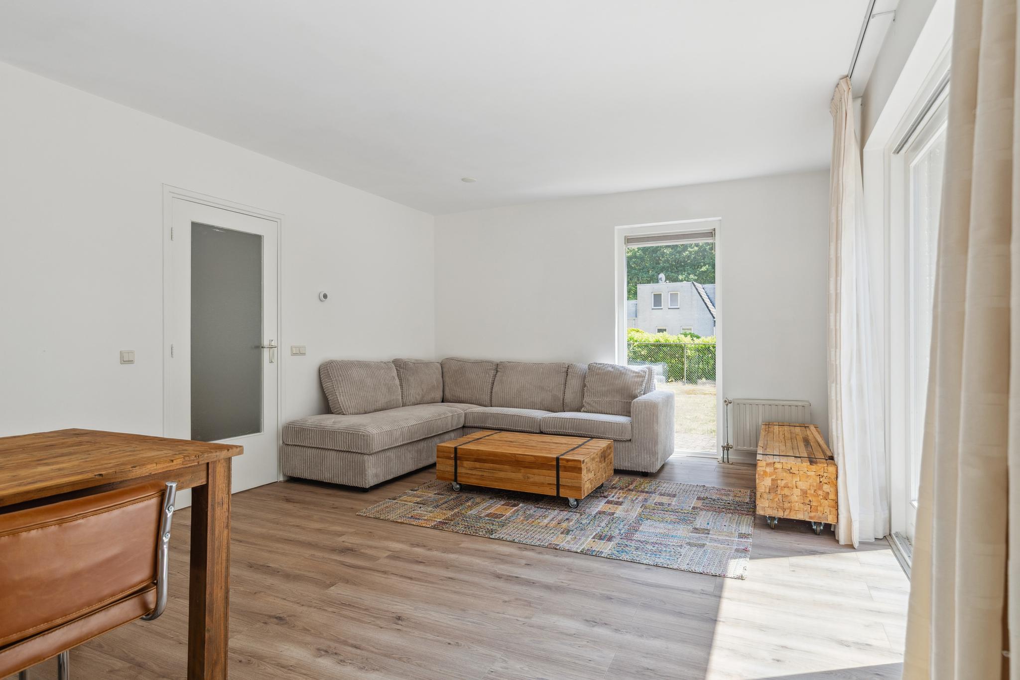 Ruime, heerlijke tuingerichte en zeer lichte living met nette laminaatvloer v.v. vloerverwarming, strak gestuukte wanden en plafond, veel raampartijen en een schuifpui naar de privacy biedende bostuin.