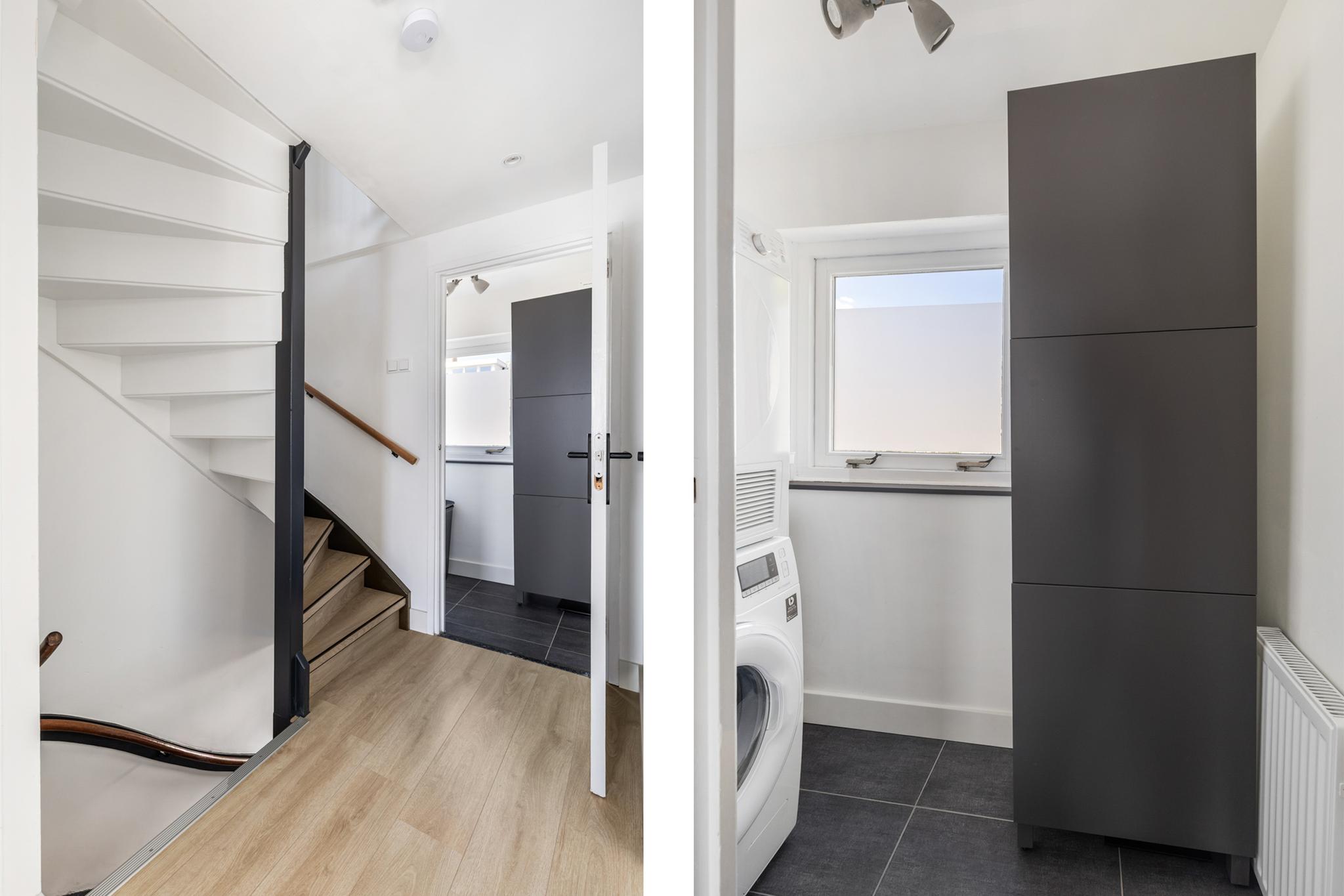 Ruime overloop met vaste trapopgang naar de 2e verdieping en toegang tot 2 ruime slaapkamers, moderne badkamer en praktische waskamer.