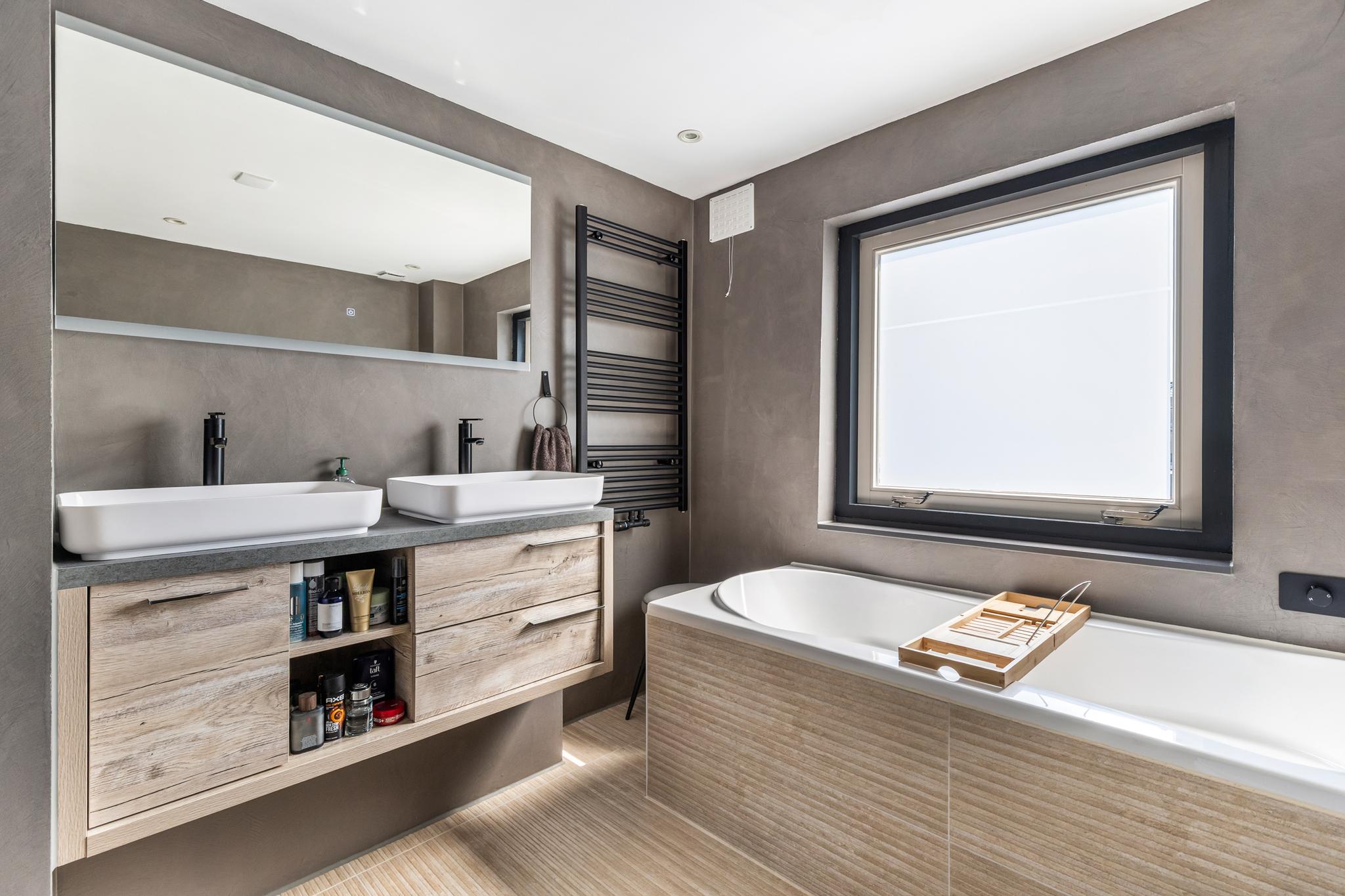 Moderne, luxe badkamer met dubbel wastafelmeubel, elektrische vloerverwarming, designradiator, ligbad met ingebouwde kranen en handdouche, vrijhangend toilet en een heerlijke ruime inloopdouche met regendouche, handdouche met thermostaatkraan. Tevens is de badkamer voorzien van mechanische ventilatie.
