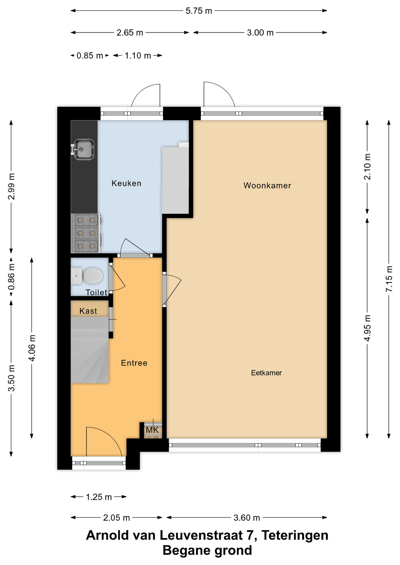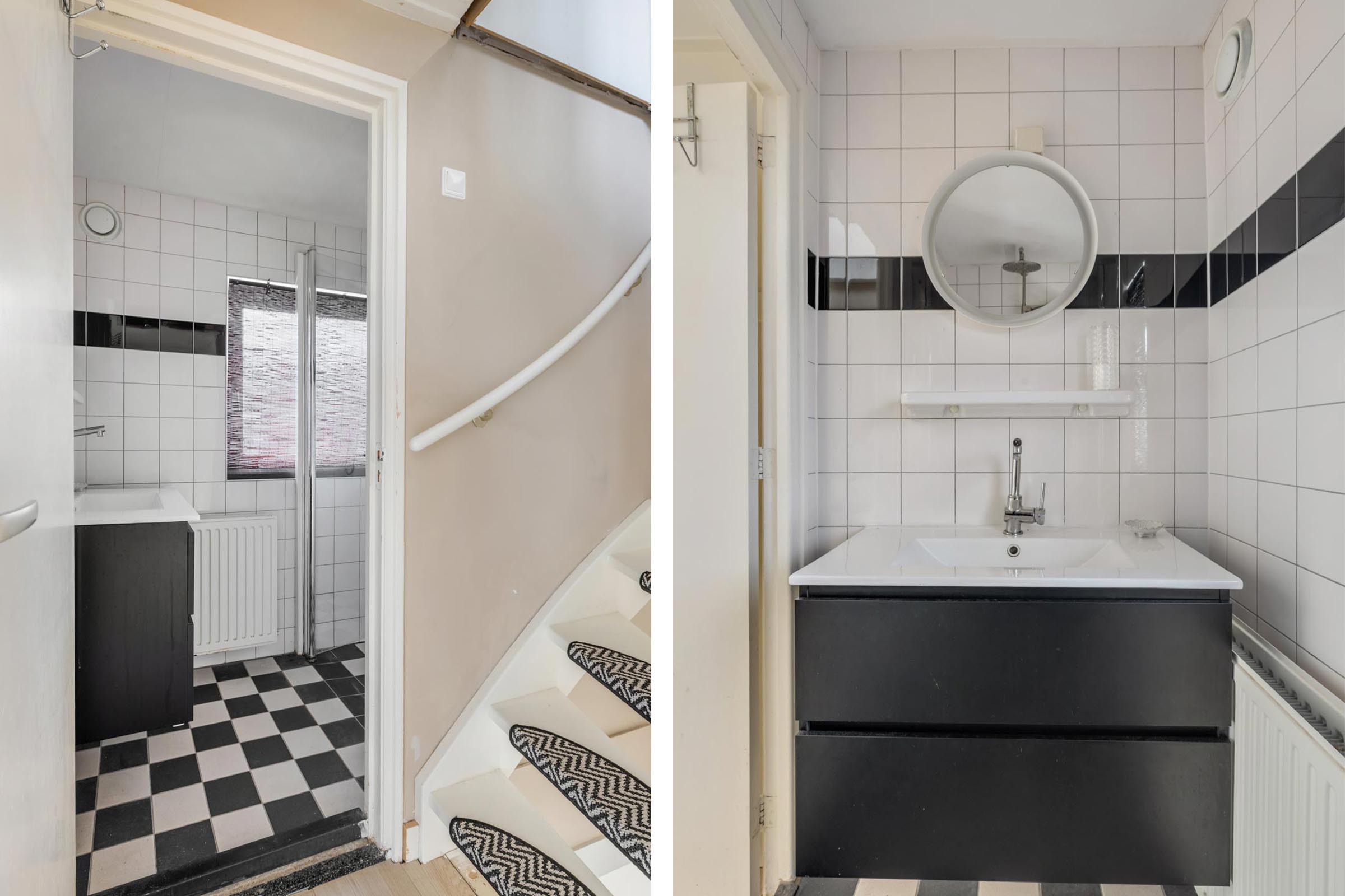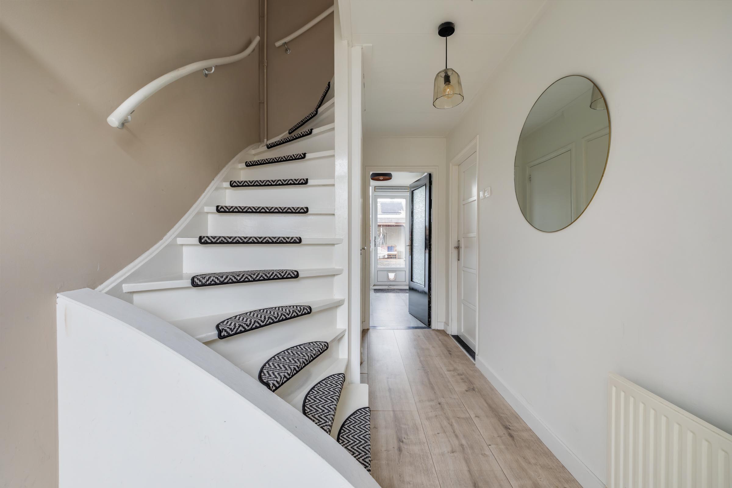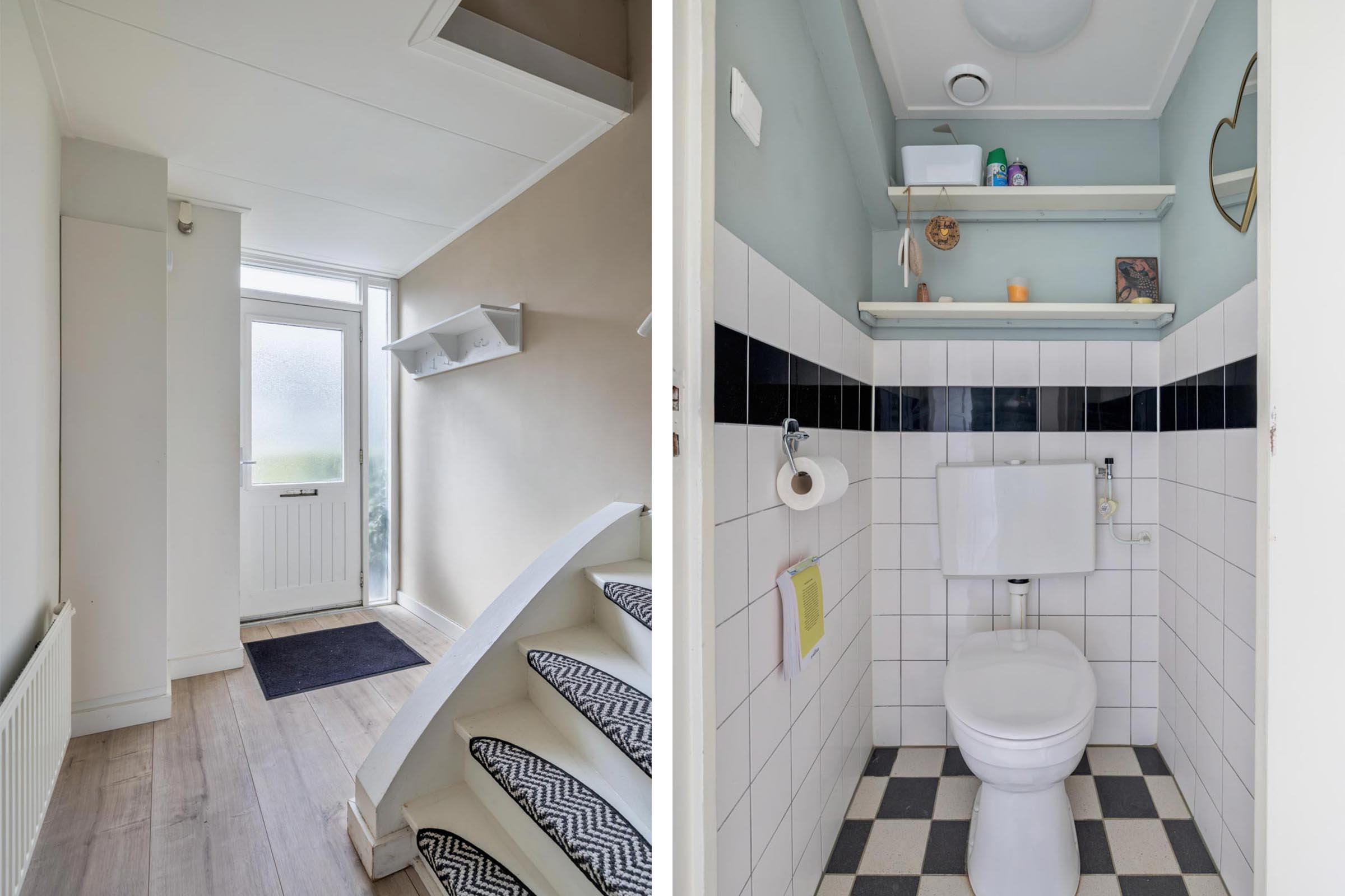 Je komt binnen in de hal met meterkast, trapopgang en een praktische voorraadkast onder de trap. Hier bevindt zich ook de deels betegelde toiletruimte.