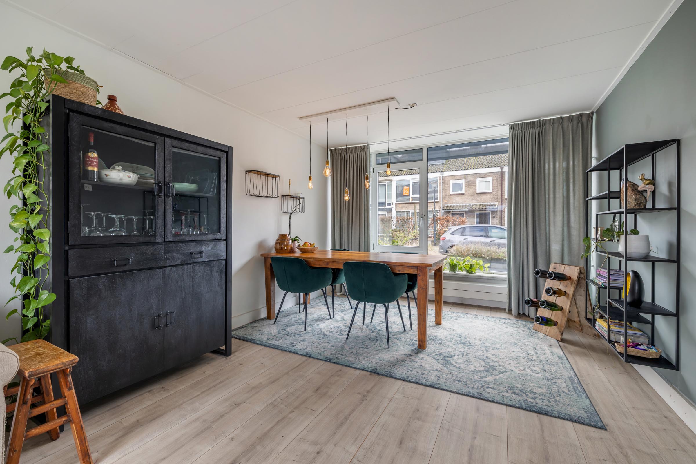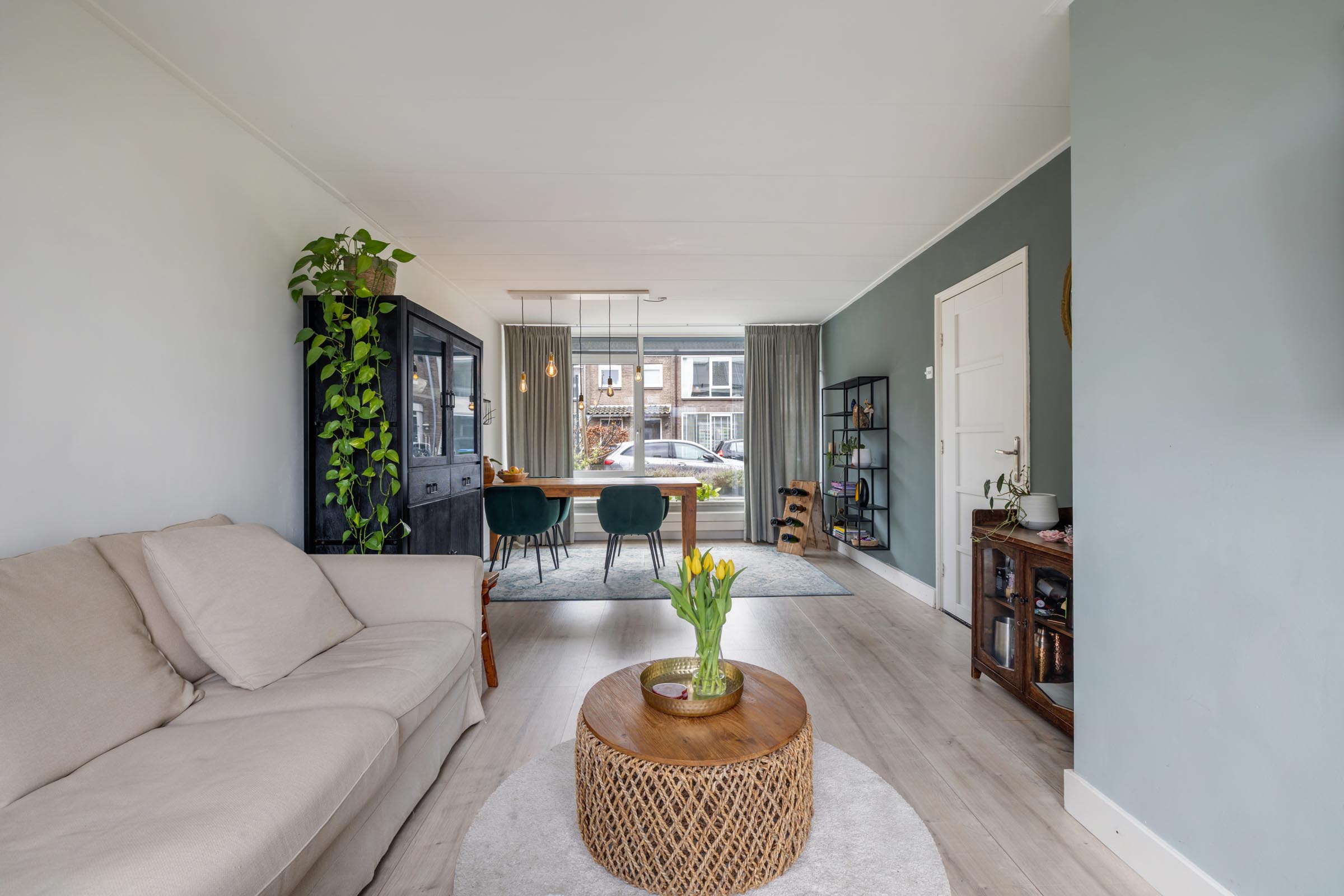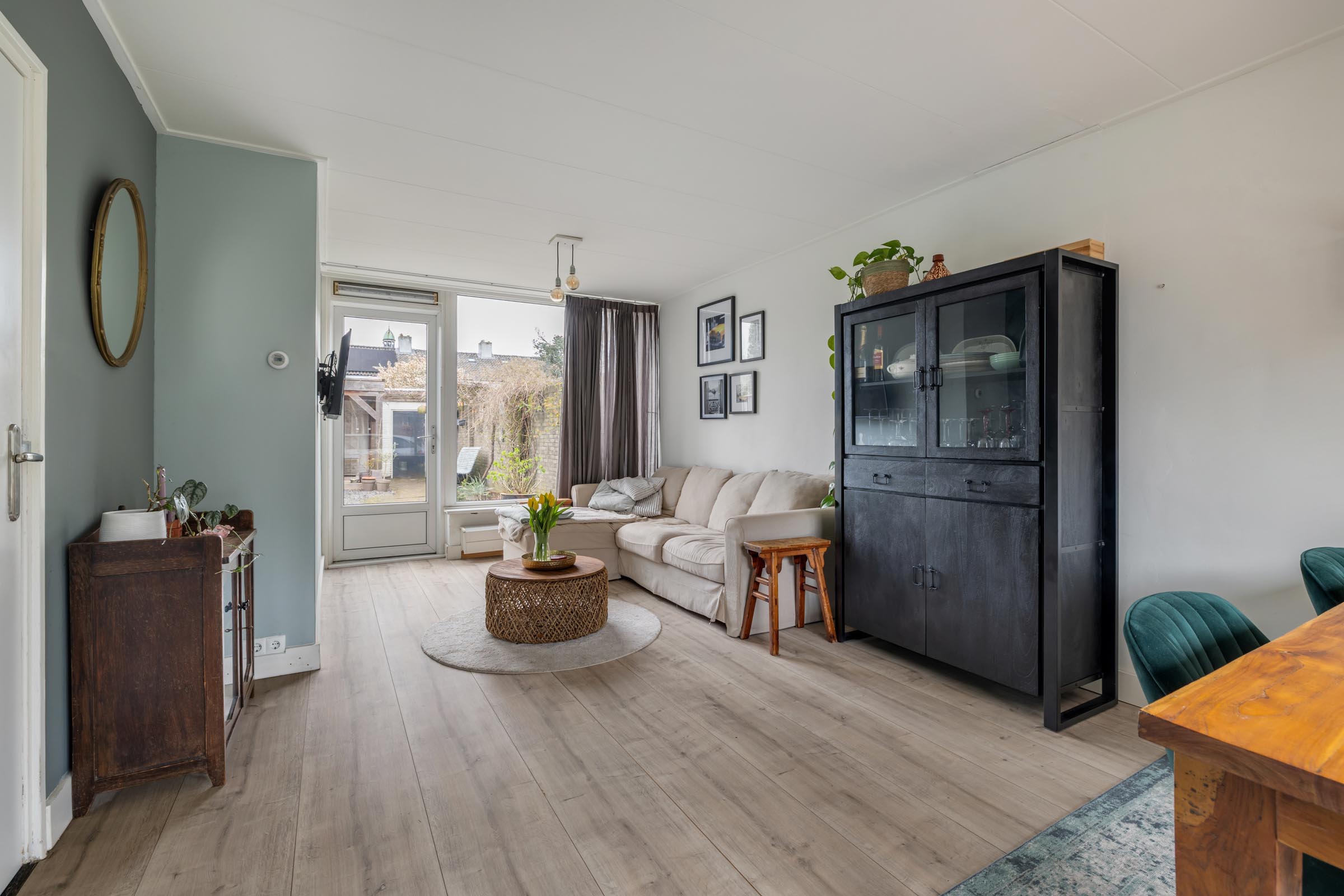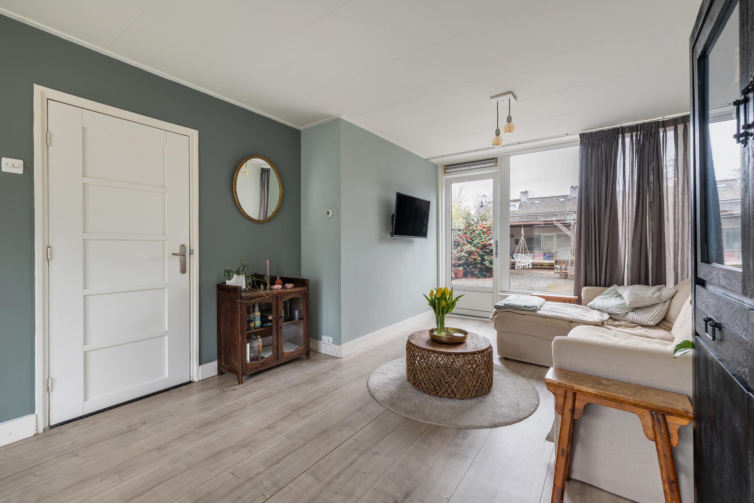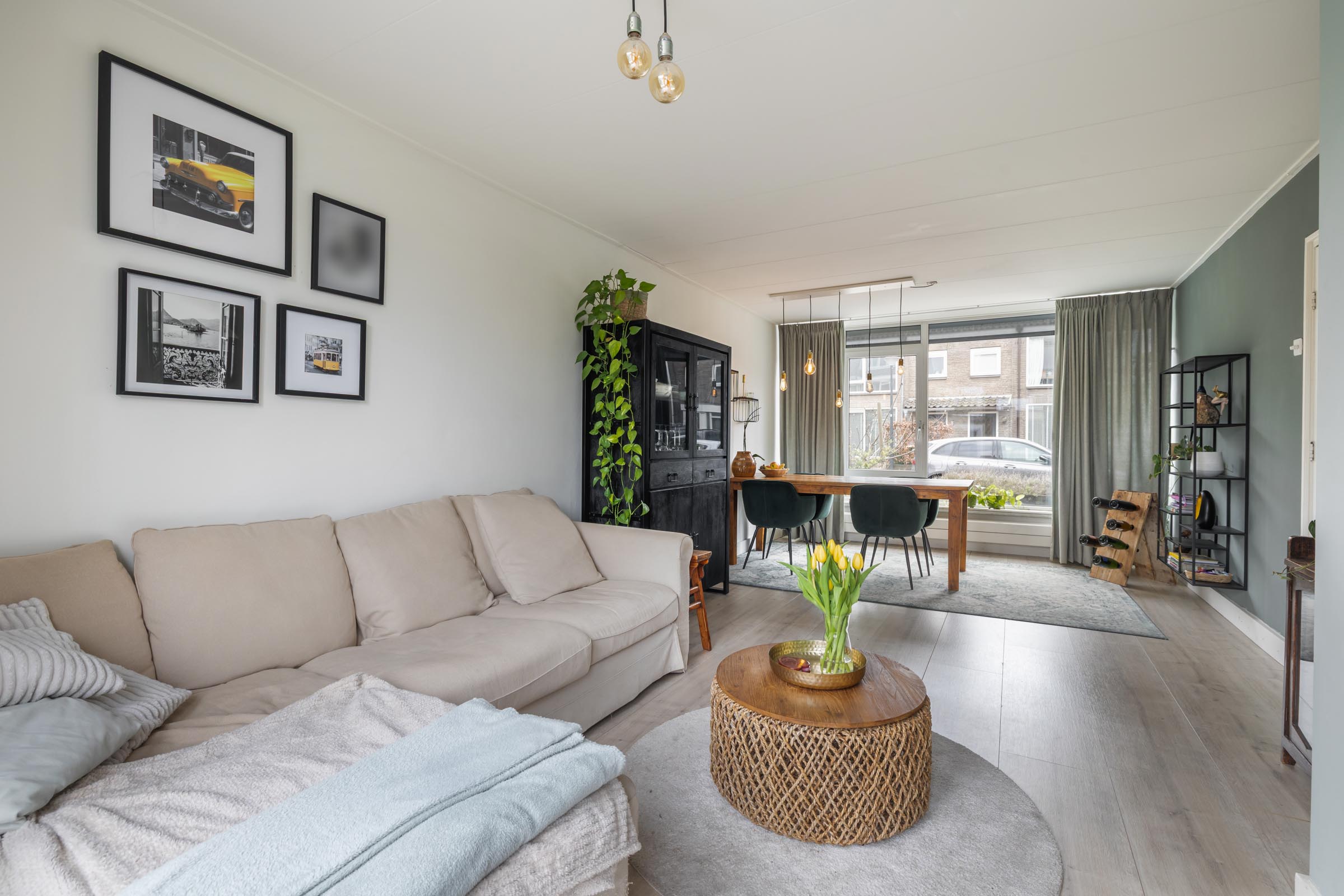 De lichte woonkamer voelt direct prettig aan dankzij de grote raampartijen en is afgewerkt met een laminaatvloer en gestuukte wanden. Het raam aan de voorzijde van de woonkamer is voorzien van een elektrisch screen. Via de loopdeur stap je zo de achtertuin in — ideaal voor binnen-buiten leven.