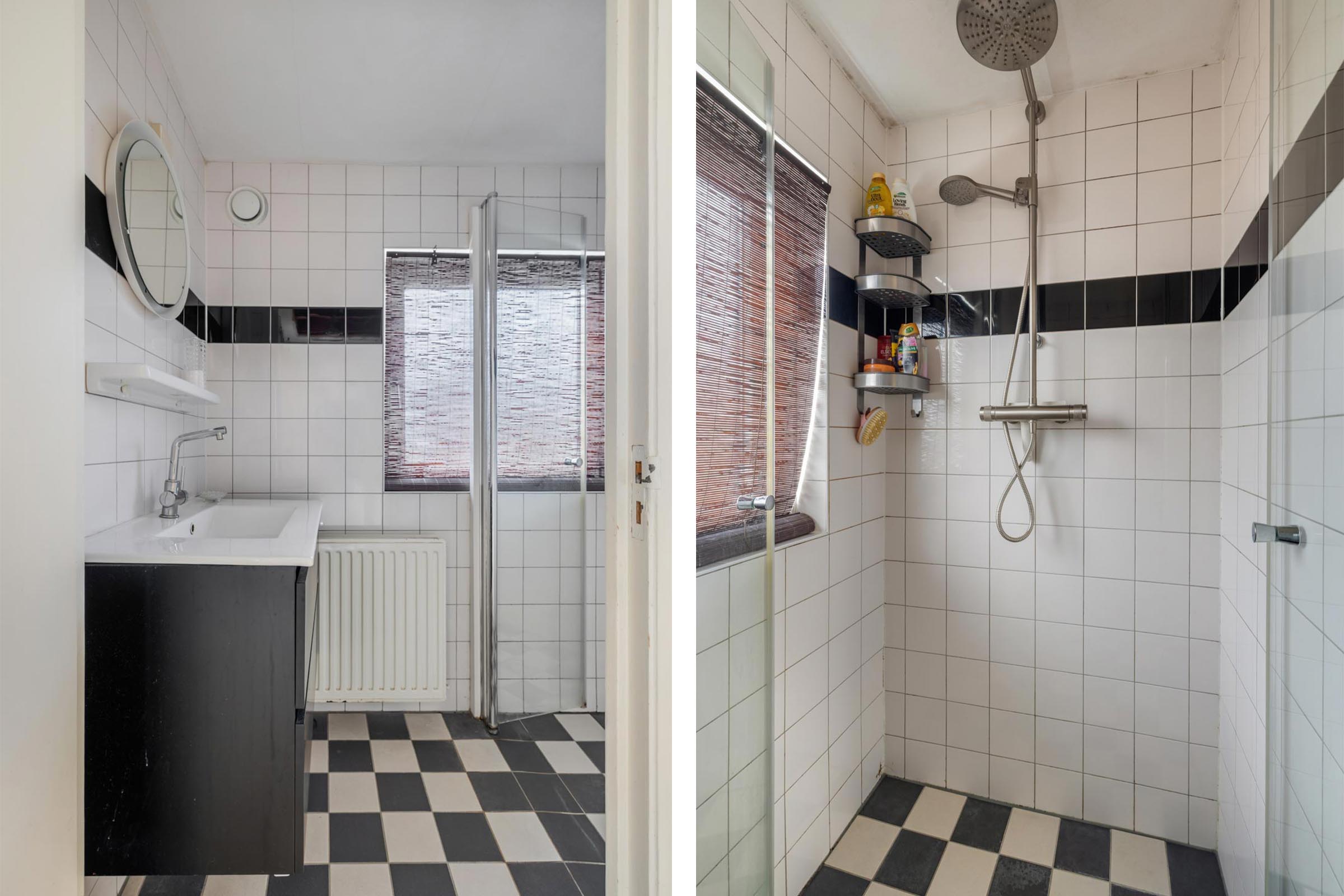 De badkamer is volledig betegeld en voorzien van een wastafelmeubel en een comfortabele inloopdouche met regen- en handdouche.