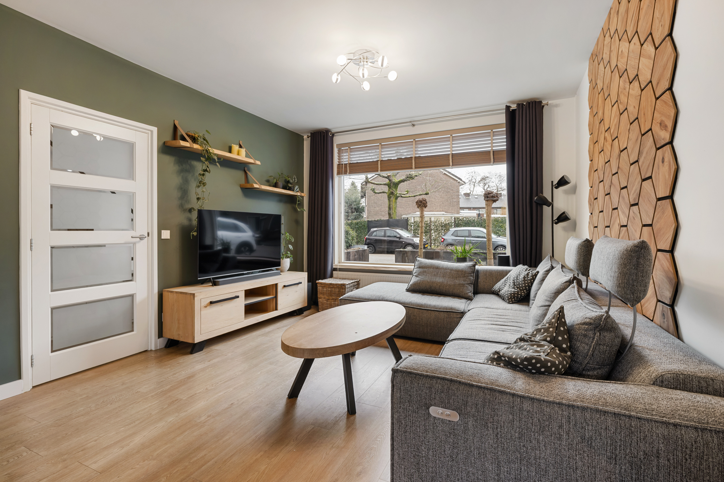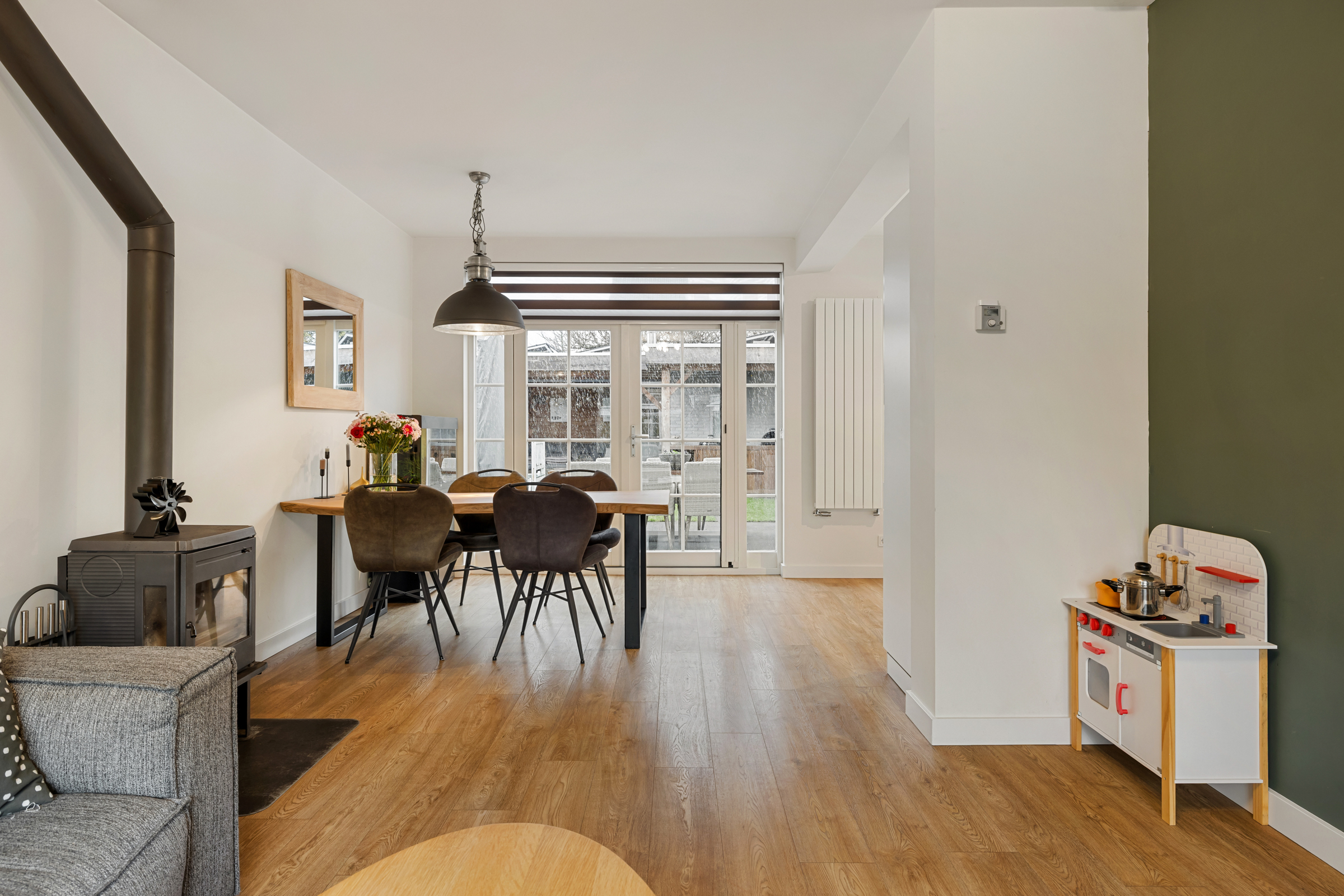 De lichte en sfeervolle woonkamer is modern afgewerkt met strak gestuukte wanden en plafonds en een fraaie PVC-vloer. Dankzij de openslaande tuindeuren staat de living in directe verbinding met de achtertuin. De woonkamer loopt naadloos over in de open keuken aan de achterzijde van de woning.