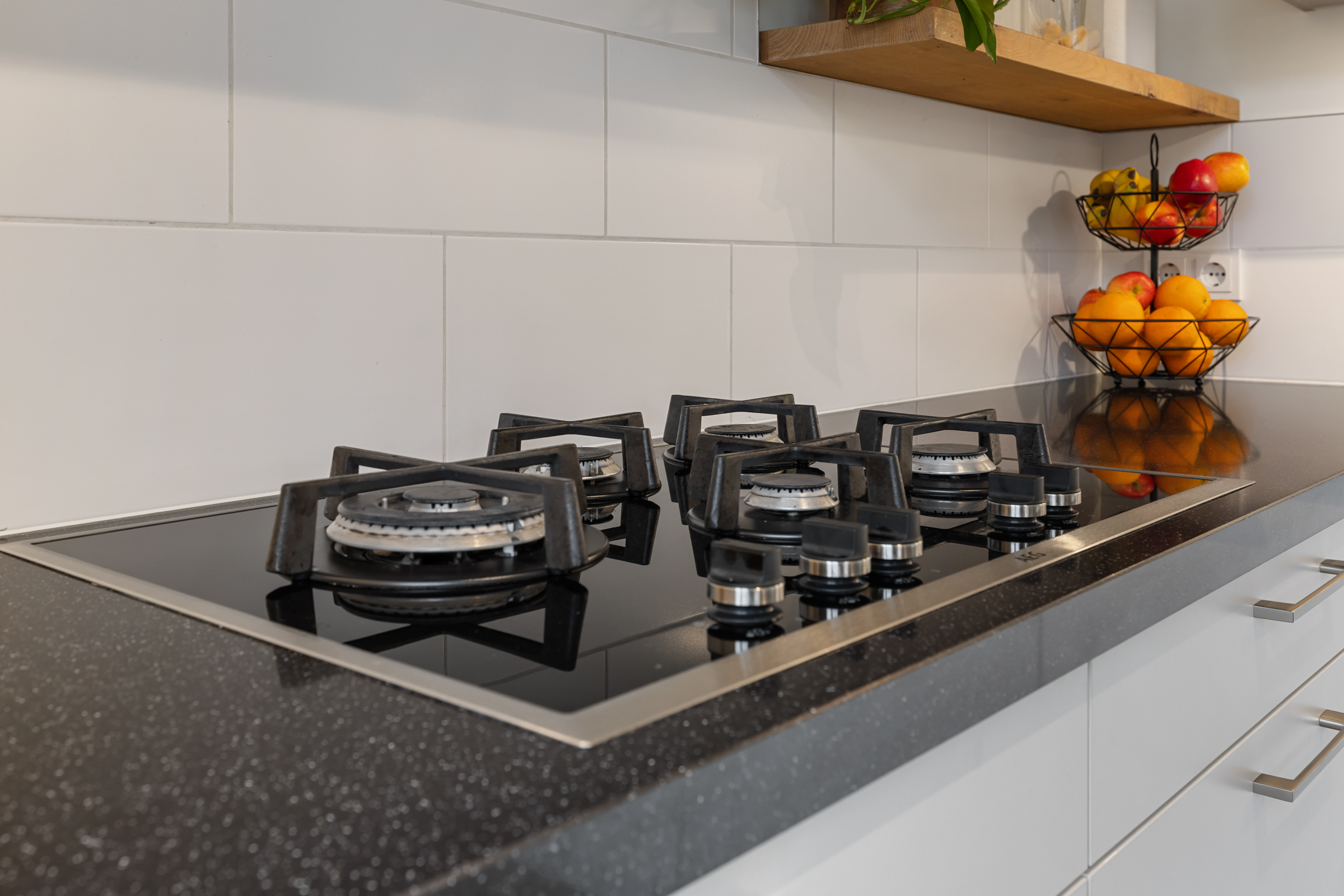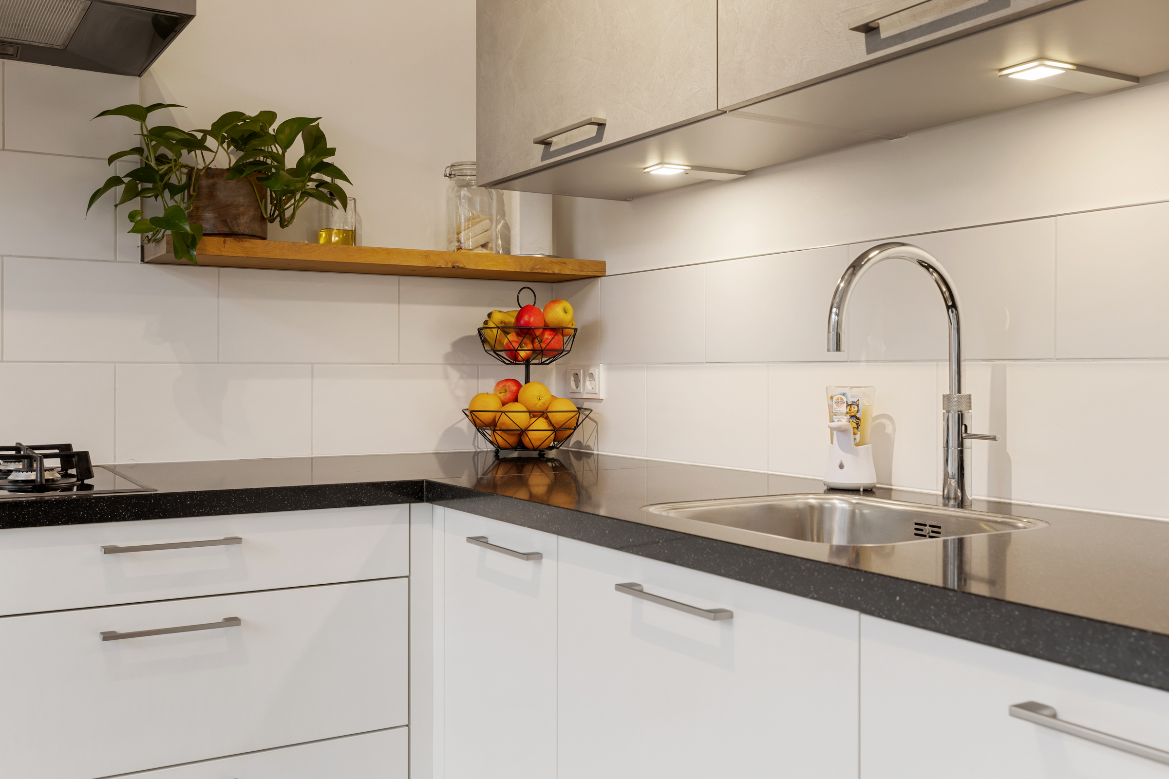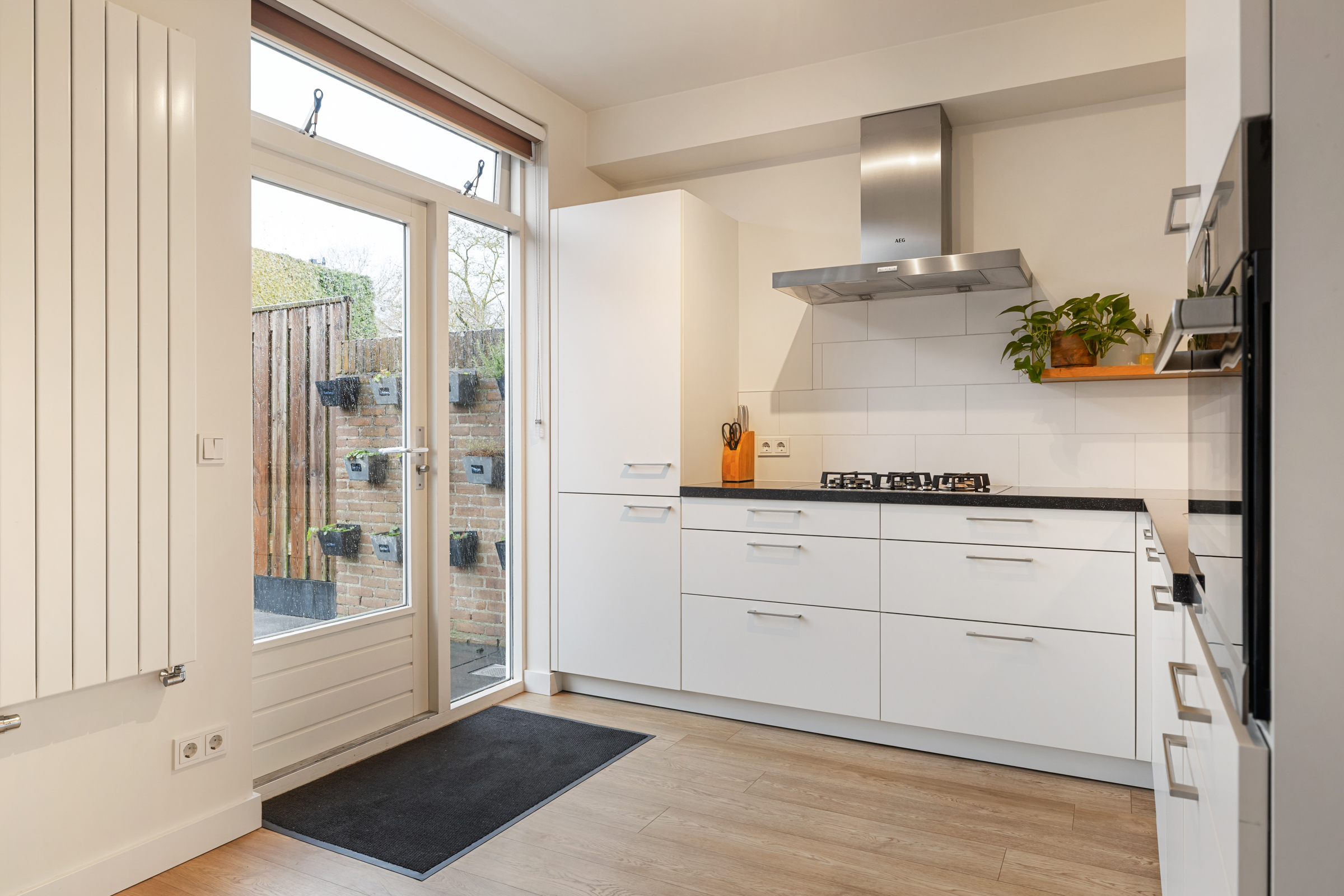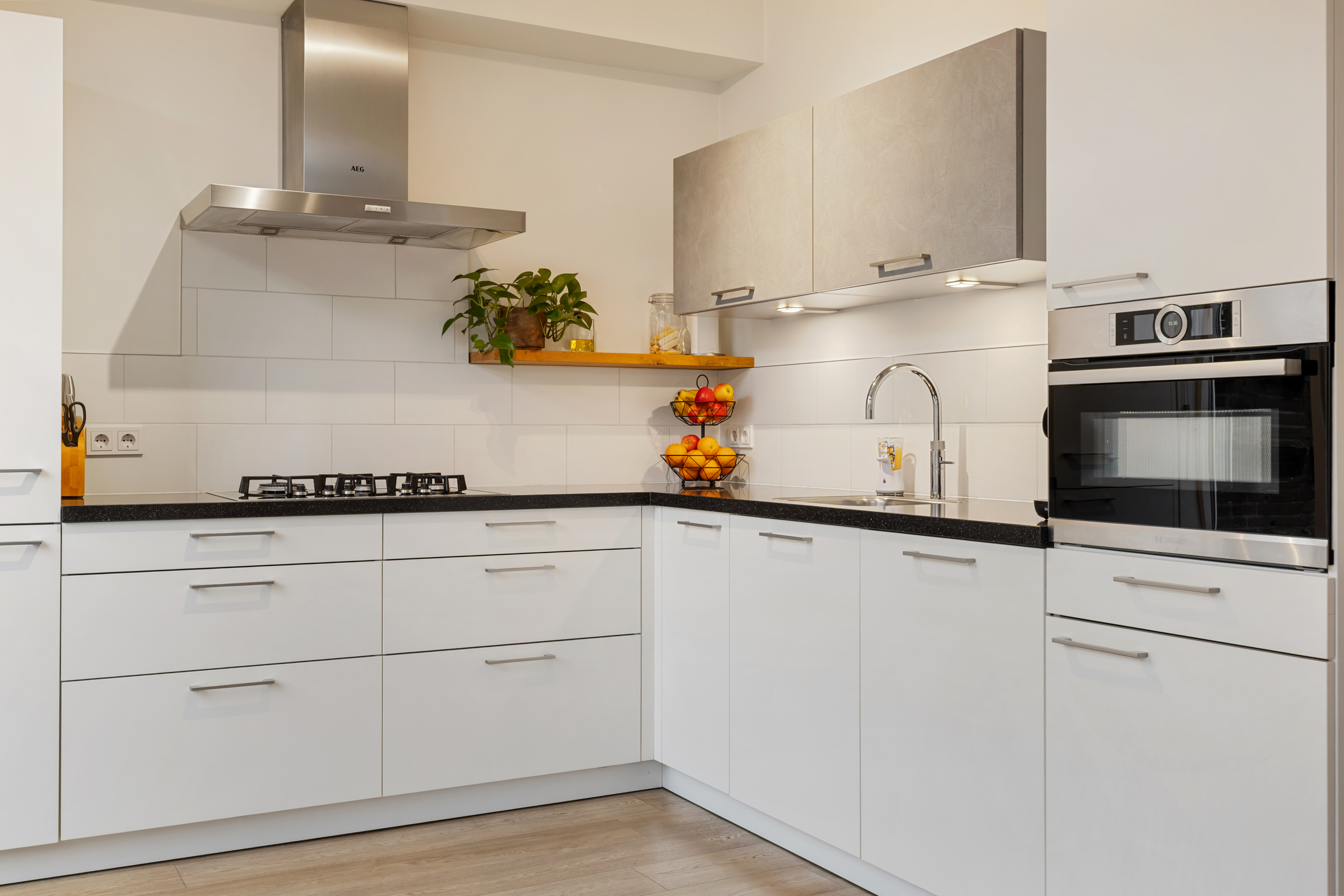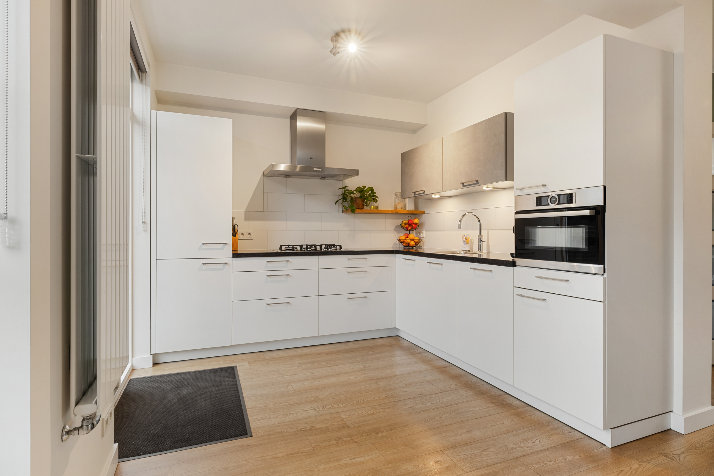 De ruime, moderne hoekkeuken beschikt over veel kastruimte, zes praktische lades, een stijlvol composieten werkblad en diverse inbouwapparatuur, waaronder een vaatwasser, Quooker, koelkast, vriezer, combi-oven/magnetron en een 5-pits gaskookplaat met afzuigkap. Via een loopdeur is eveneens de achtertuin bereikbaar.
