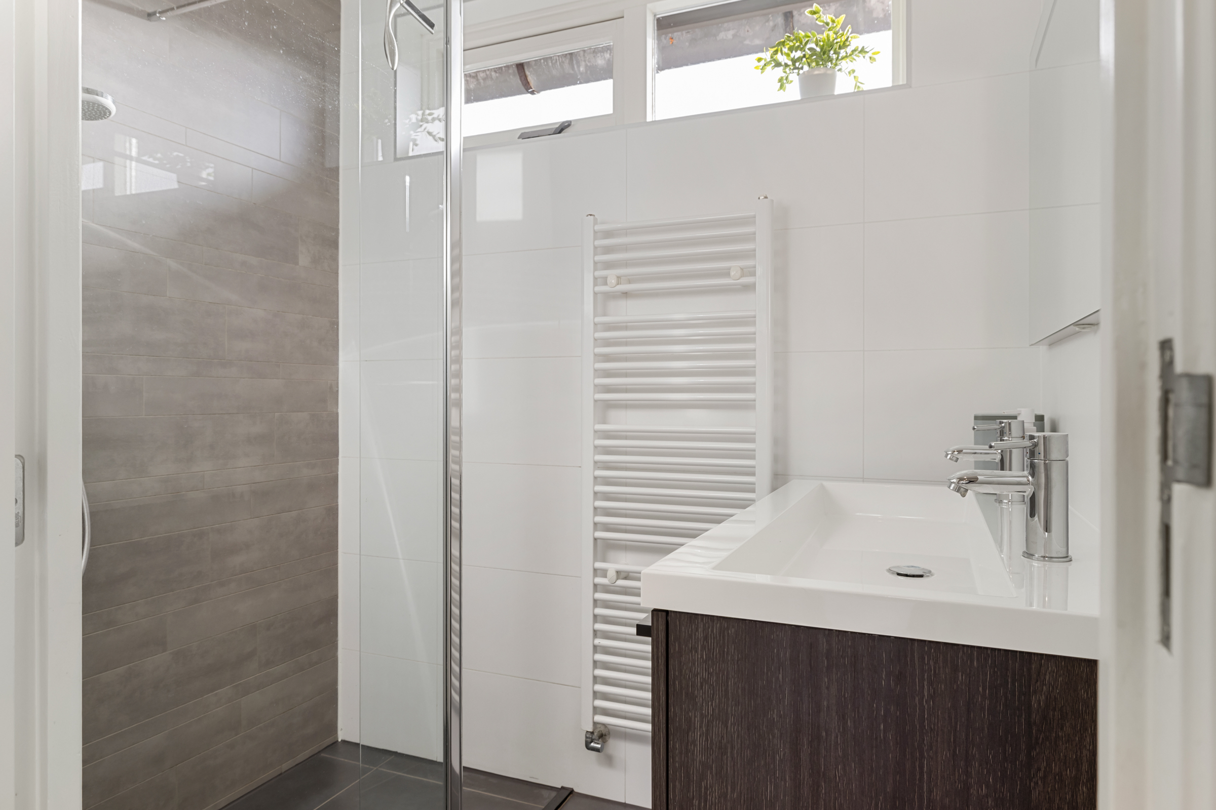 De moderne badkamer is geheel betegeld en uitgerust met een ruime inloopdouche (regendouche, handdouche en thermostaatkraan), design handdoekenradiator, mechanische ventilatie en een dubbel wastafelmeubel met spiegel.