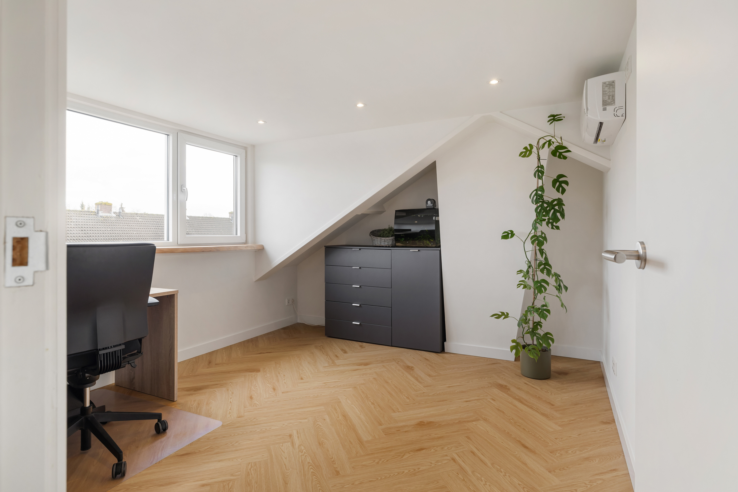 Slaapkamer IV (voorzijde): royale kamer met grote kunststof dakkapel, strak gestuukte wanden en plafond met inbouwspots, PVC-vloer en airconditioning.