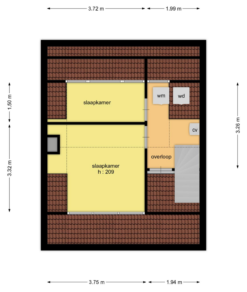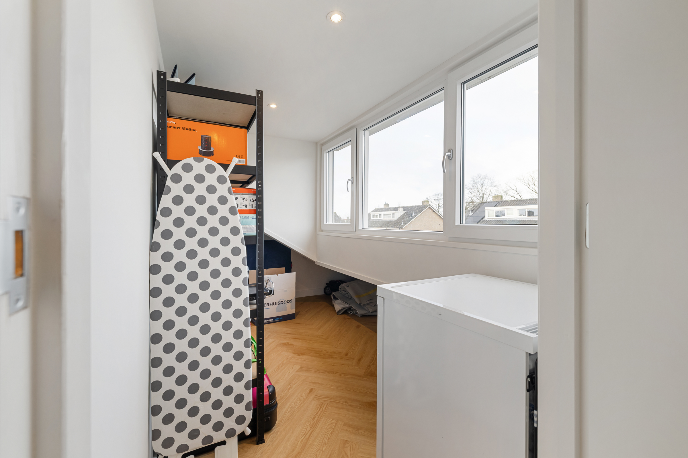 Via vaste trap bereikt u de praktische overloop met dakkapel aan de achterzijde. Hier bevinden zich de opstelling van de combi cv-ketel (Bosch, 2009), de aansluitingen voor wasapparatuur en een extra inbouwkast.
