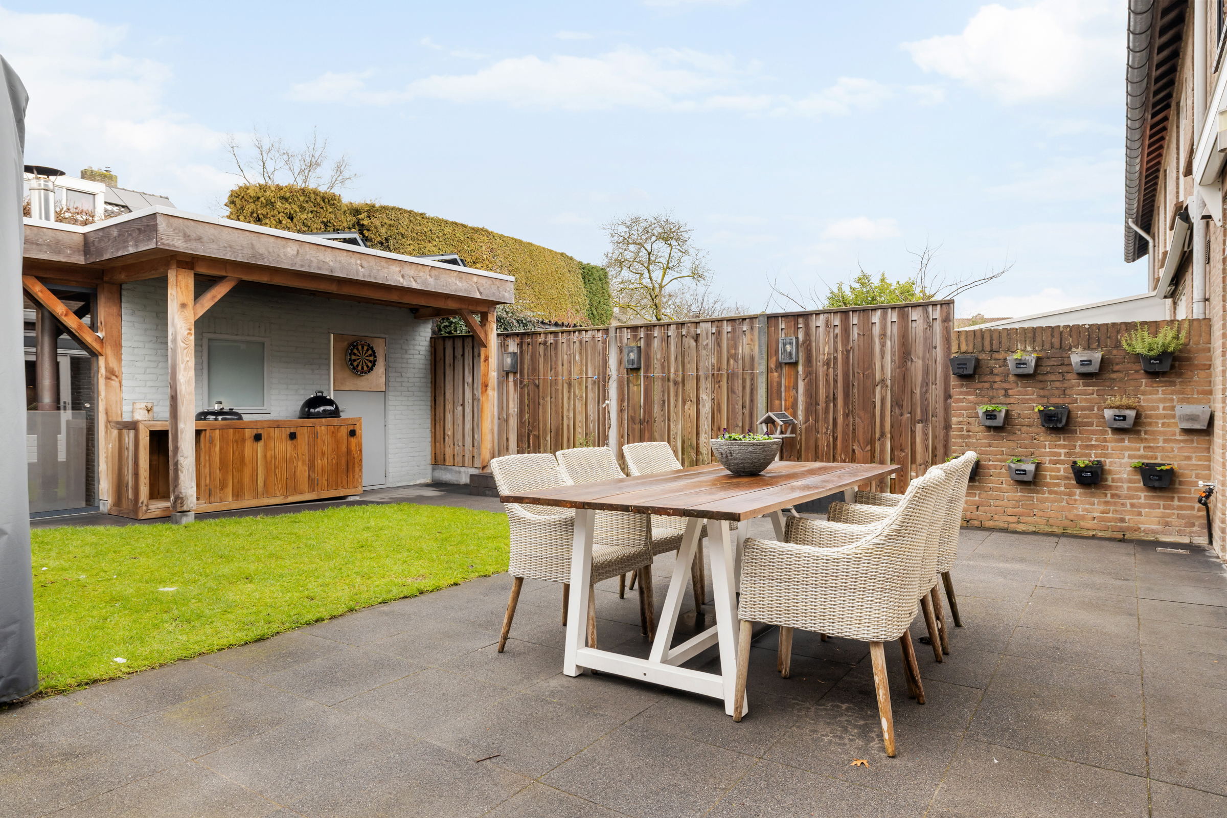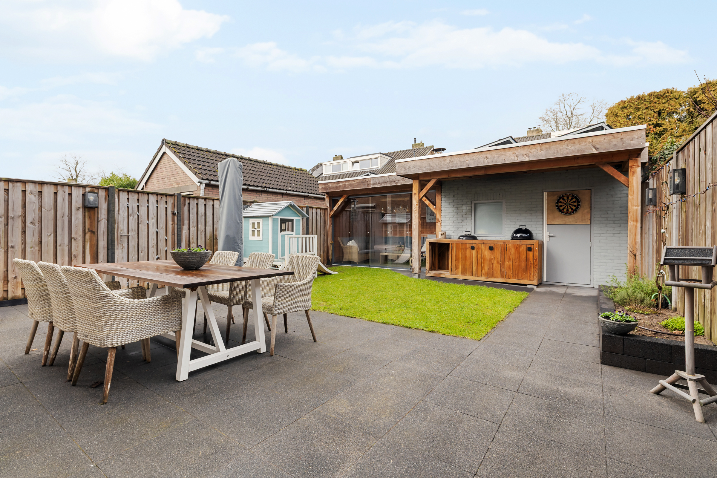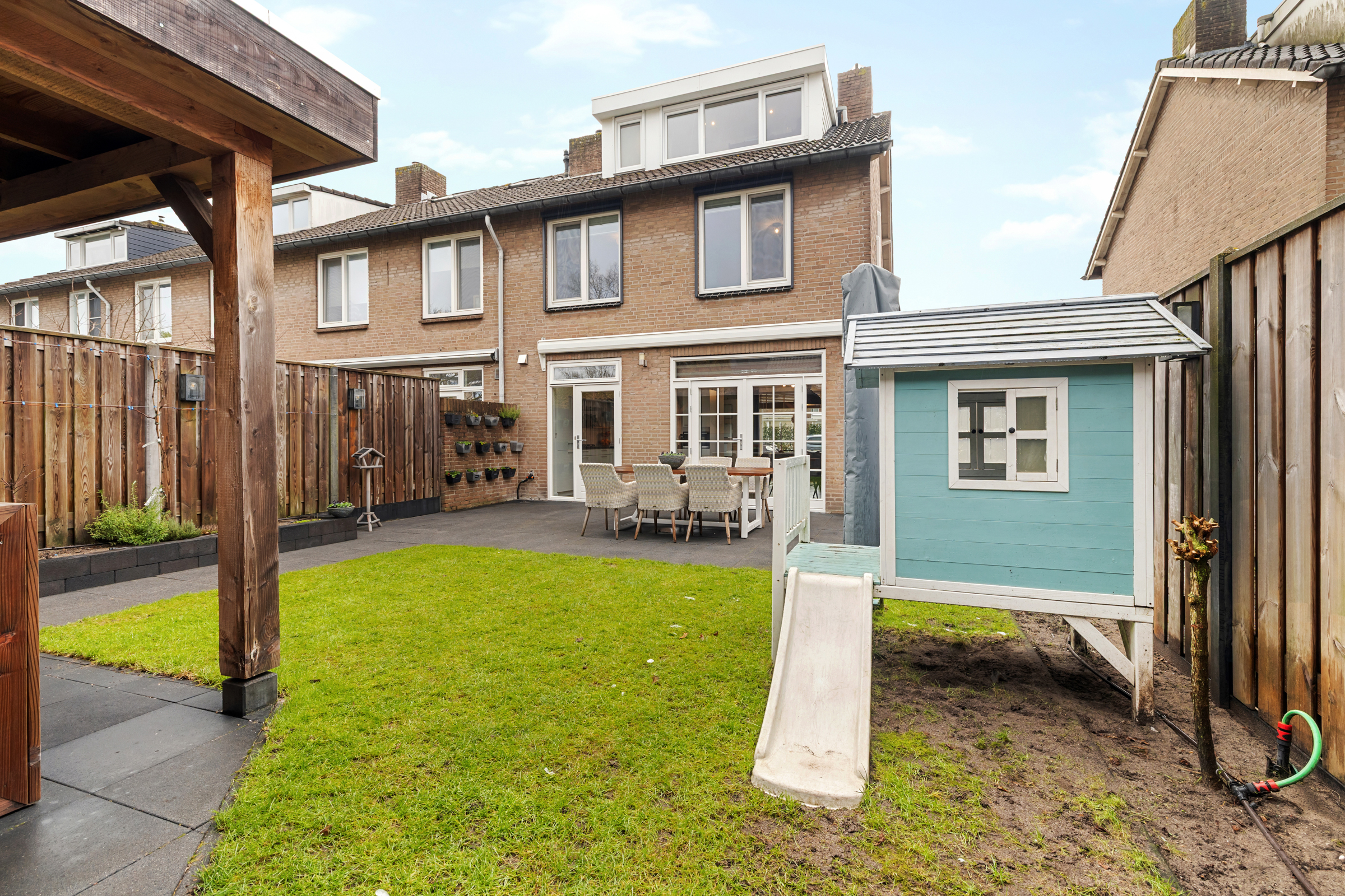 De tuin is voorzien van een gezellige, afsluitenbare (glazen pui) overkapping;
