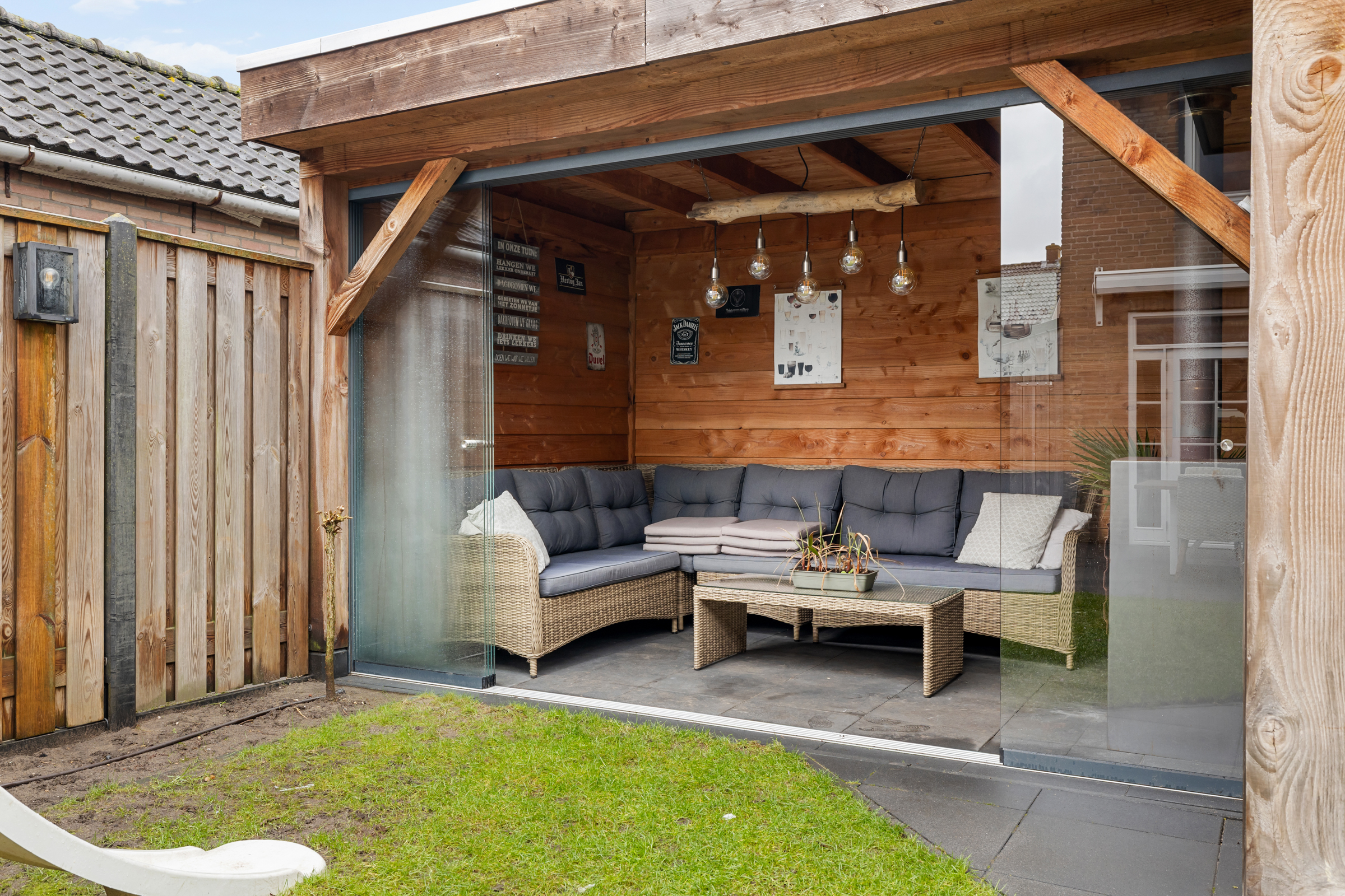 Daarnaast is er een stenen berging met elektra én een sfeervolle, afsluitbare overkapping met glazen pui en aansluitpunt voor een houtkachel – een heerlijke plek om het hele jaar door te genieten.