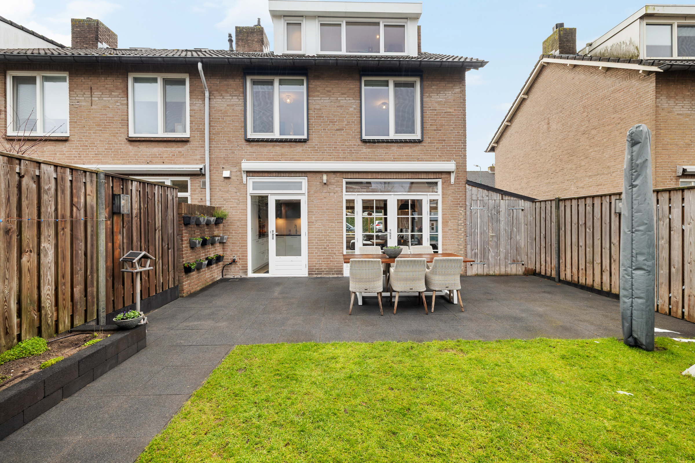 De tuin is bereikbaar via een zijpoort en er is tevens een extra houten berging aan de zijkant van de woning, ideaal voor fietsen en extra opslag.
