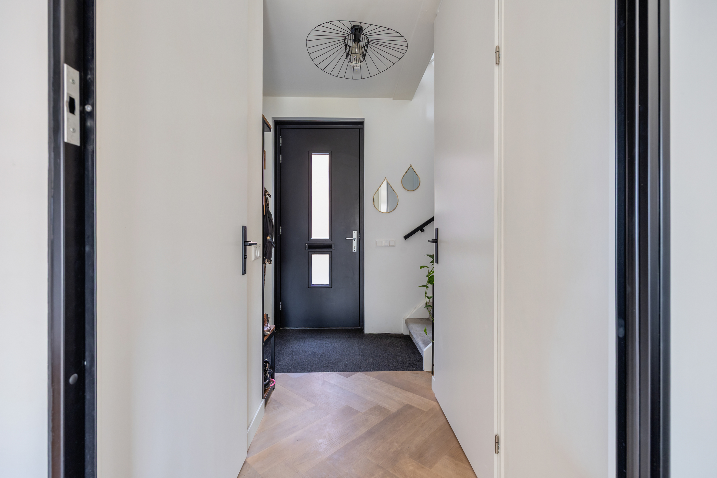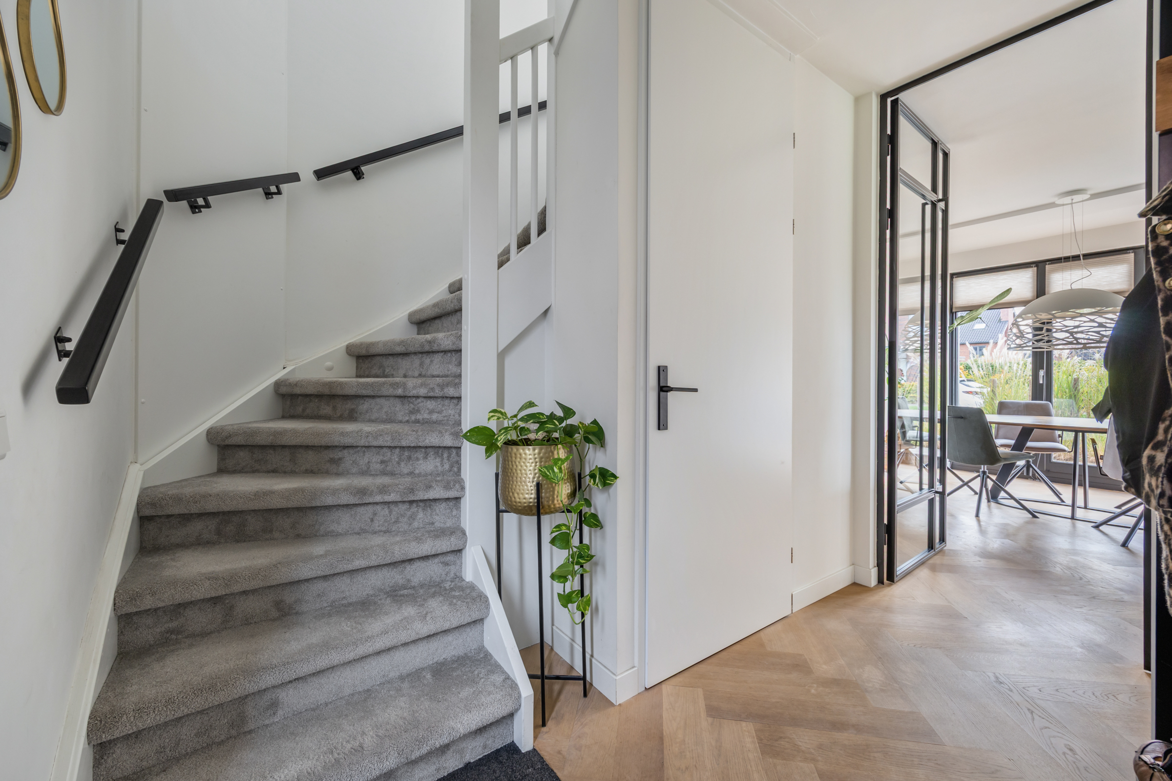 Via de zij-entree betreed je de woning in een stijlvolle hal met een prachtige lichteiken lamelparketvloer in visgraatmotief, een trapopgang naar de eerste verdieping en een ruime trapkast. Hier bevinden zich tevens de uitgebreide groepenkast (11 groepen + 4 aardlekschakelaars), de waterontharder en het doorstroomapparaat voor stadsverwarming.