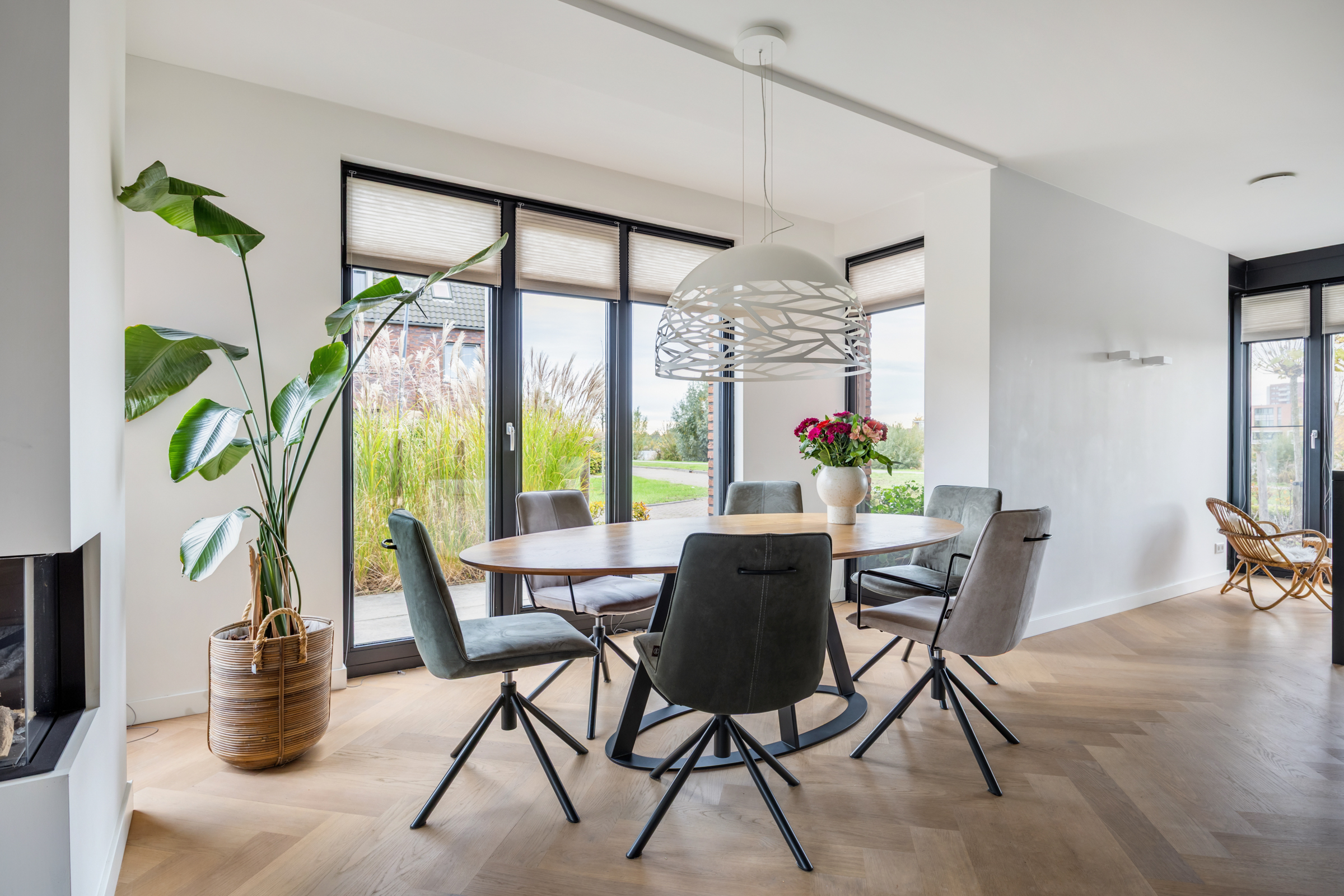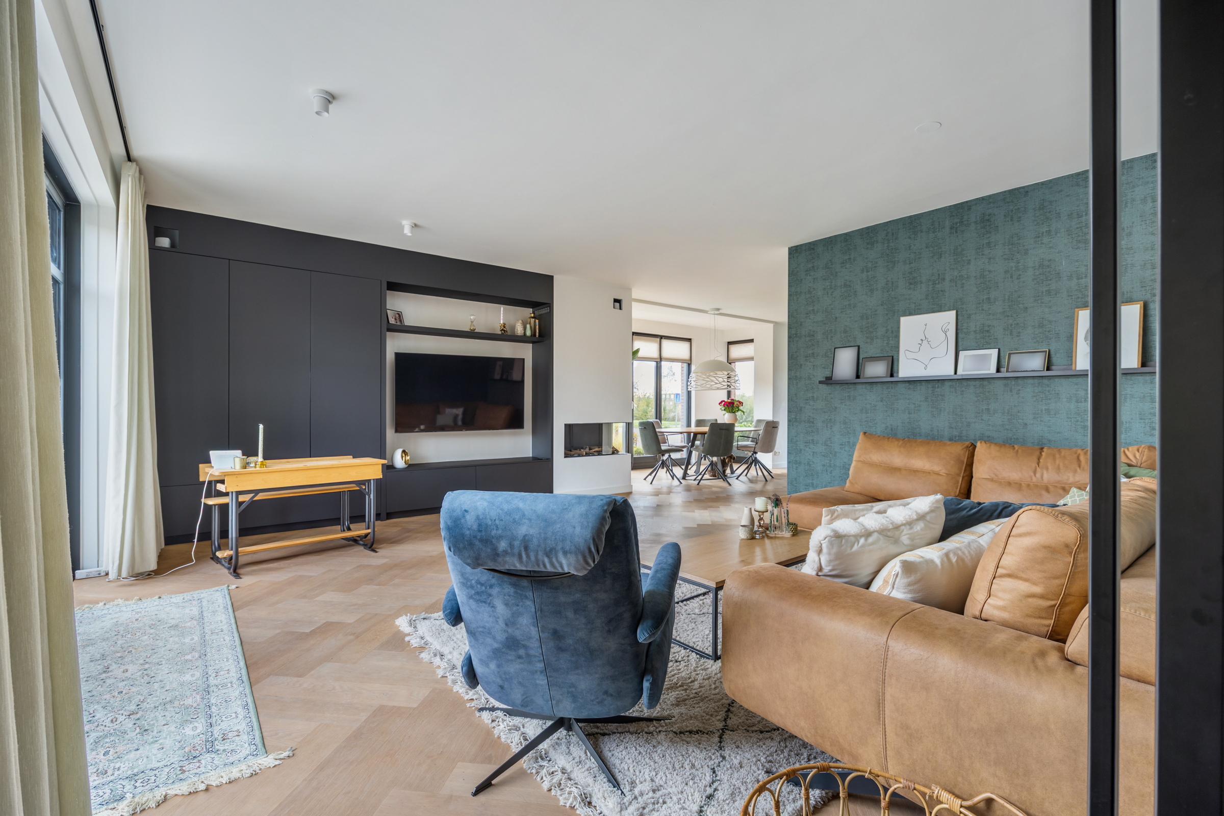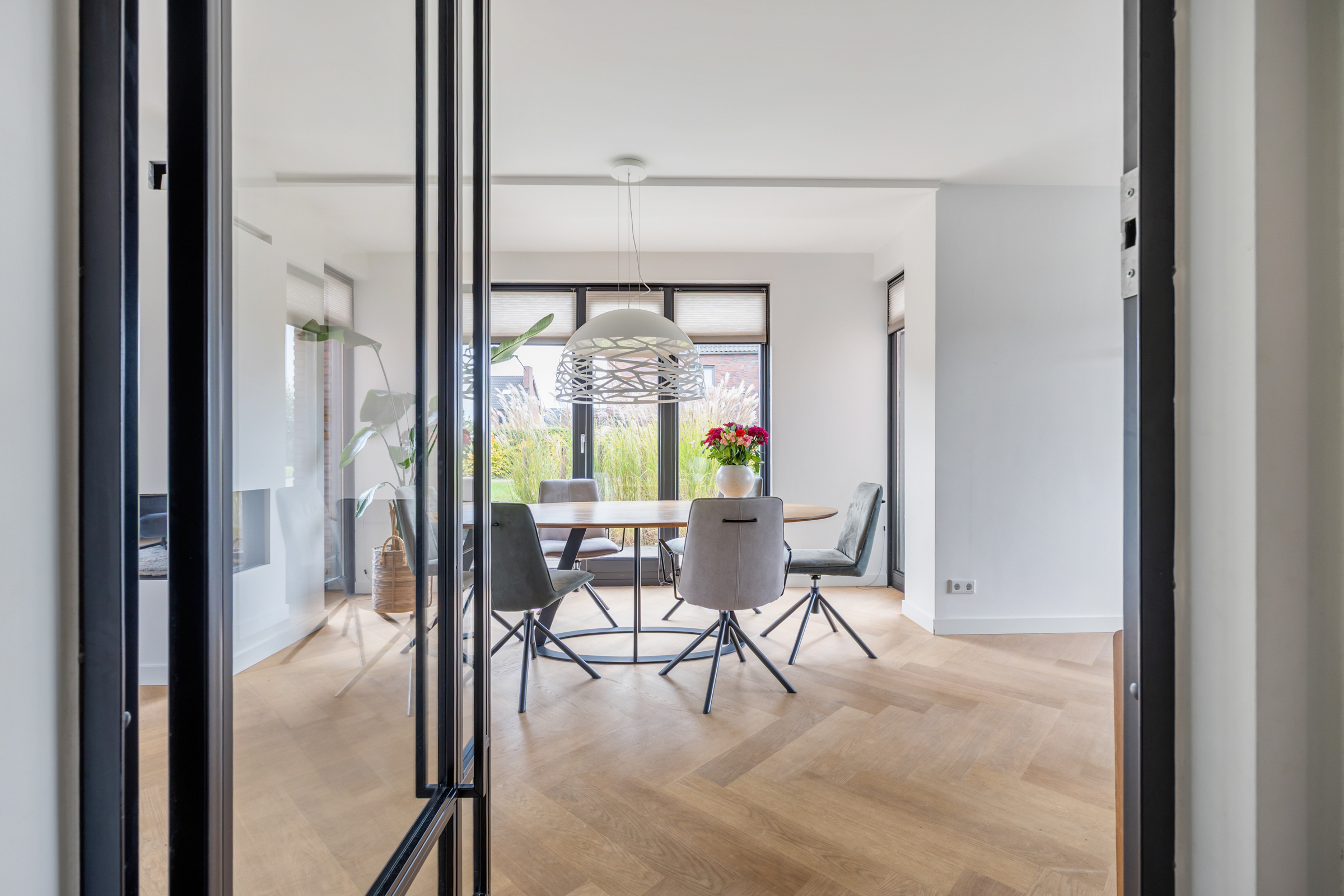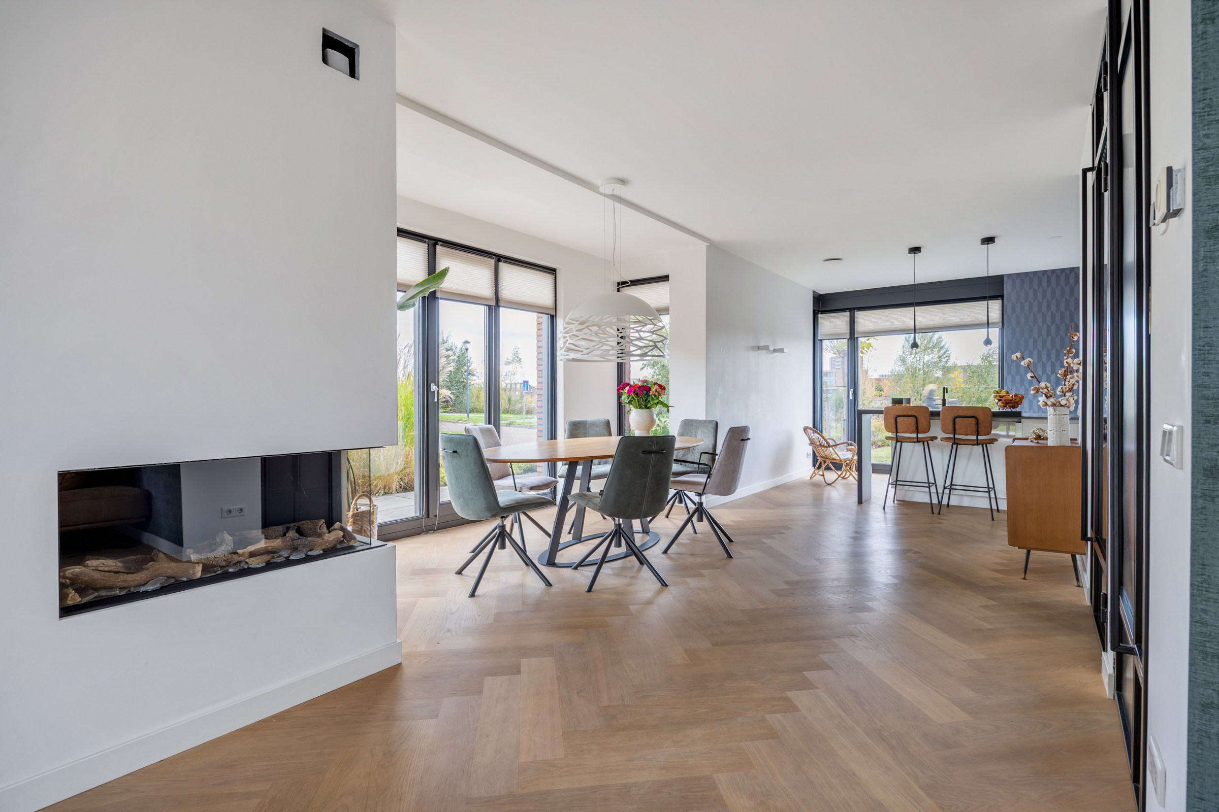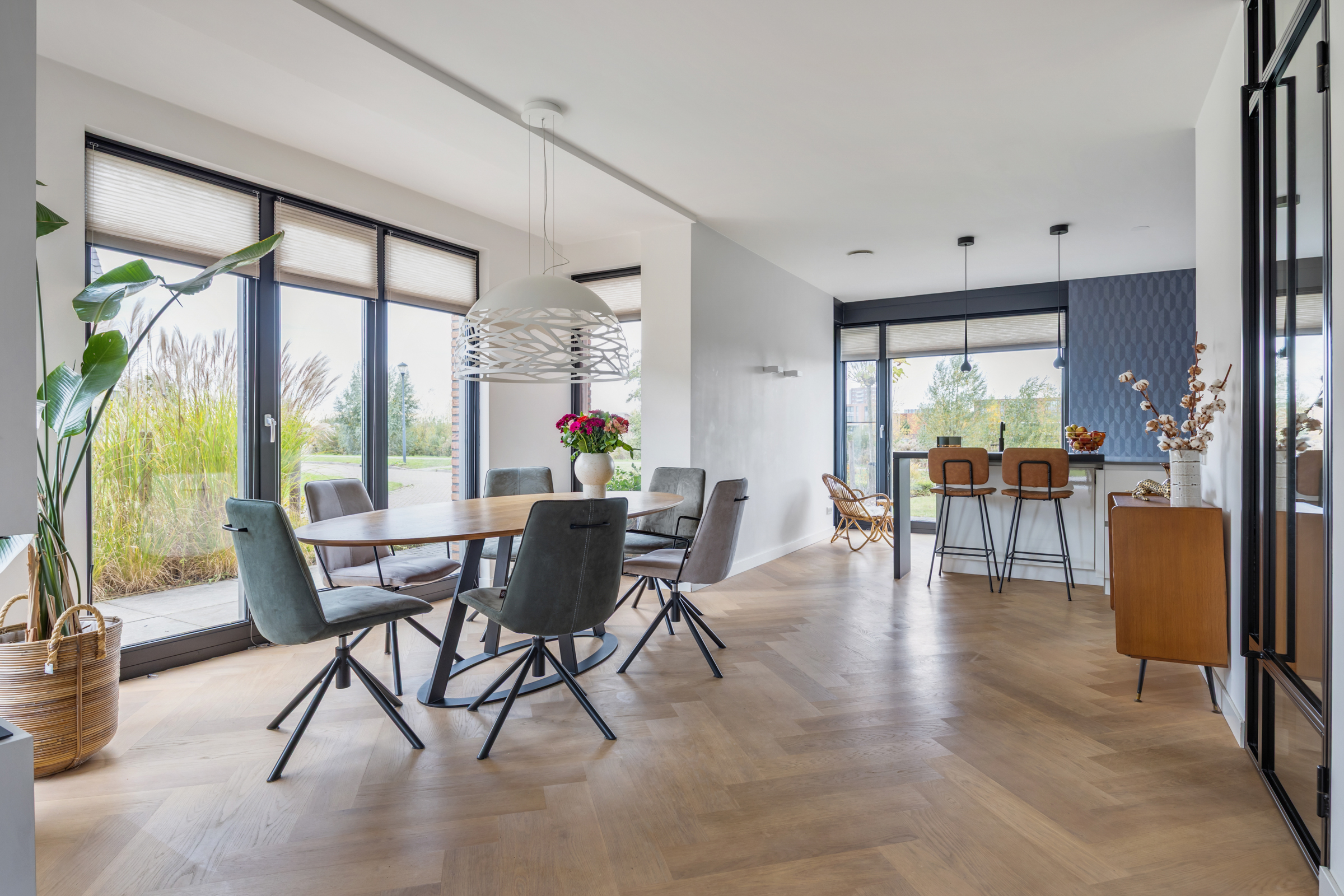 Vervolgens bereik je via een maatwerk stalen deur de royale woonkamer – een lichte, open leefruimte met panoramisch uitzicht over de groene omgeving en mooie waterpartij (De Waterakkers). De sfeervolle zijerker zorgt voor extra daglicht.