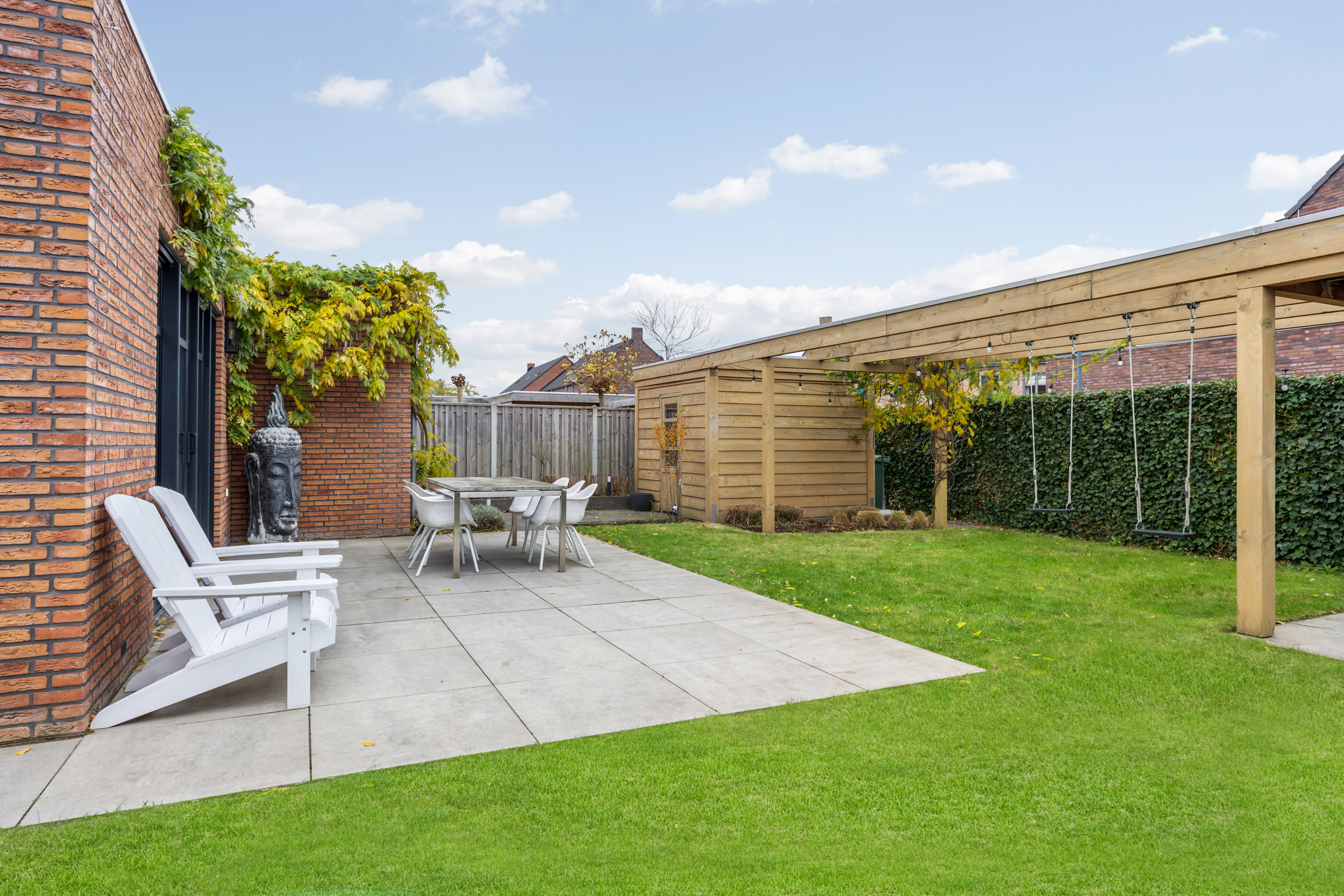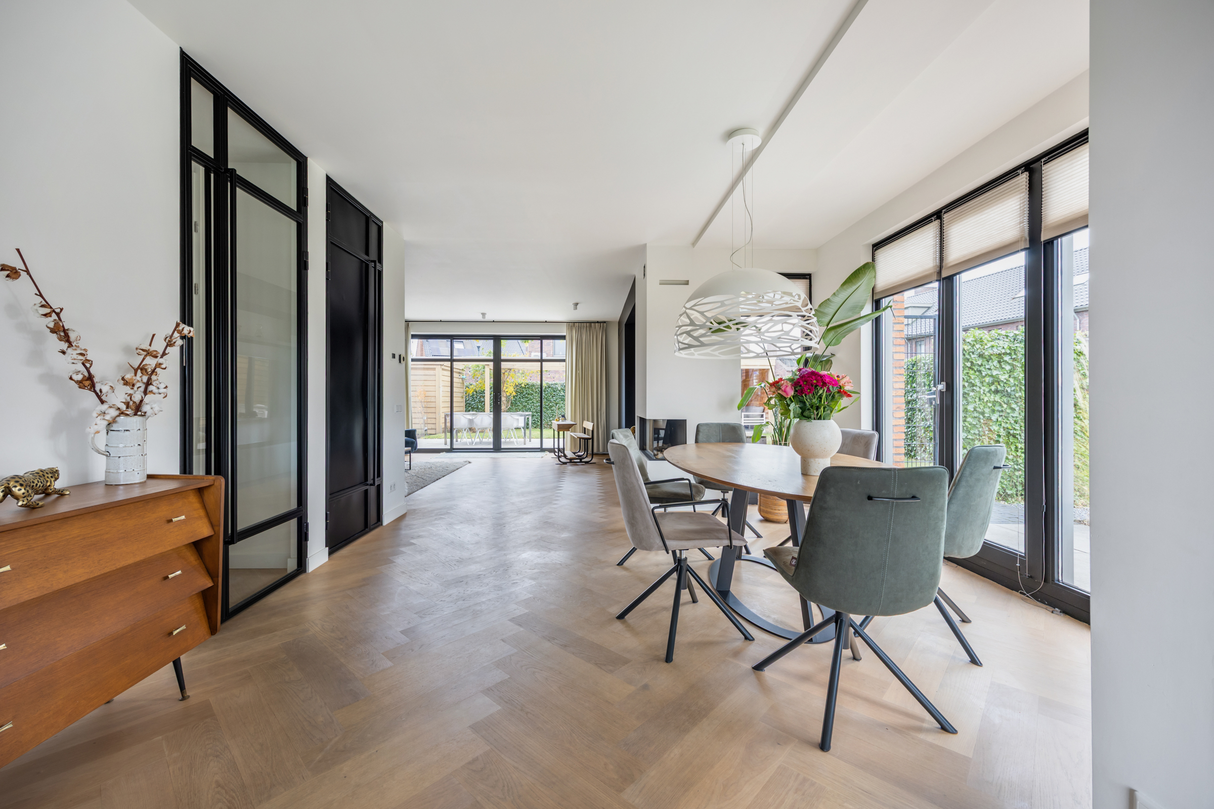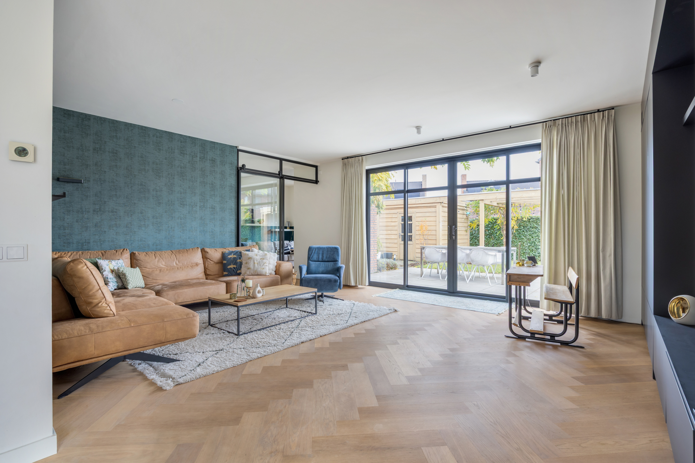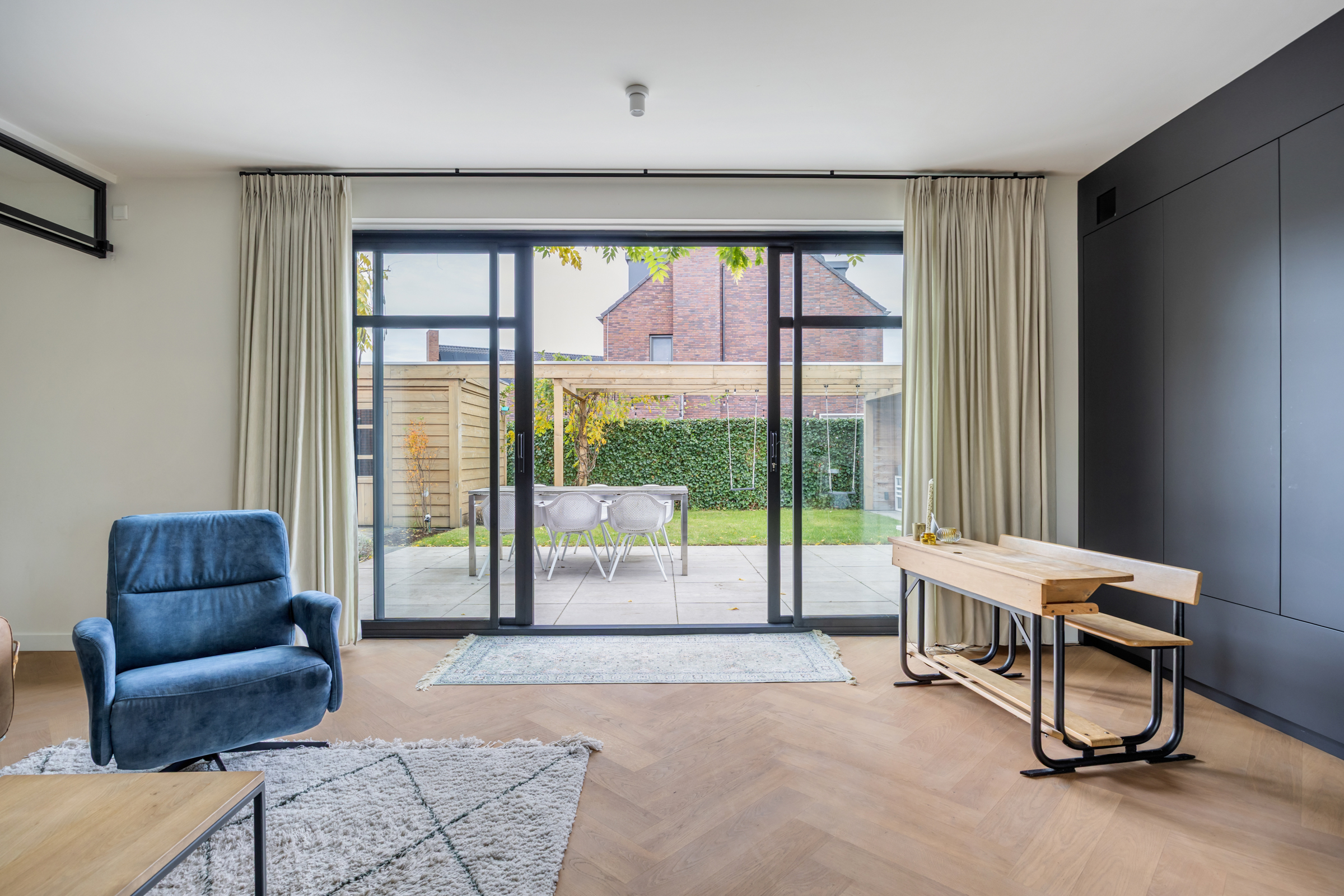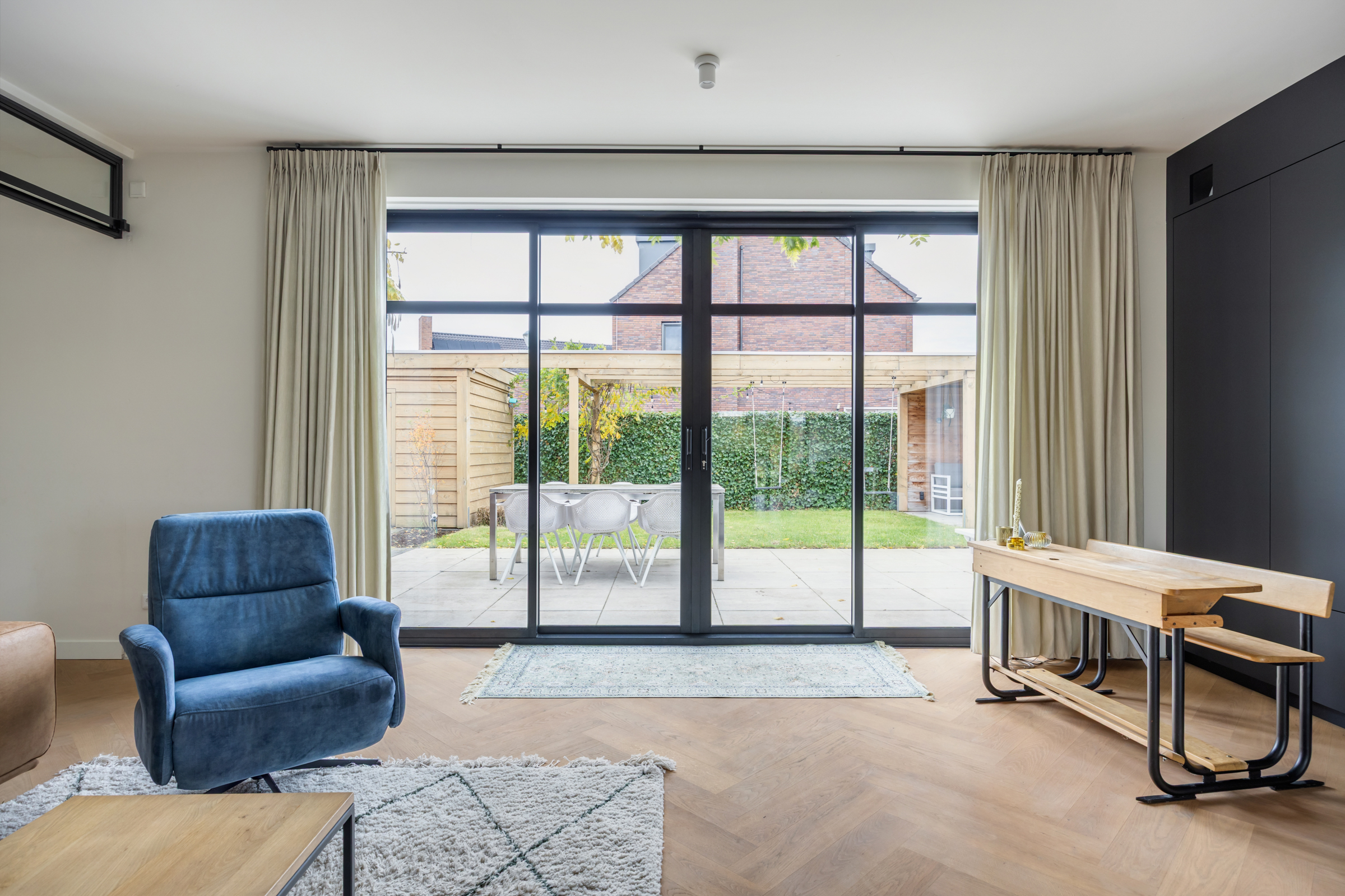 Via een matzwarte aluminium tweedelige schuifpui met openslaande deuren effect is er directe toegang tot de fraai aangelegde zonnige achtertuin.