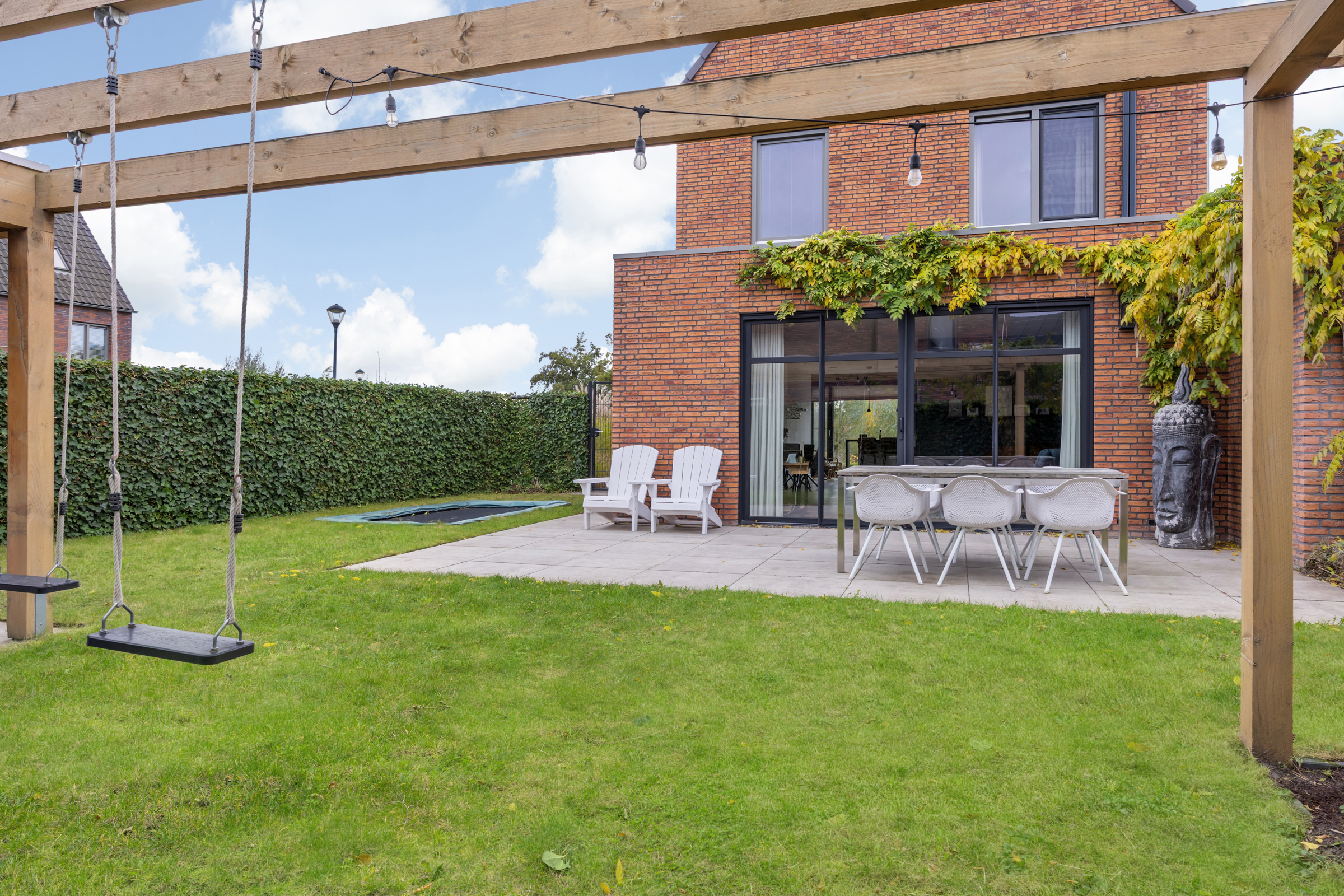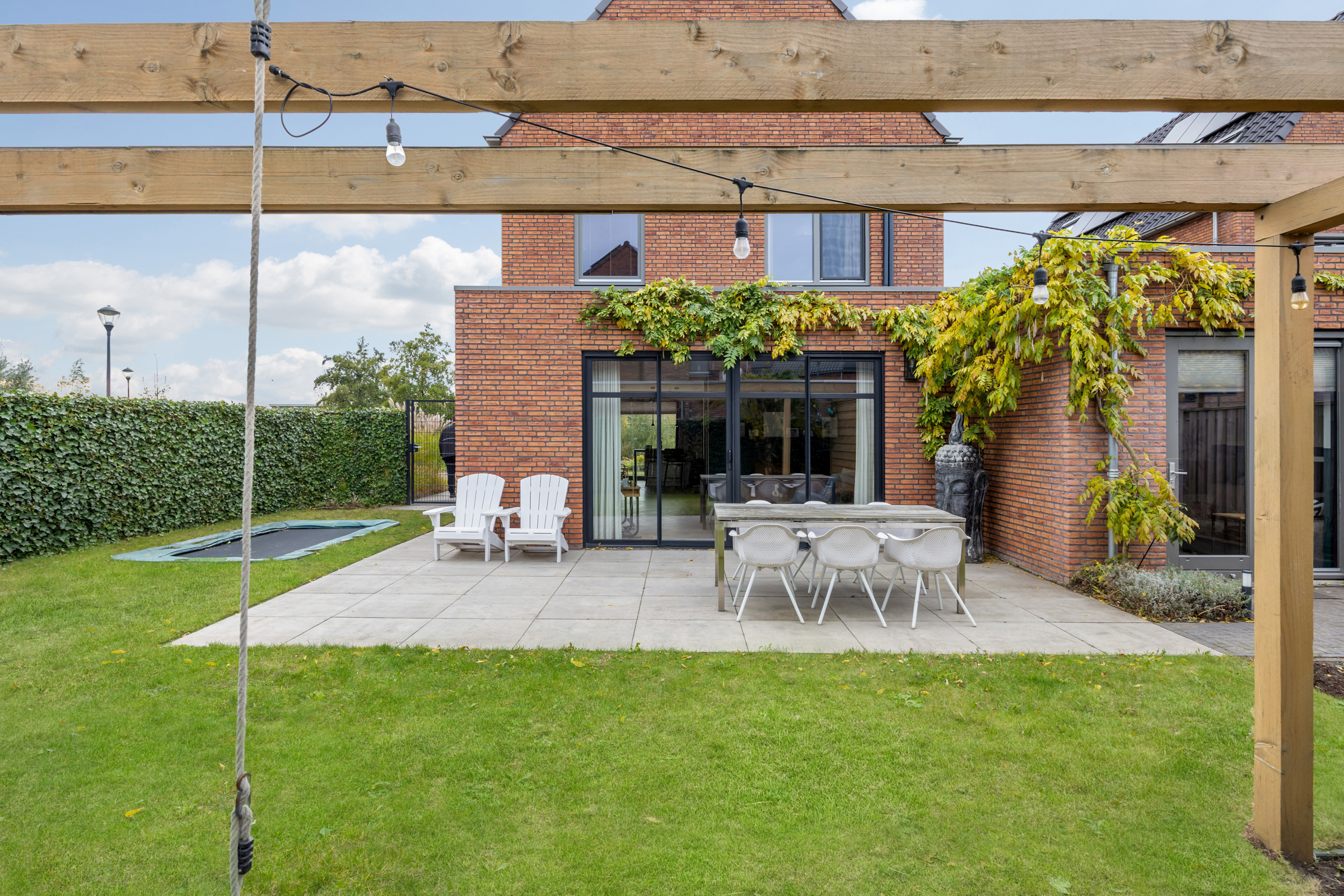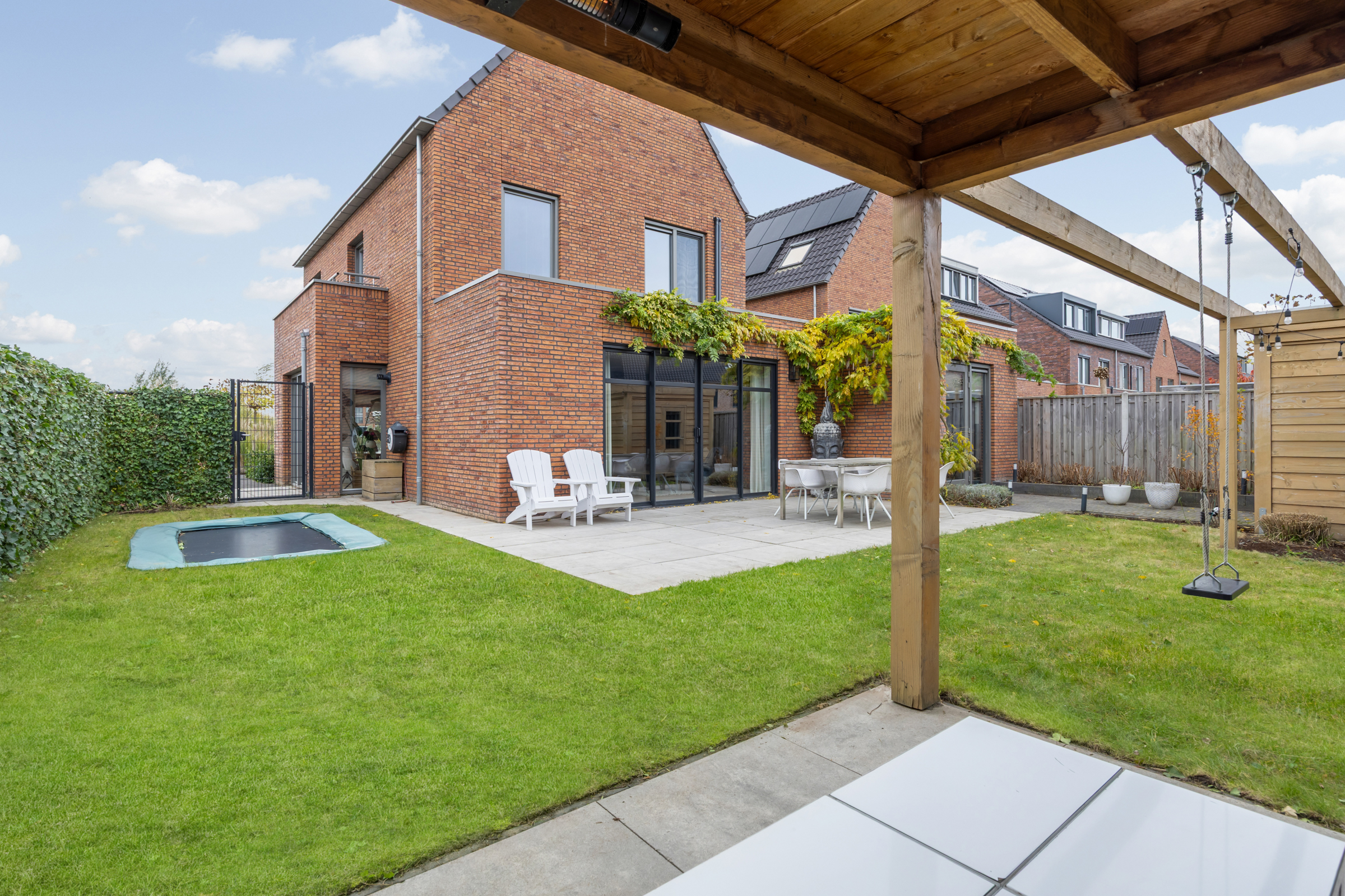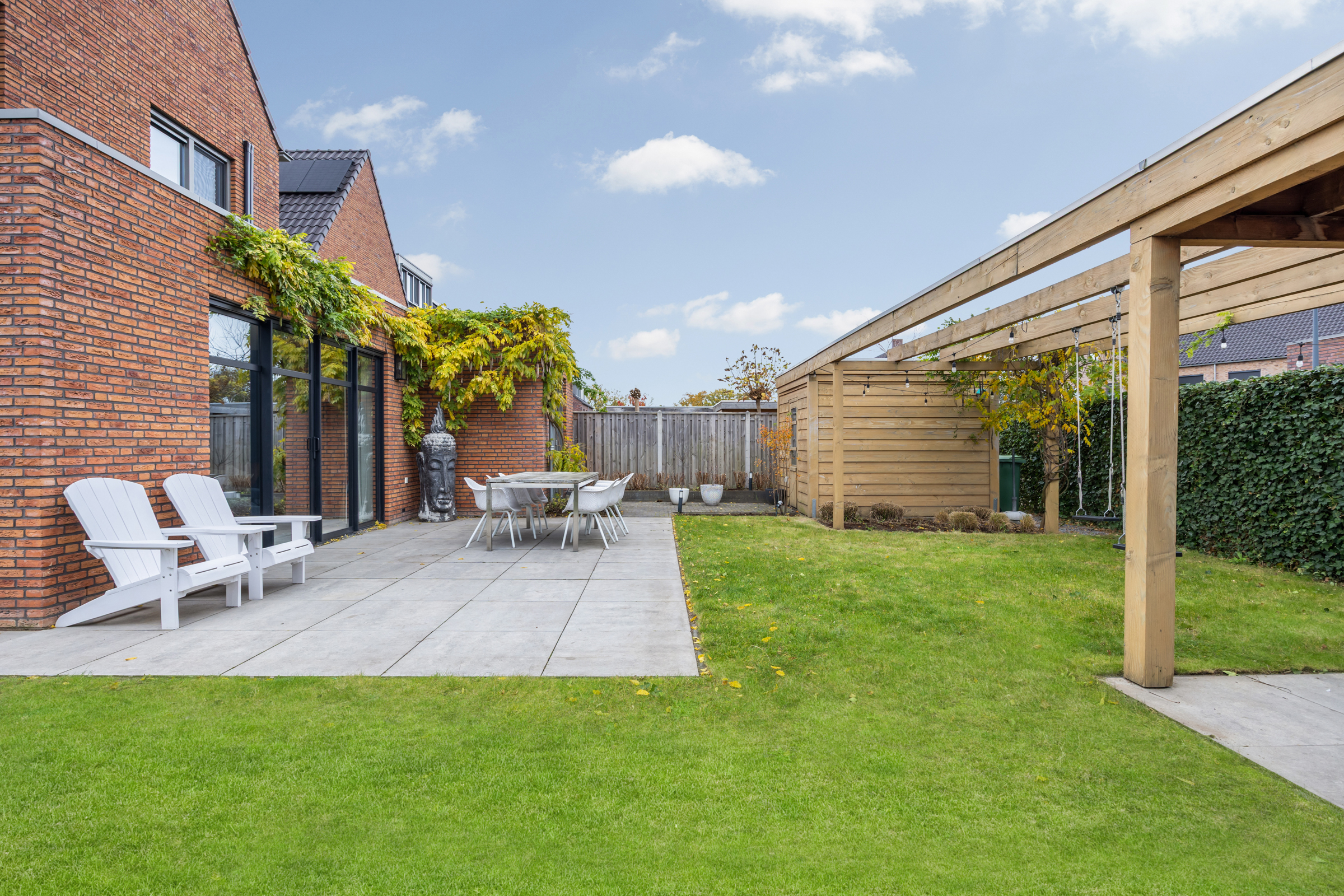 Via een matzwarte aluminium tweedelige schuifpui met openslaande deuren effect is er directe toegang tot de fraai aangelegde zonnige achtertuin.