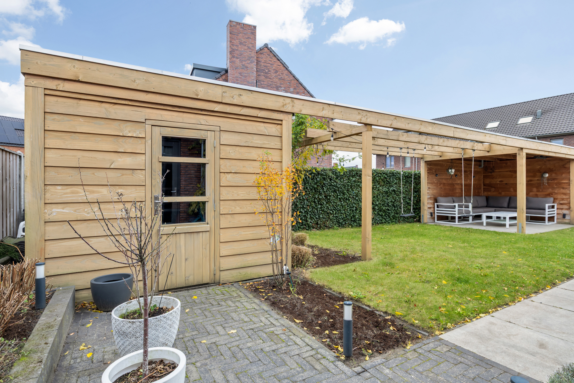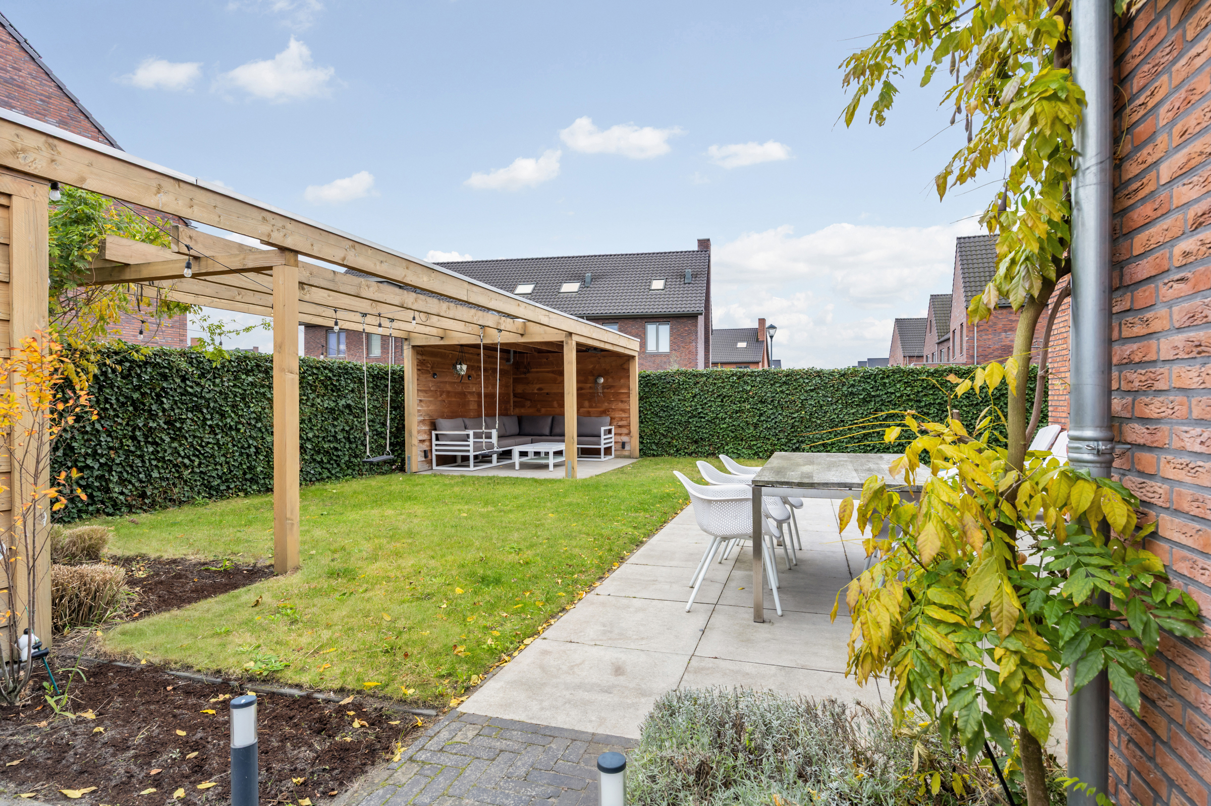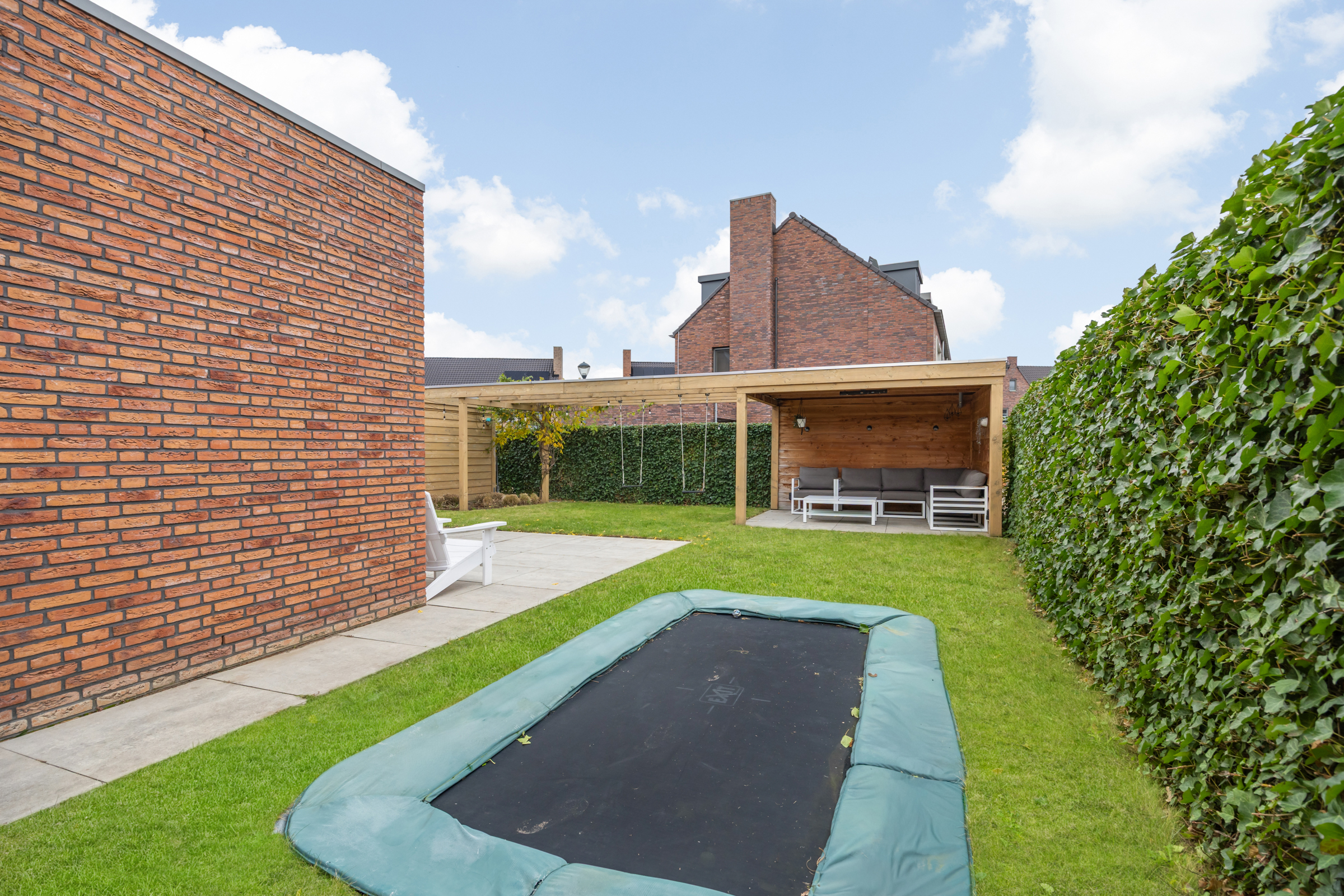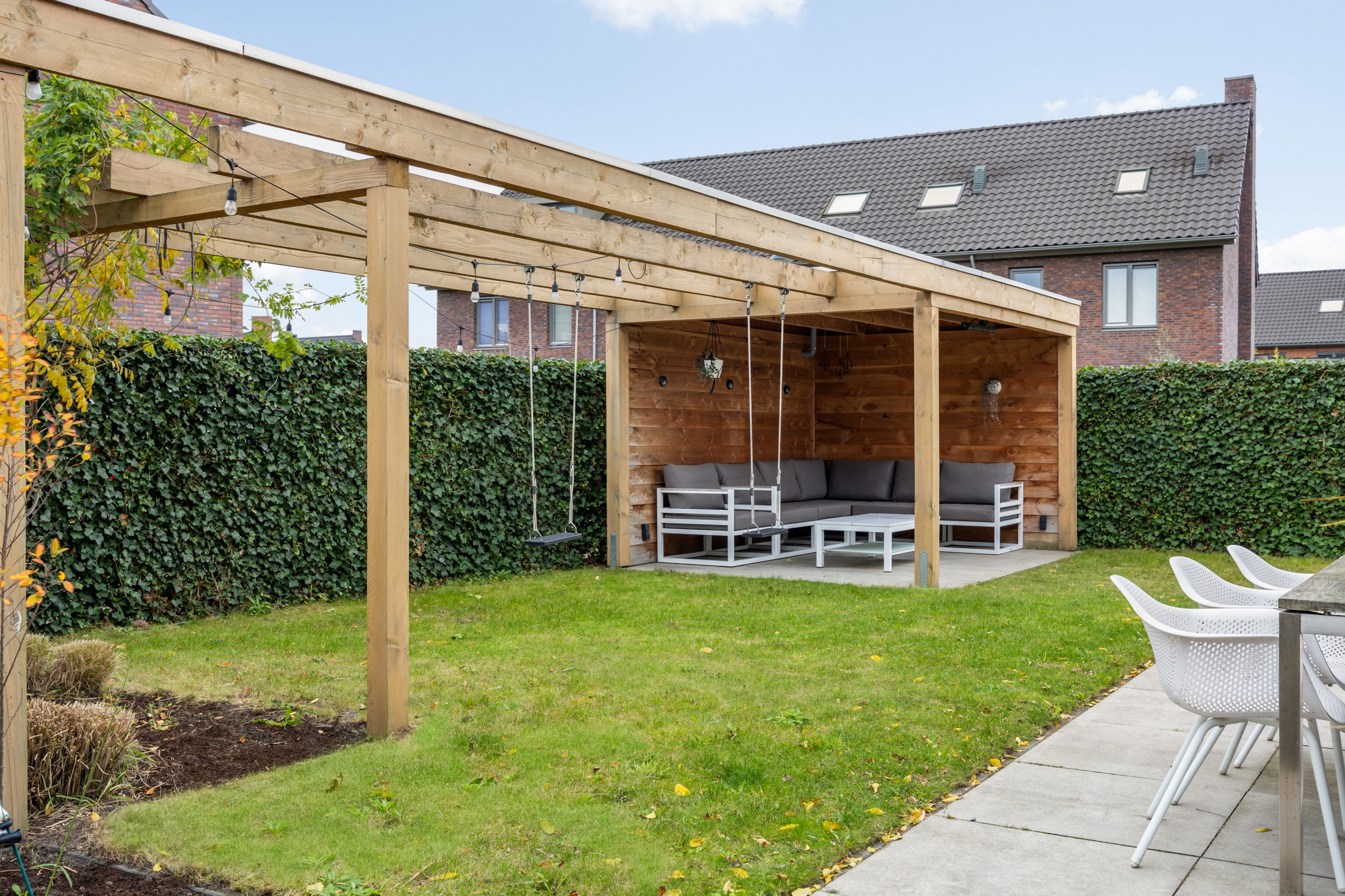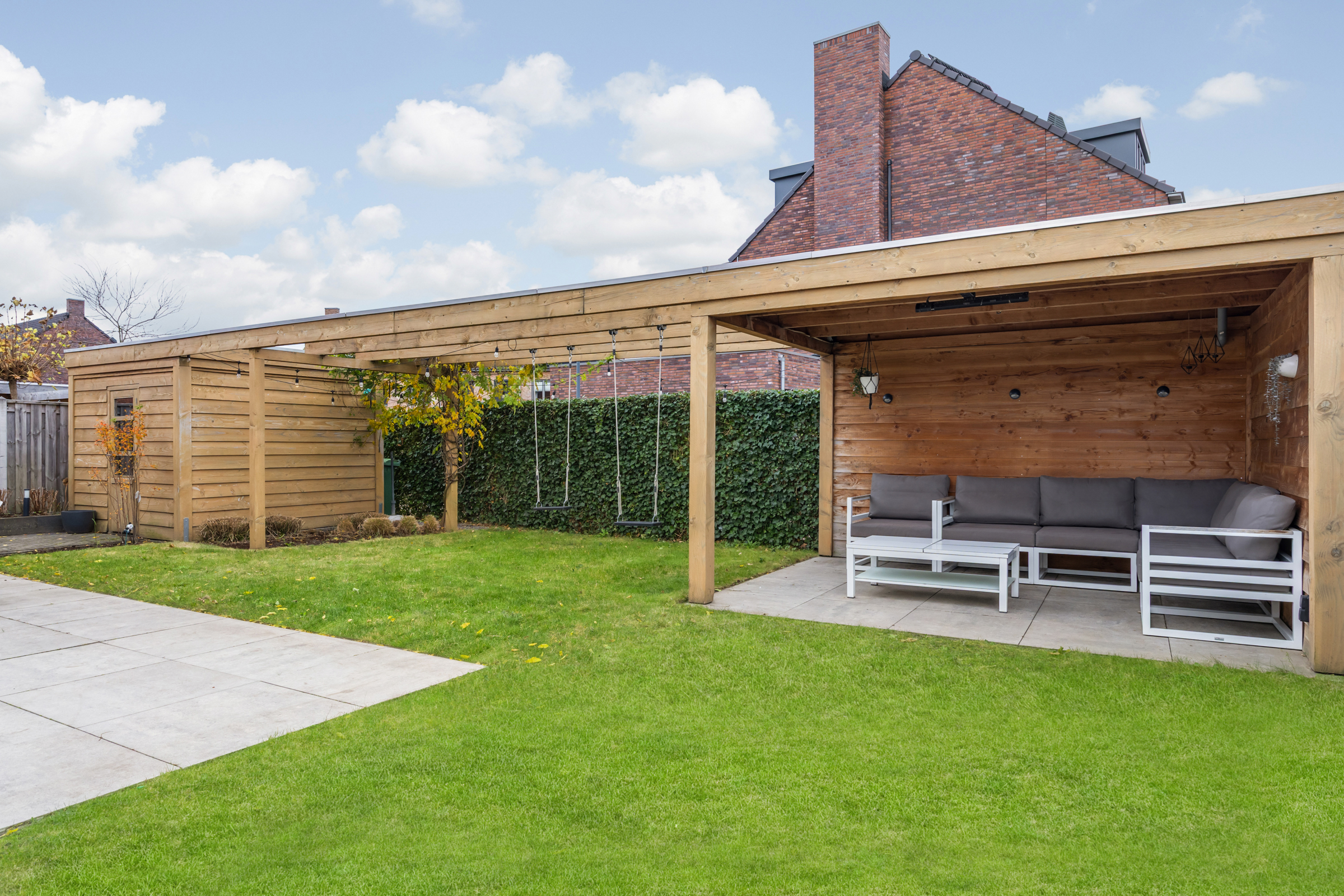 Via een matzwarte aluminium tweedelige schuifpui met openslaande deuren effect is er directe toegang tot de fraai aangelegde zonnige achtertuin.