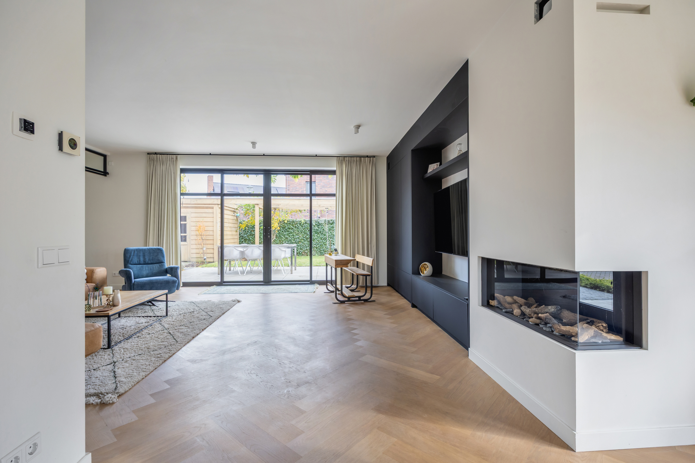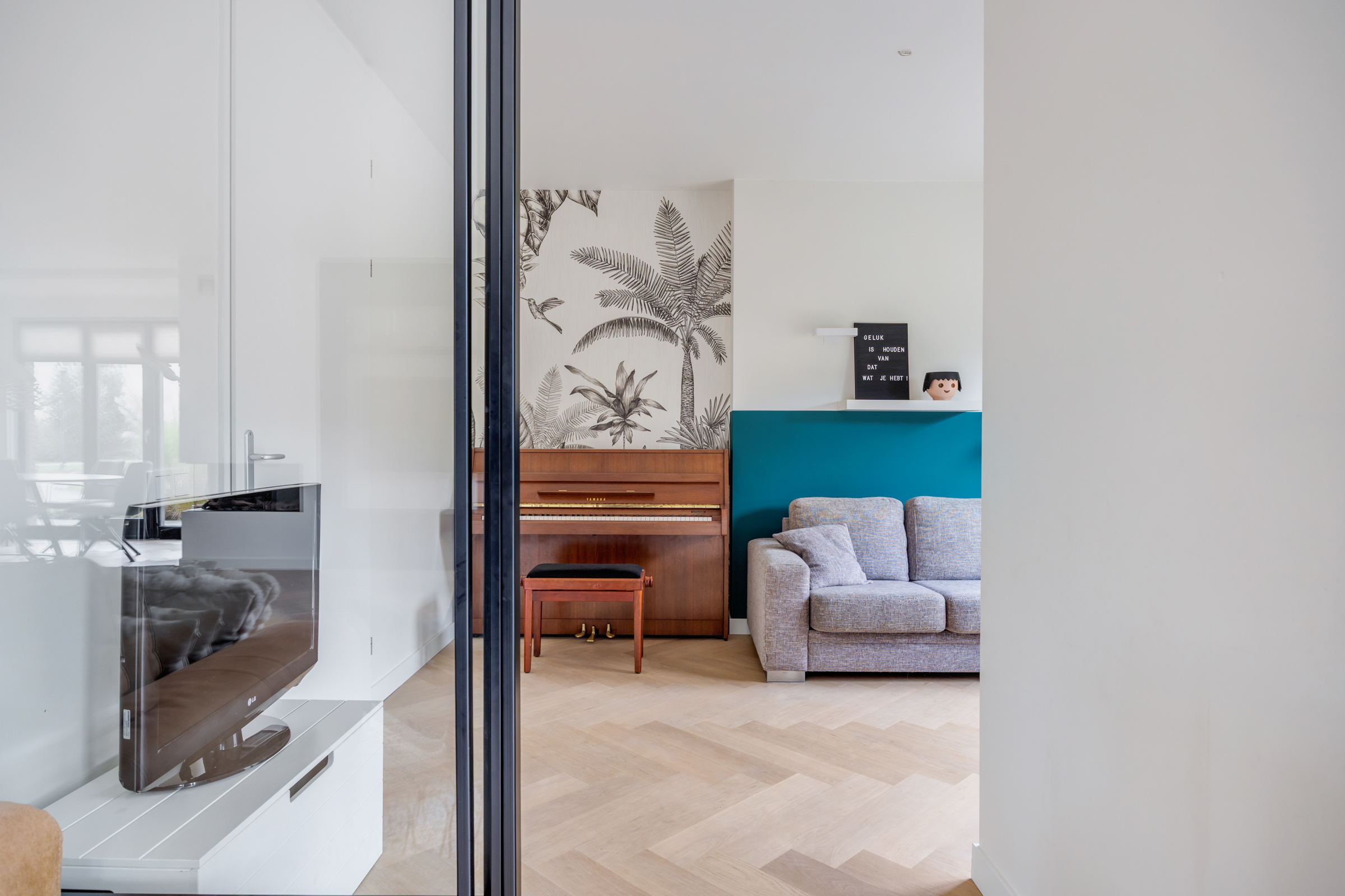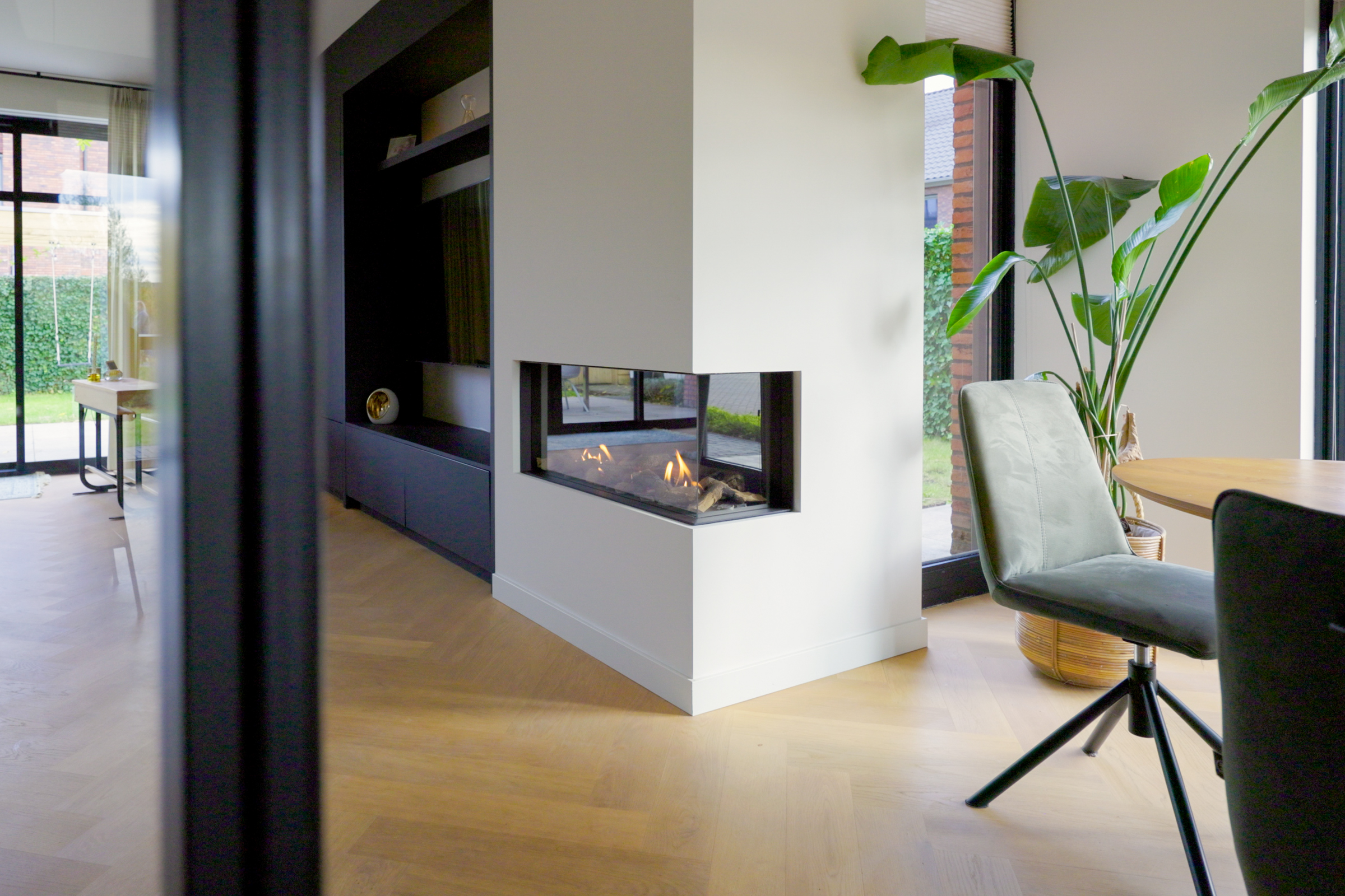 Naast de deur naar de woonkamer is extra kastruimte gecreëerd, eveneens afgesloten met een op maat vervaardigde stalen deur in dezelfde stijl. Dit subtiele detail zorgt voor een harmonieus geheel en biedt praktische bergruimte zonder afbreuk te doen aan het strakke design. De woonkamer zelf is een heerlijke, lichte leefruimte met grote raampartijen, een visgraat lamelparketvloer, strak gestuukte wanden en plafonds, een sfeervolle gashaard en een maatwerk tv-meubel met extra kastruimte van Stefan Martens Interieurbouw – een perfecte balans tussen elegantie en functionaliteit.