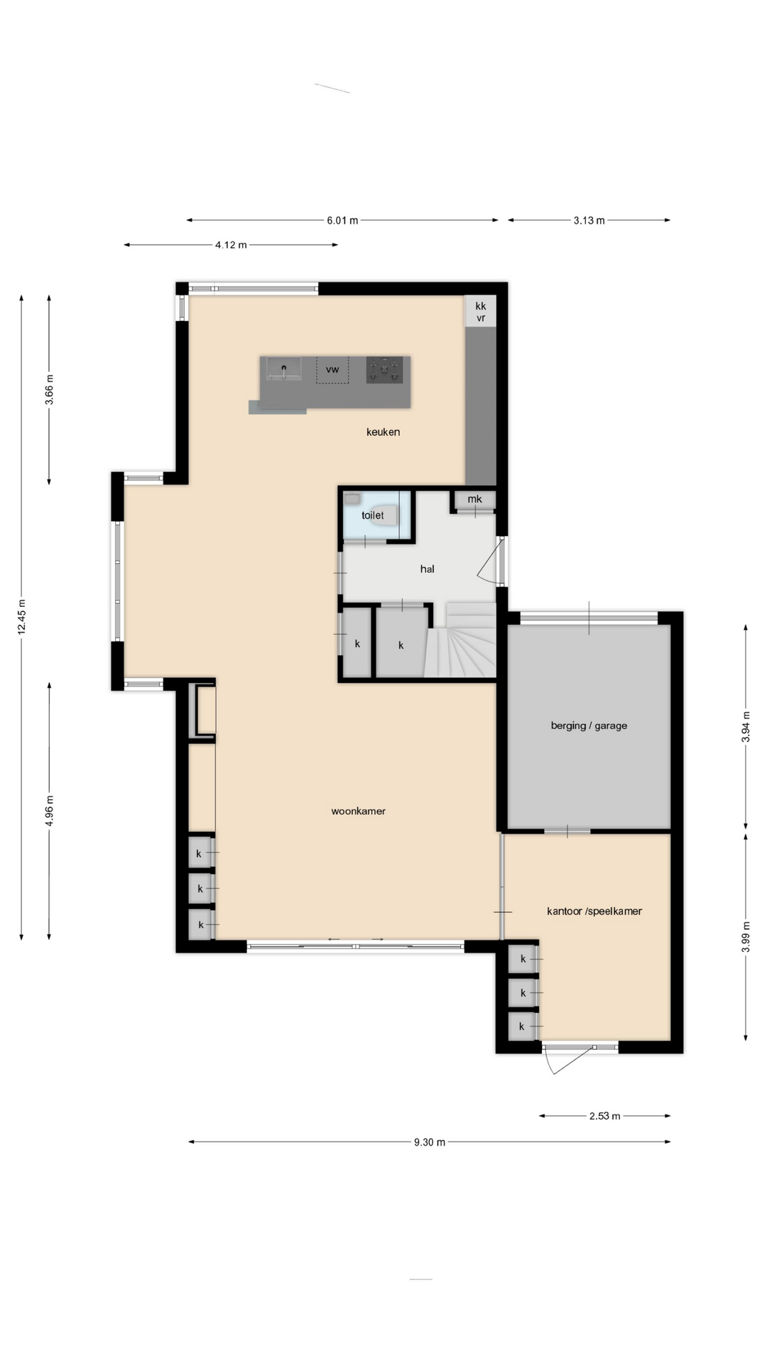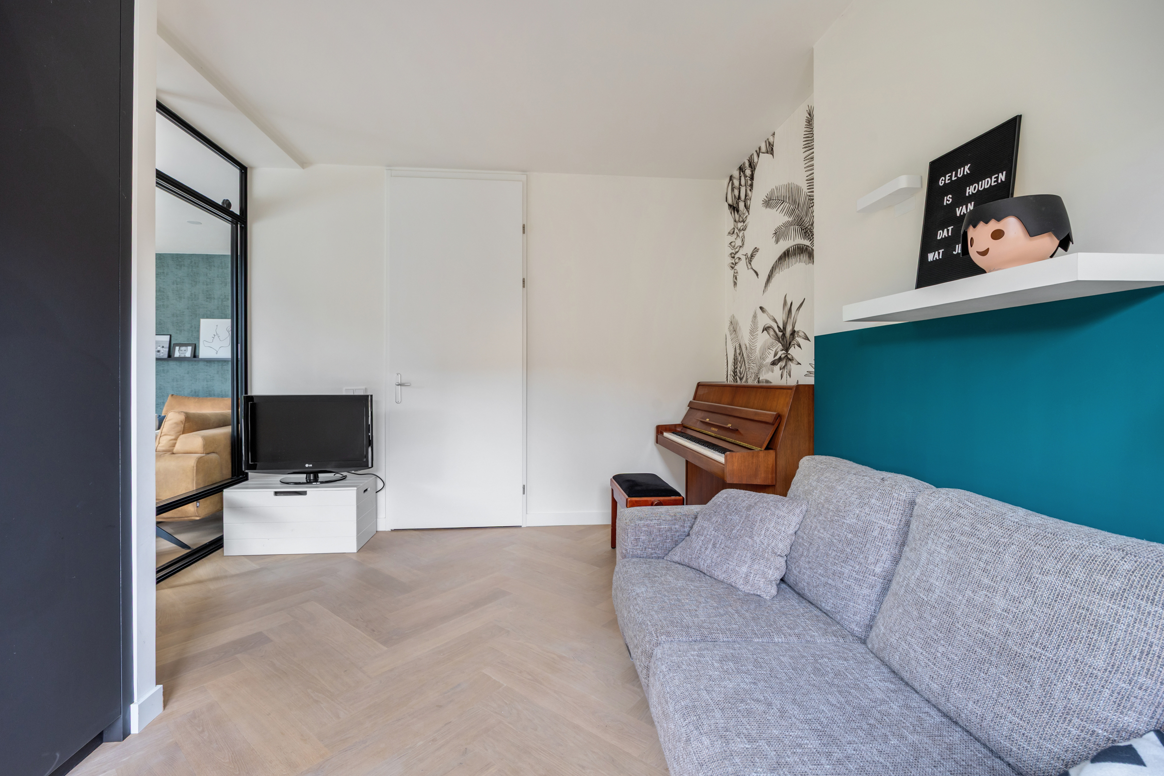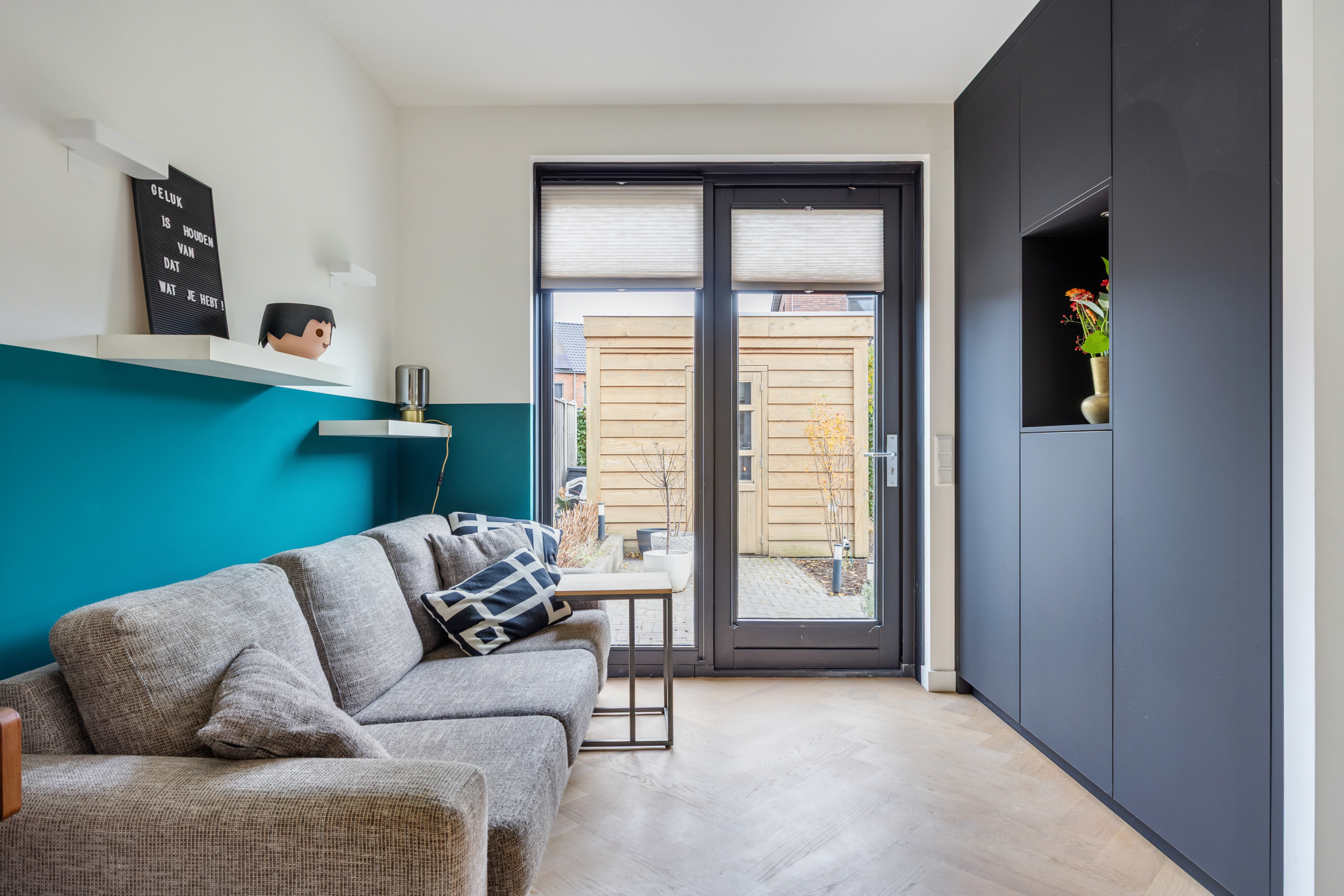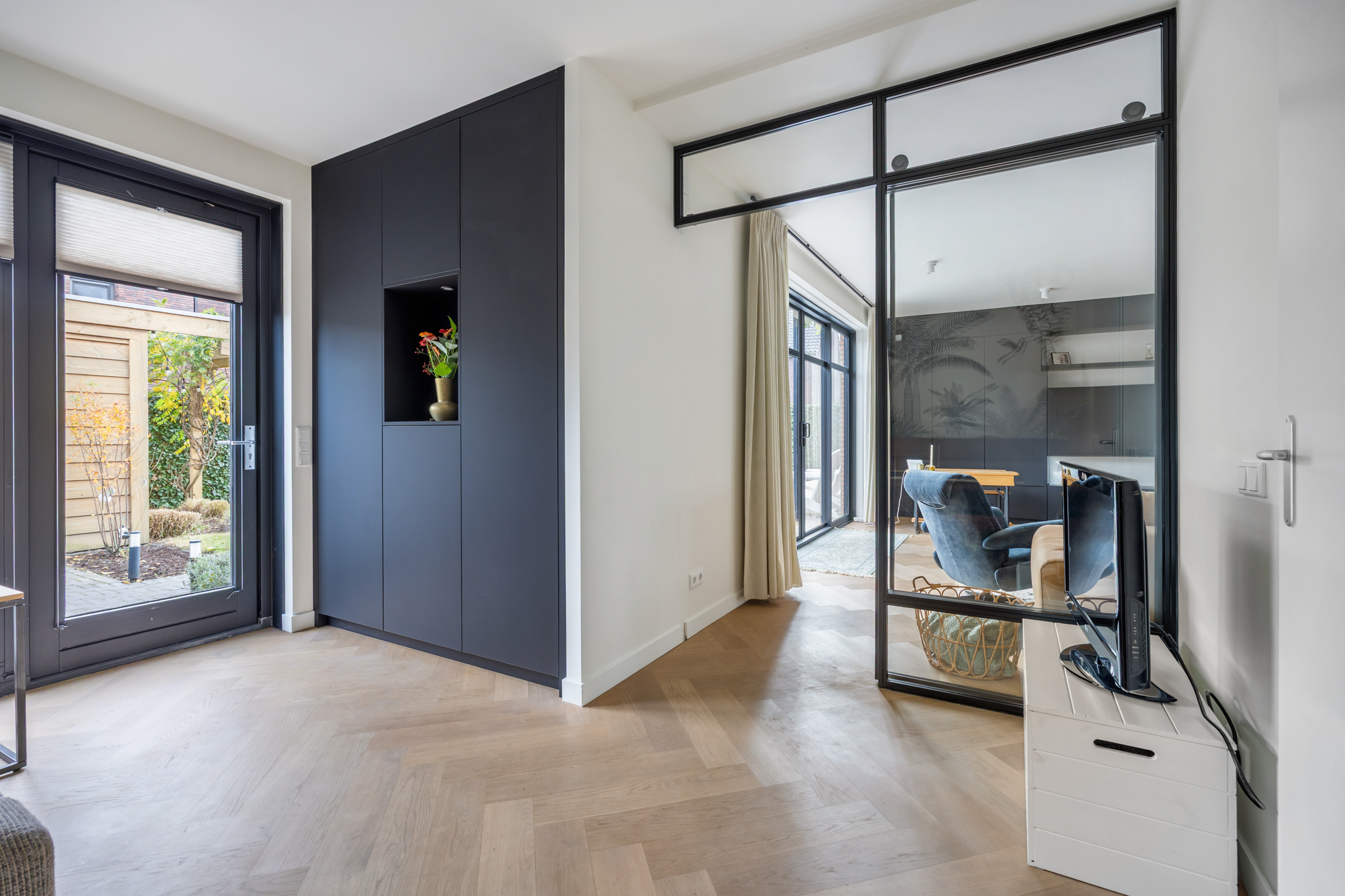 Tussen de woonkamer en de aangrenzende multifunctionele ruimte bevindt zich een maatwerk stalen schuifdeur in slank frame-werk met helder glas. De ruimte kan hierdoor worden afgesloten zonder licht en ruimtelijkheid te verliezen. Deze kamer is geschikt als kantoor, speelkamer of hobbyruimte, en beschikt over een maatwerk kastenwand en een eigen loopdeur naar de tuin. Vanuit hier is ook de inpandige berging/garage bereikbaar, voorzien van vloerverwarming, elektra en een roldeur naar de oprit.