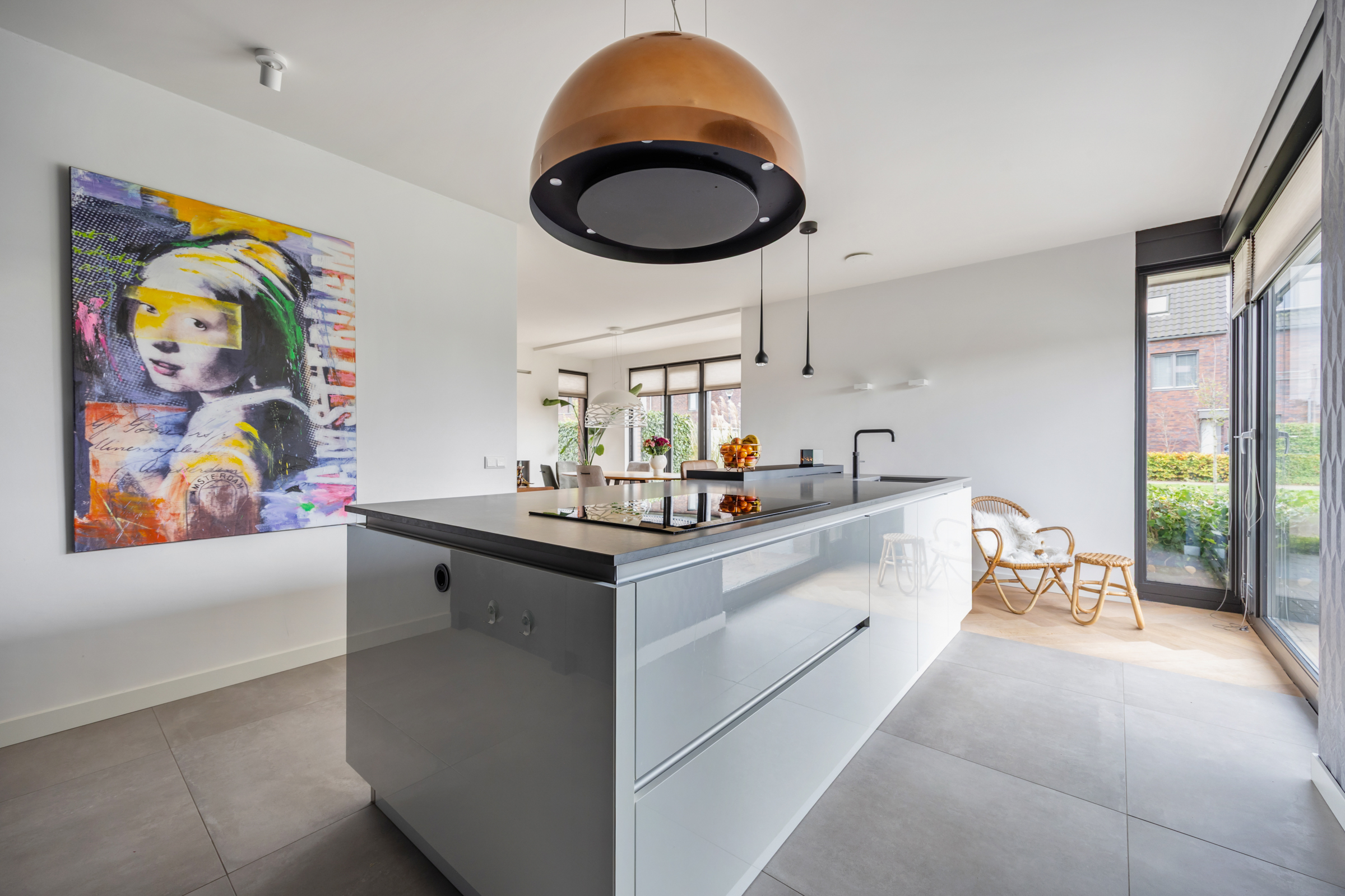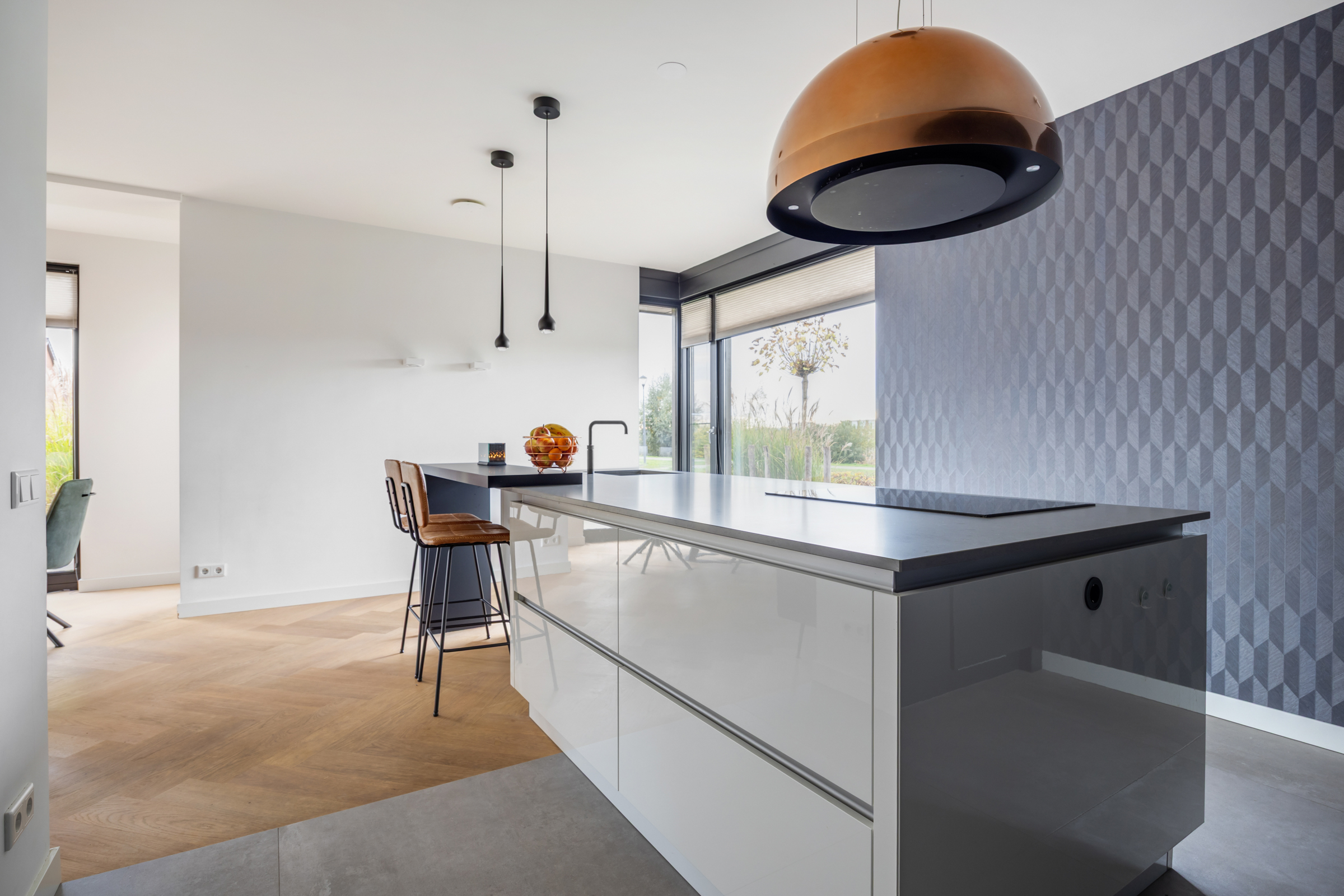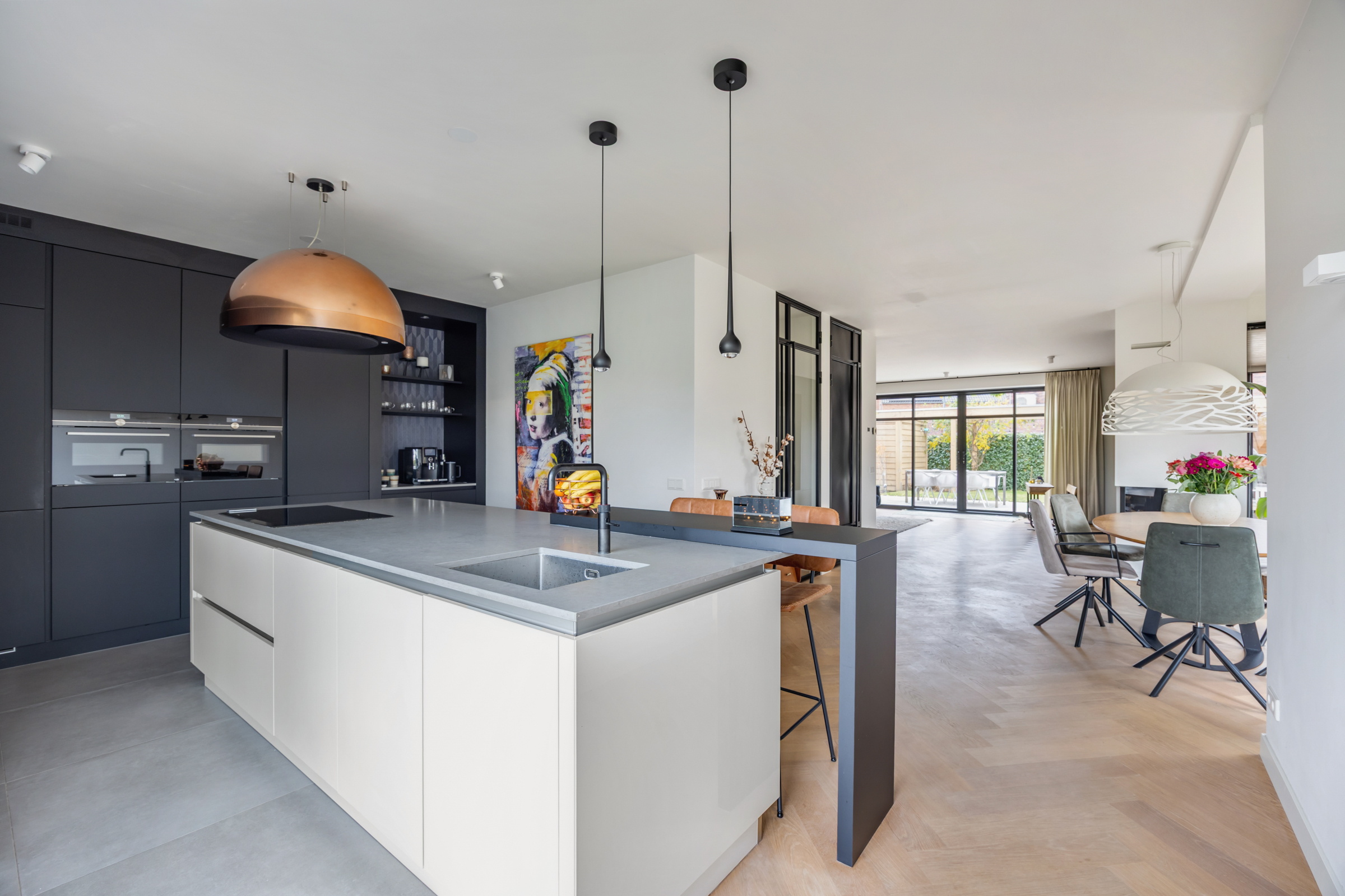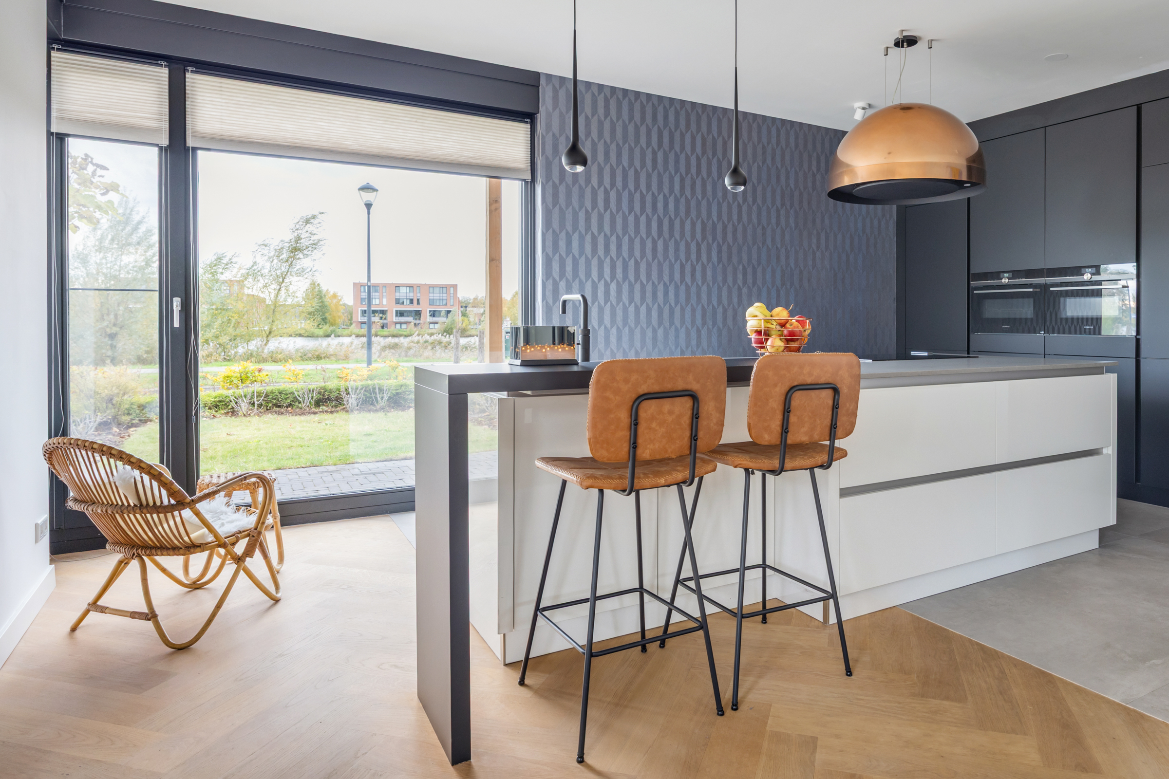 Aan de voorzijde van de woning ligt de moderne open keuken – een echte eyecatcher! Het royale kookeiland met composieten werkblad, RVS spoelbak, Quooker, Siemens vaatwasser, inductiekookplaat met design Wave-afzuigkap en verlichting vormt het hart van de ruimte. Het eiland biedt bovendien volop bergruimte (vier ruime lades, twee kasten) én een gezellige barfunctie met opnieuw een vrij uitzicht op het water.