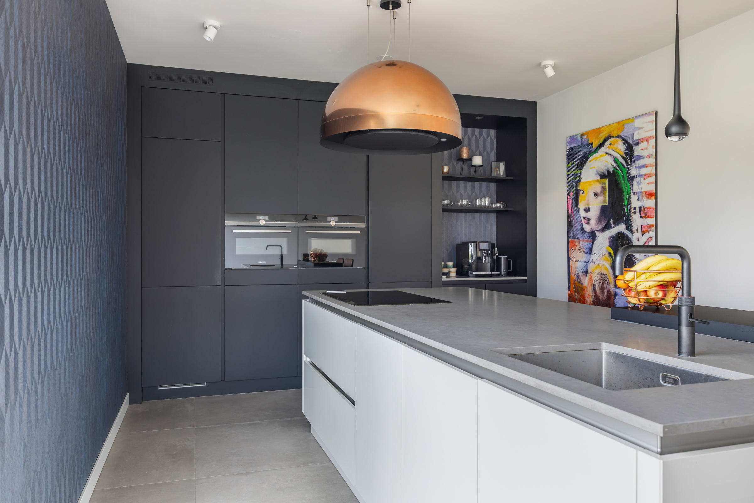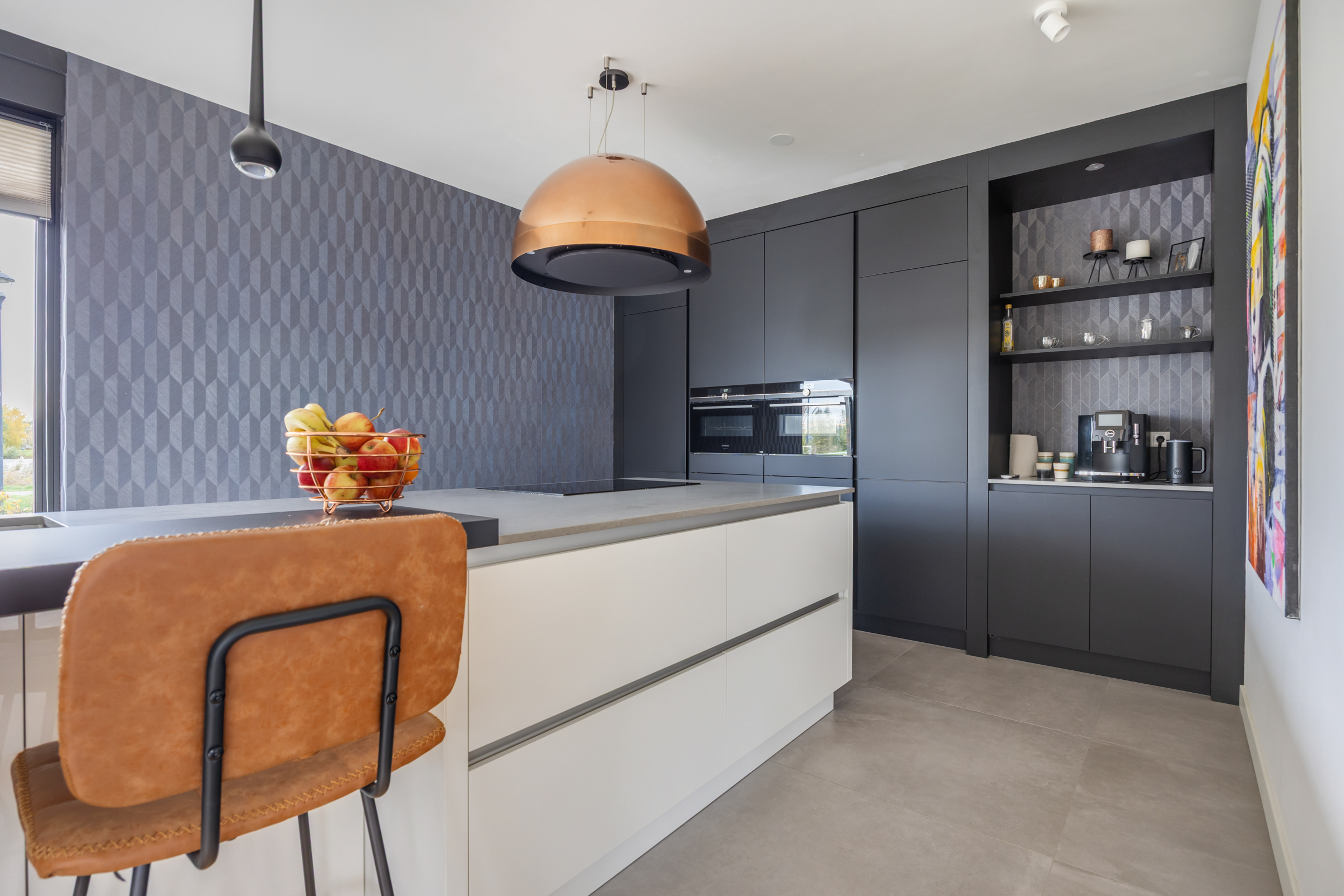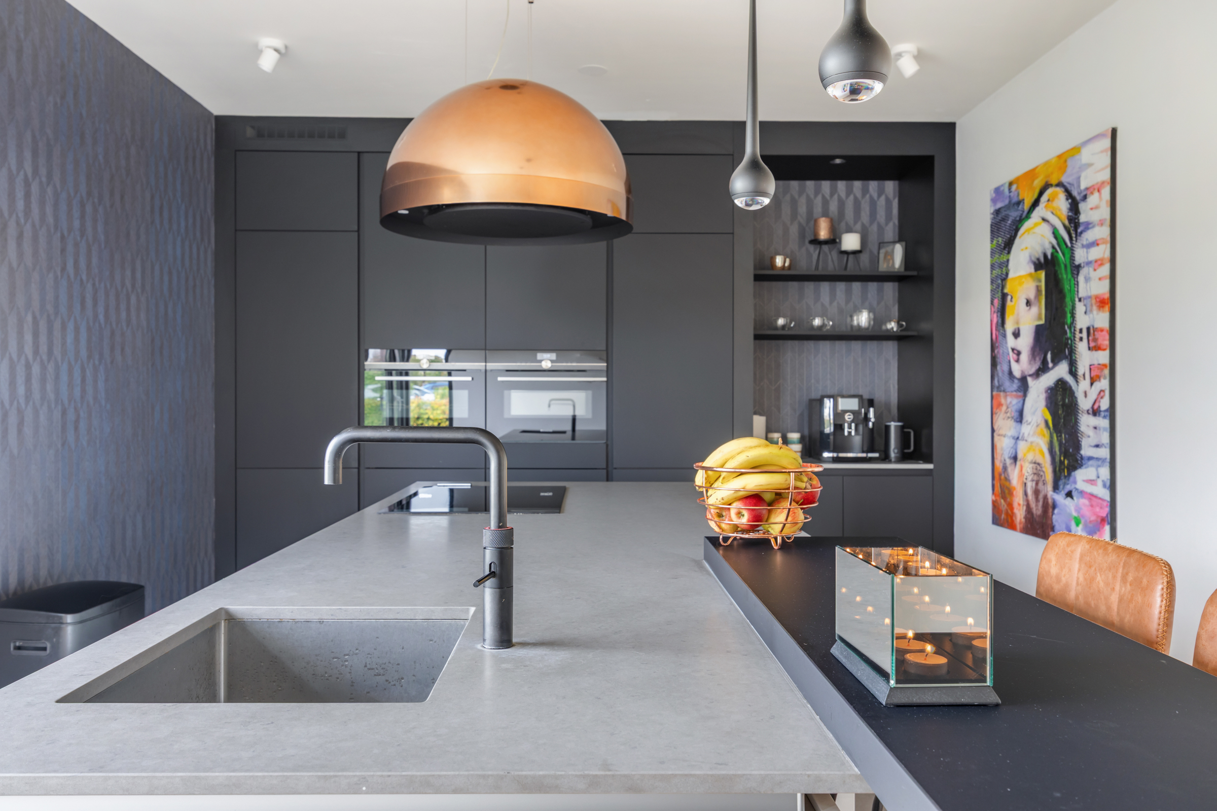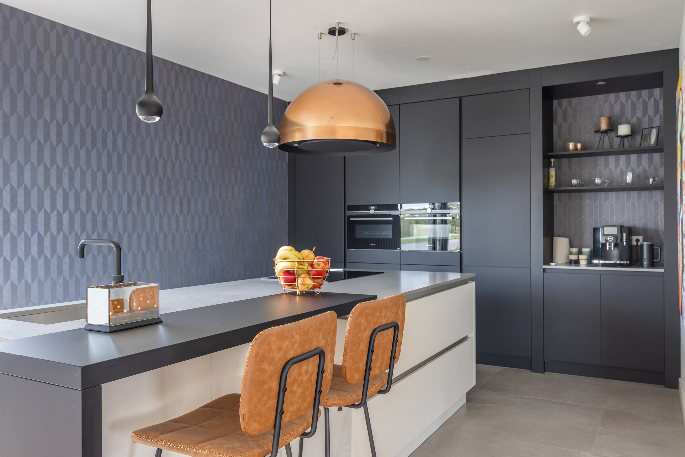 De maatwerk kastenwand in matzwart design is uitgerust met een inbouwkoelkast, vriezer, stoom- /heteluchtoven, combi-oven/magnetron en een praktische koffiecorner. Ook hier is extra opbergruimte slim geïntegreerd.