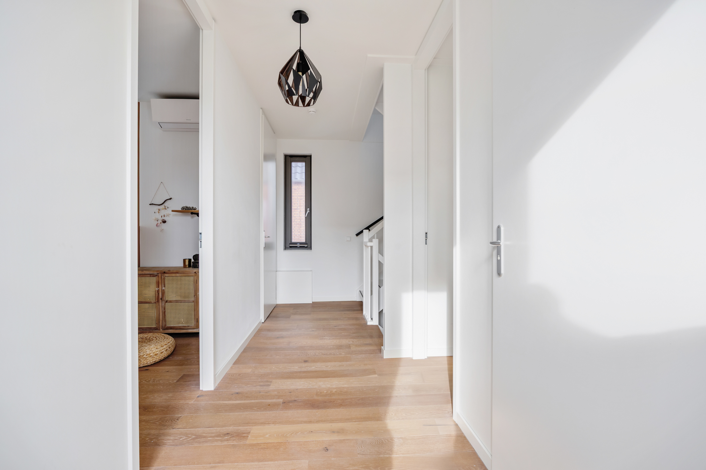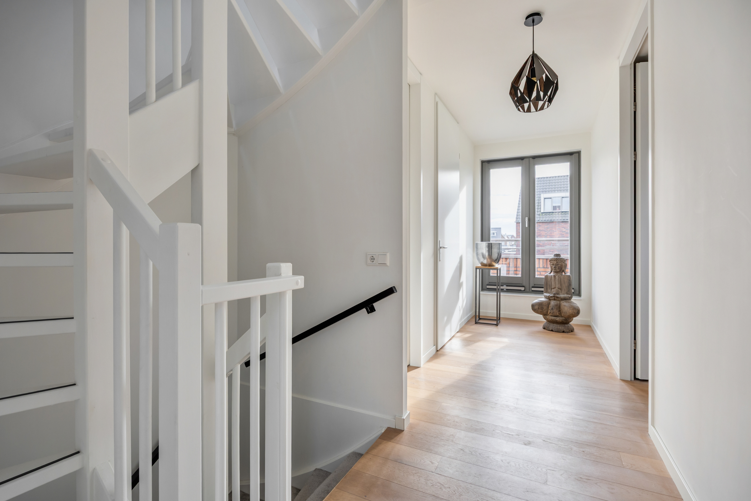 Ruime overloop met fraaie lamelparketvloer, strak gestuukte wanden en plafonds en een trapopgang naar de tweede verdieping. Vanaf hier is er toegang tot twee slaapkamers, een moderne badkamer, een separate toiletruimte en het balkon.