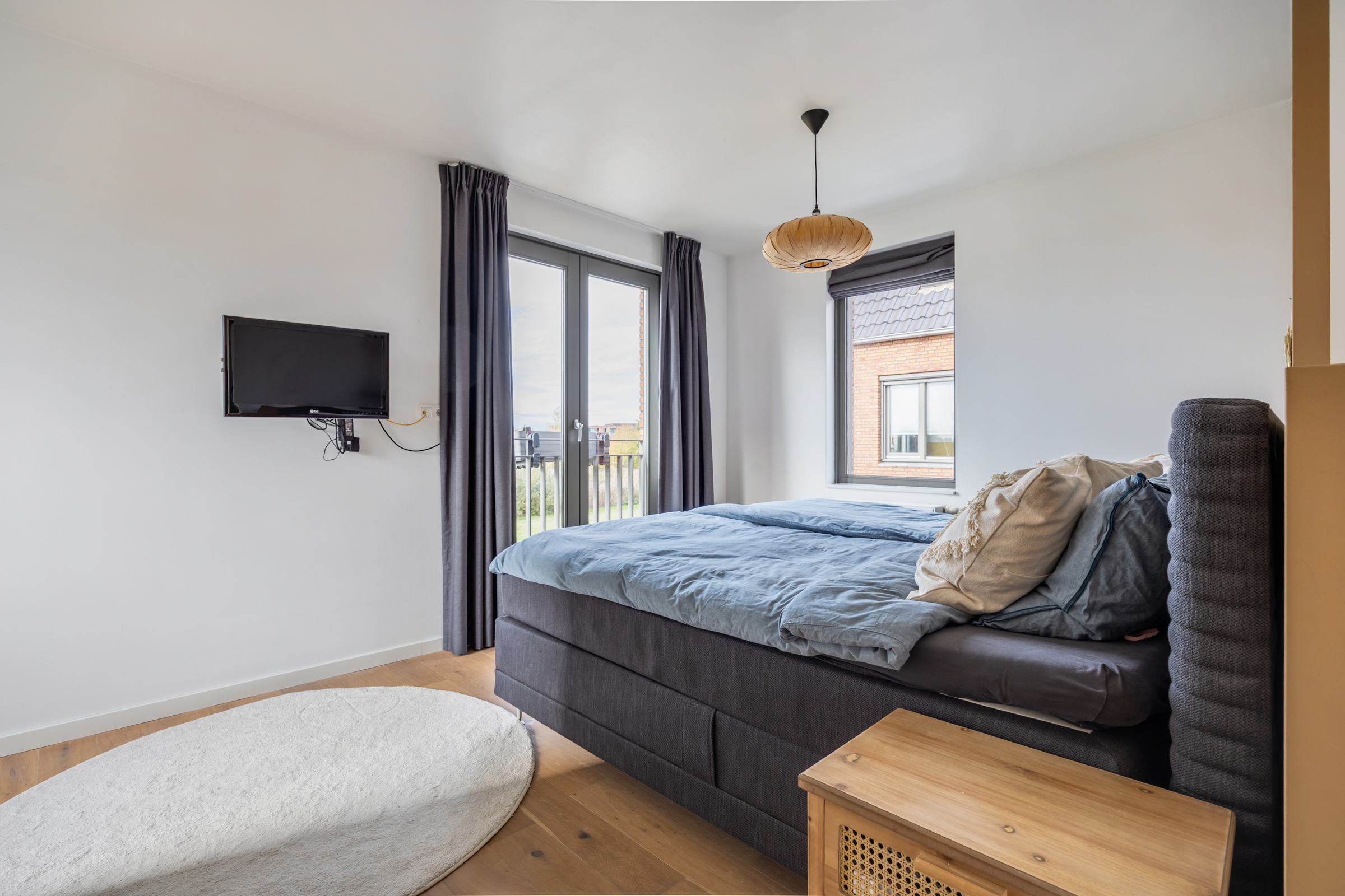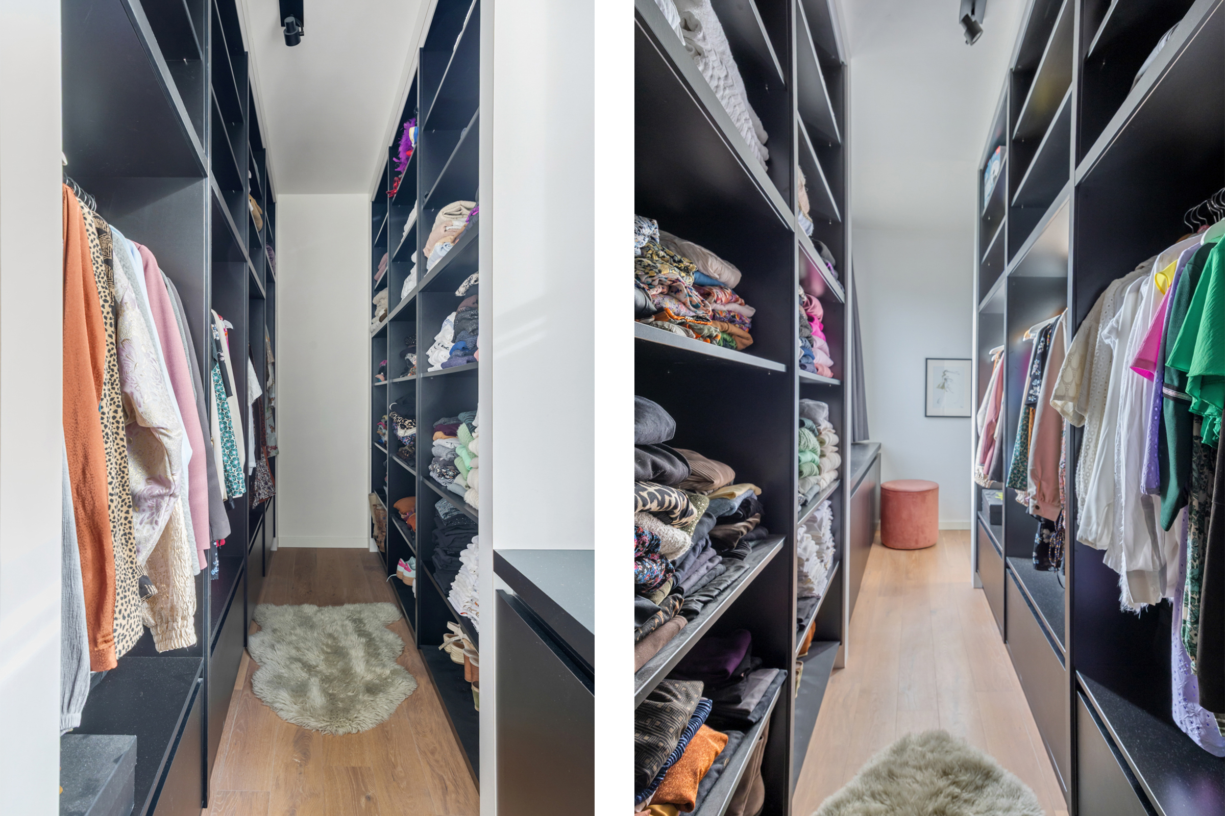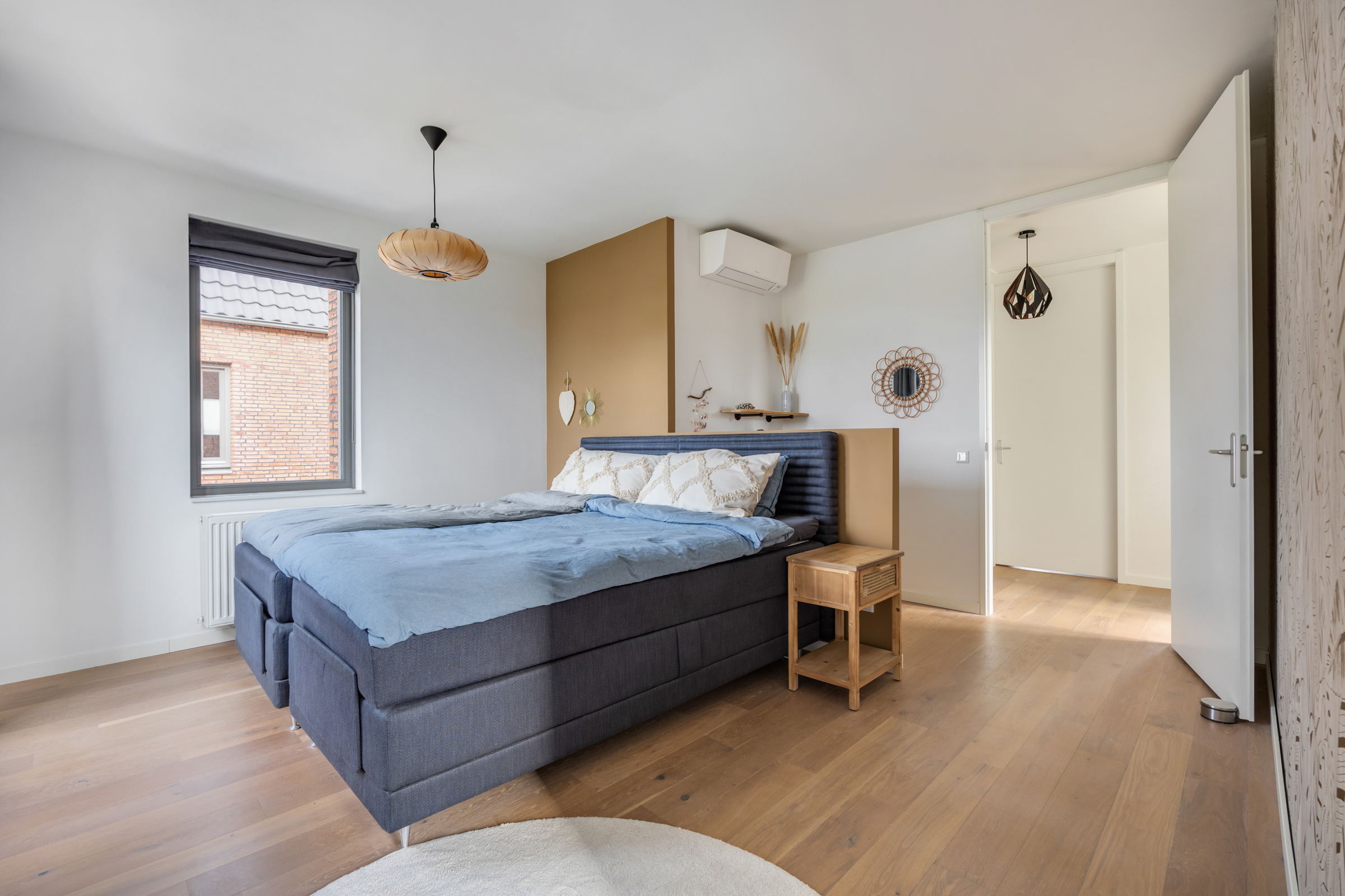 De masterbedroom, gelegen aan de voorzijde van de woning, is een stijlvolle en rustgevende ruimte met lamelparketvloer, strak gestuukte wanden en plafond en een ruime walk-in-closet met volop maatwerk kastruimte voorzien van hang- en leggedeeltes – een droom voor liefhebbers van overzicht en luxe. Voor extra comfort is de kamer uitgerust met airconditioning, zodat het er in elk seizoen heerlijk verblijven is.