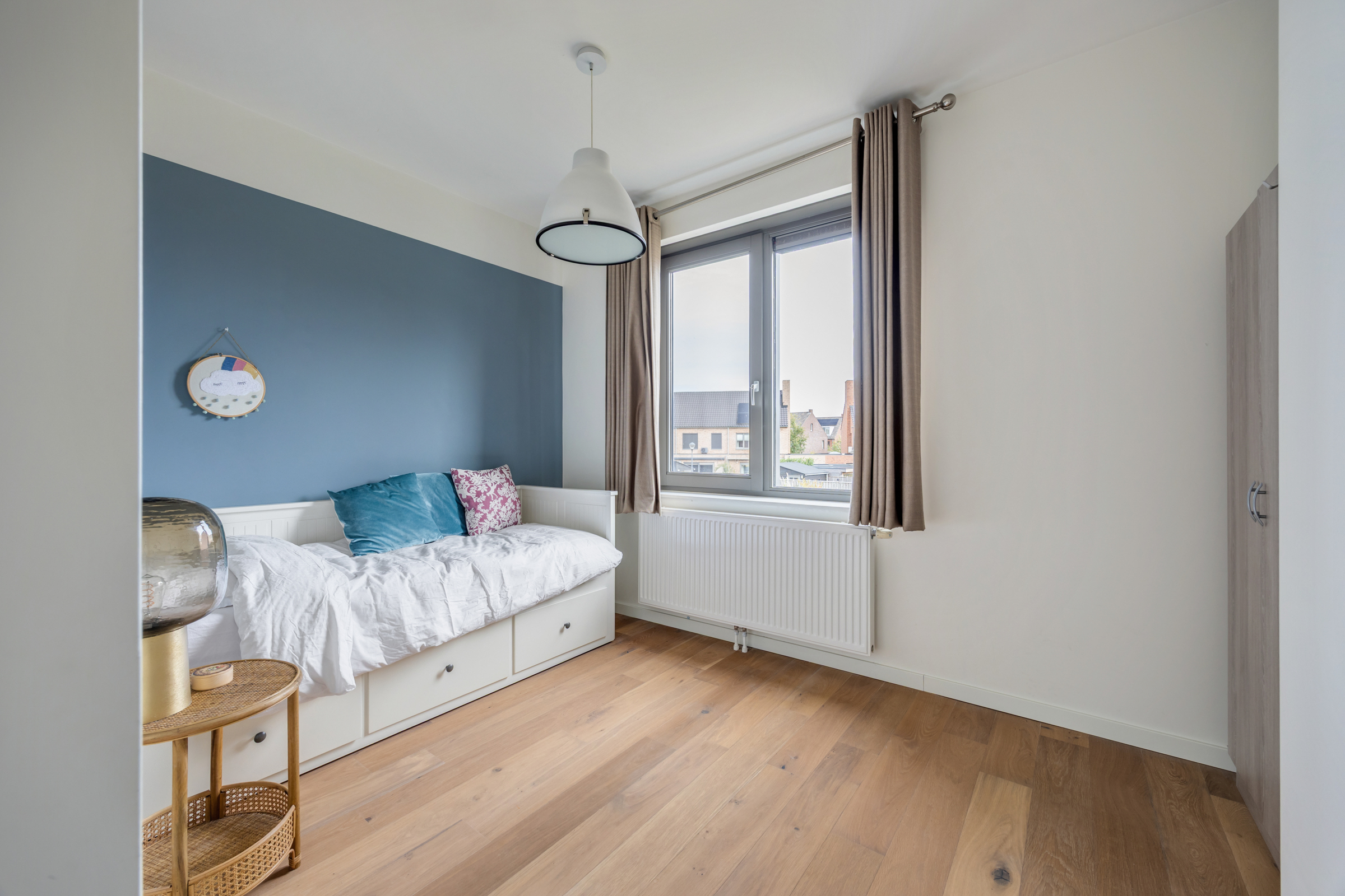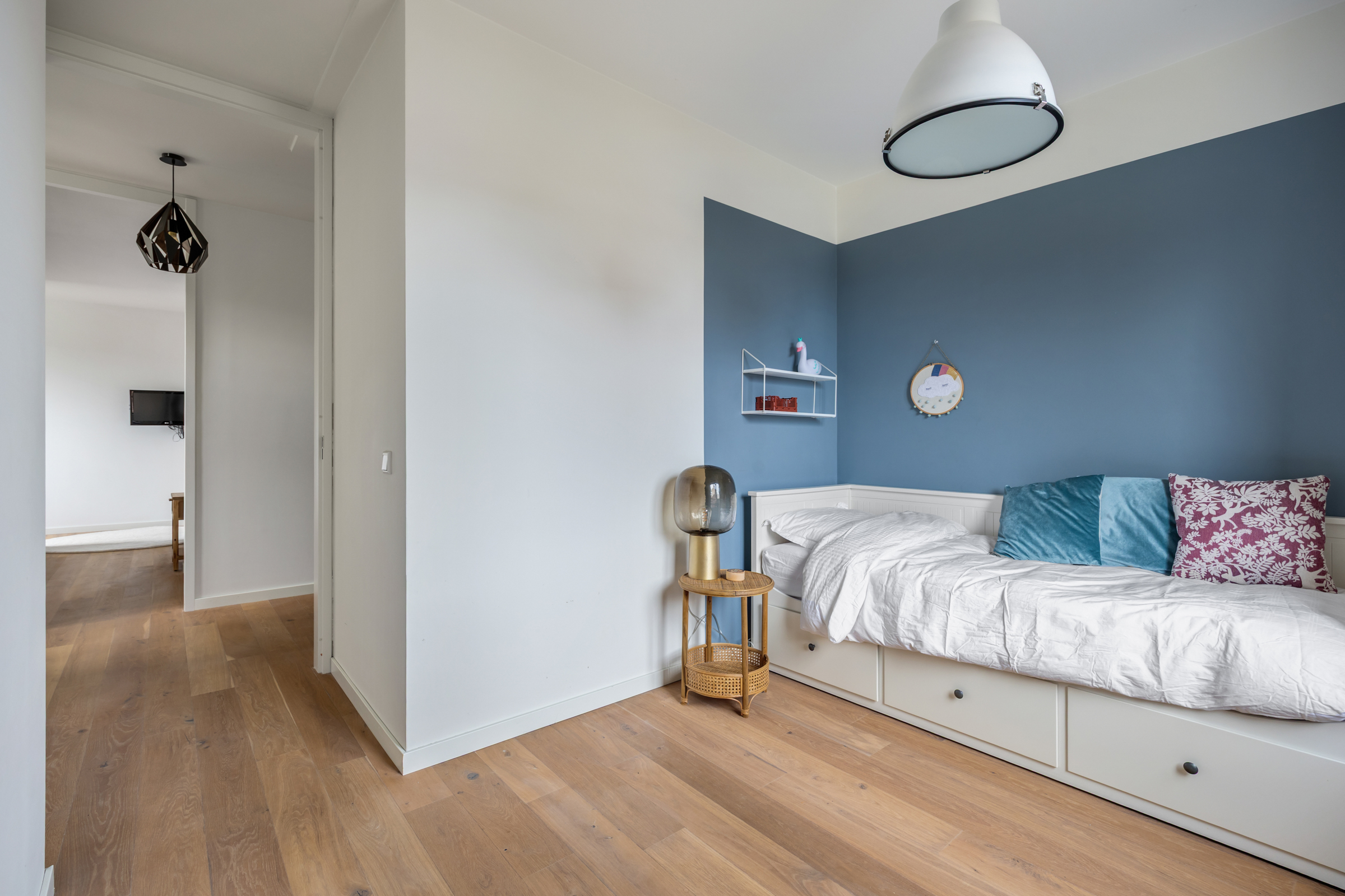 De tweede slaapkamer, gesitueerd aan de achterzijde van de woning, heeft dezelfde hoogwaardige afwerking met een lamelparketvloer en strak gestuukte wanden en plafond.