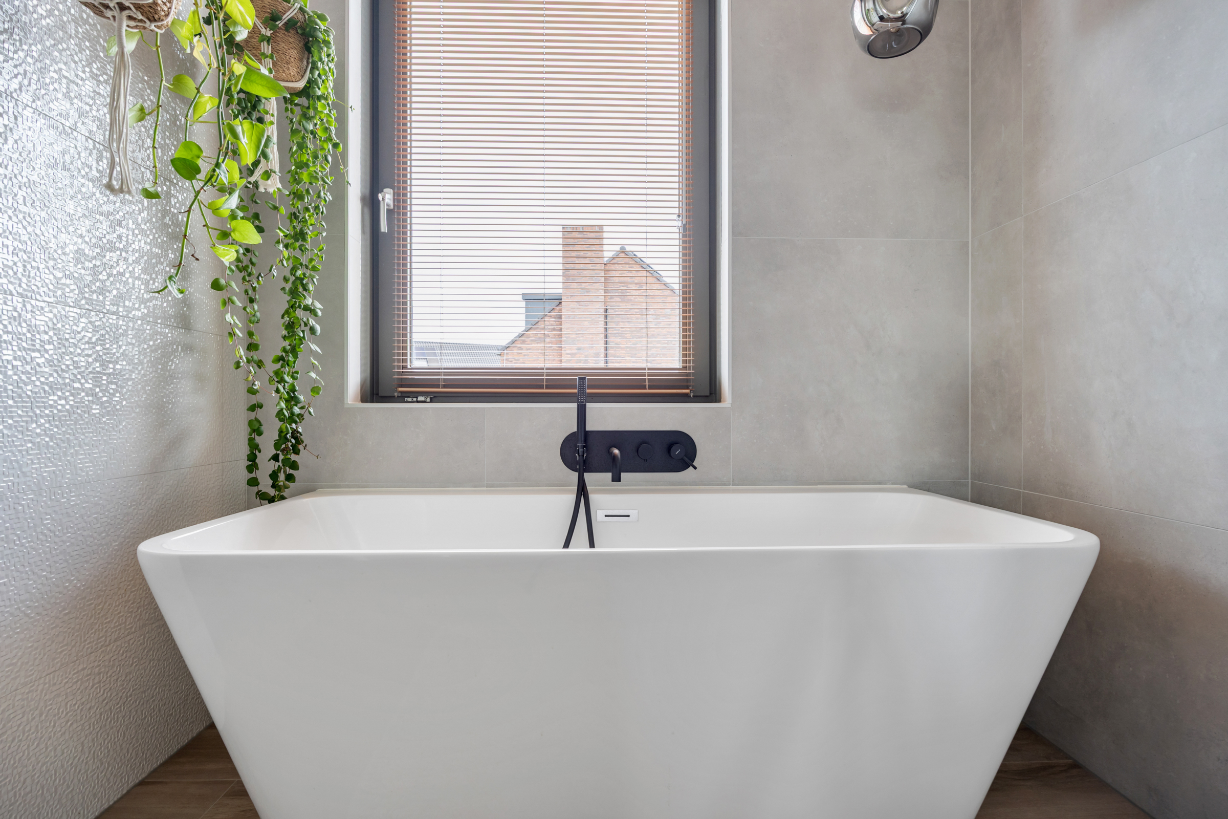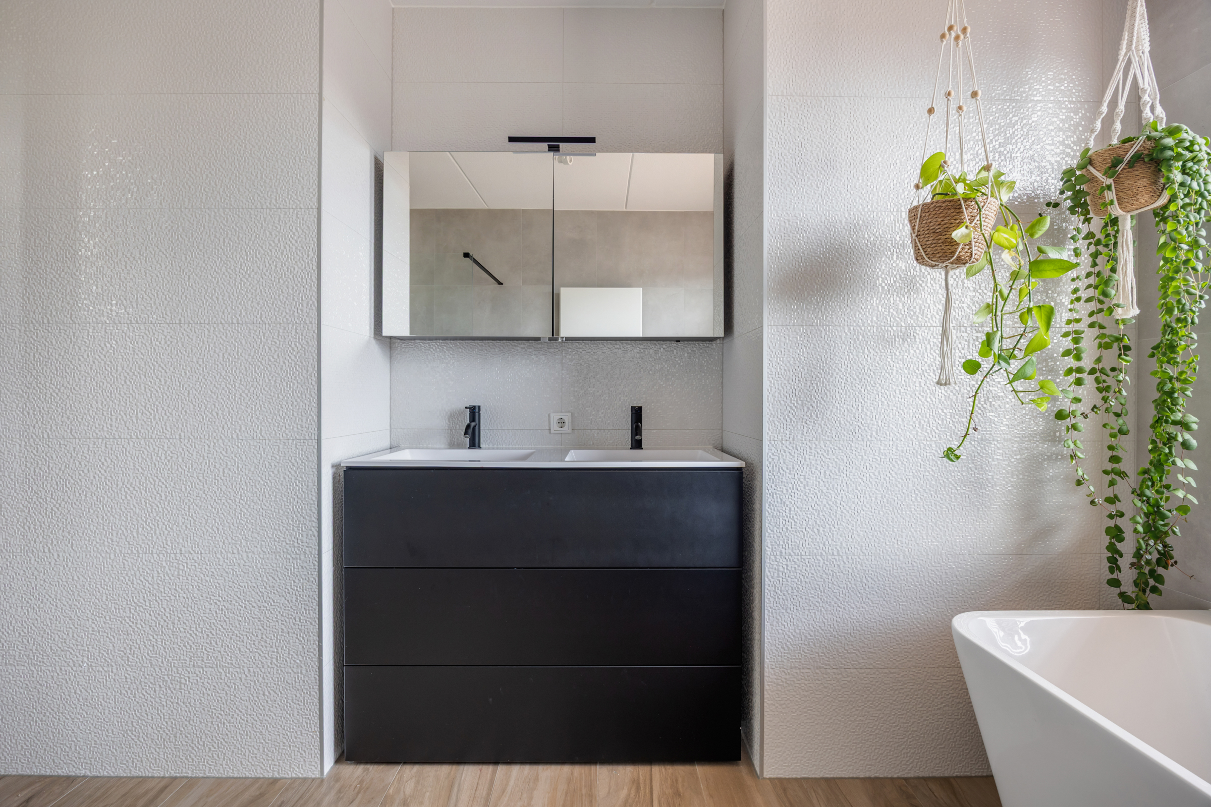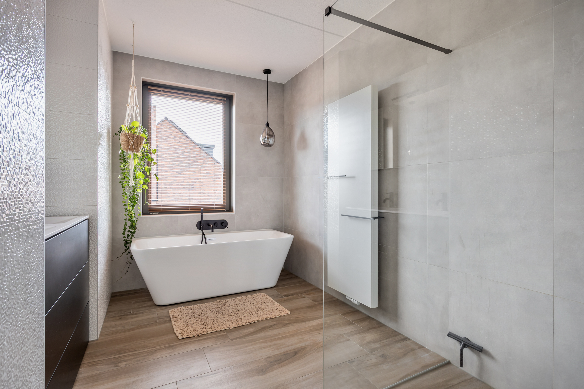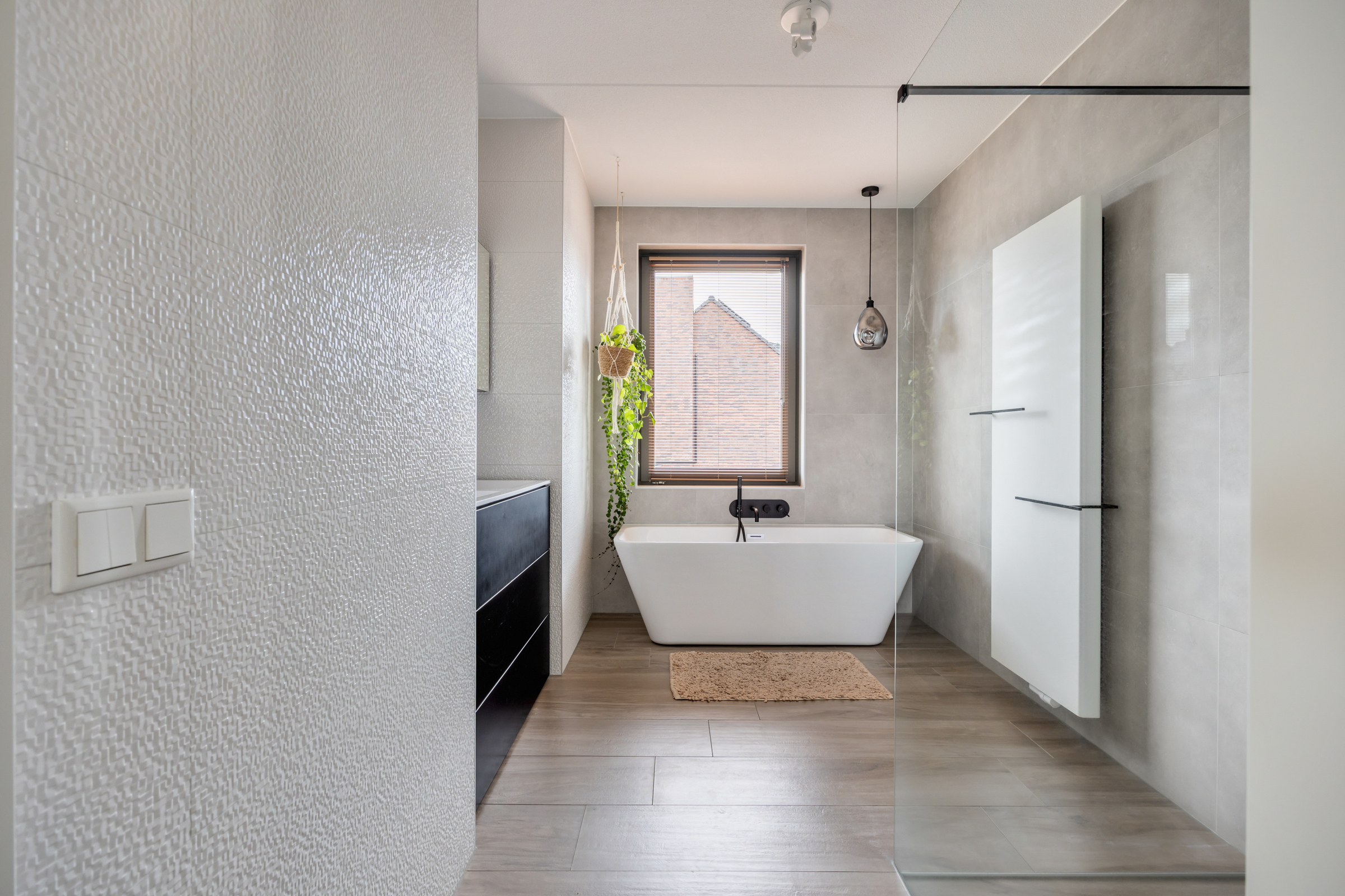 De badkamer is luxe en stijlvol ingericht met een vrijstaand ligbad, royale inloopdouche met zwart designkraanwerk, dubbel wastafelmeubel met spiegelkast en een designradiator – een ruimte die aanvoelt als een privé-spa