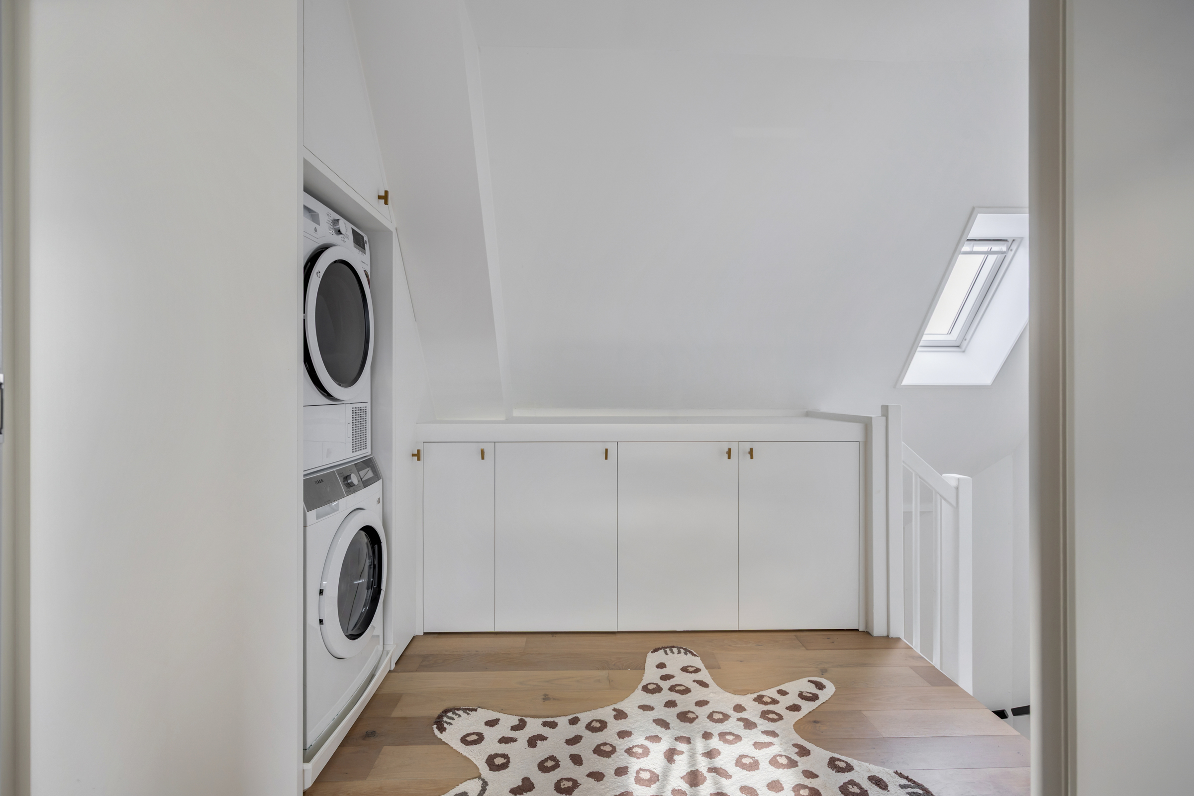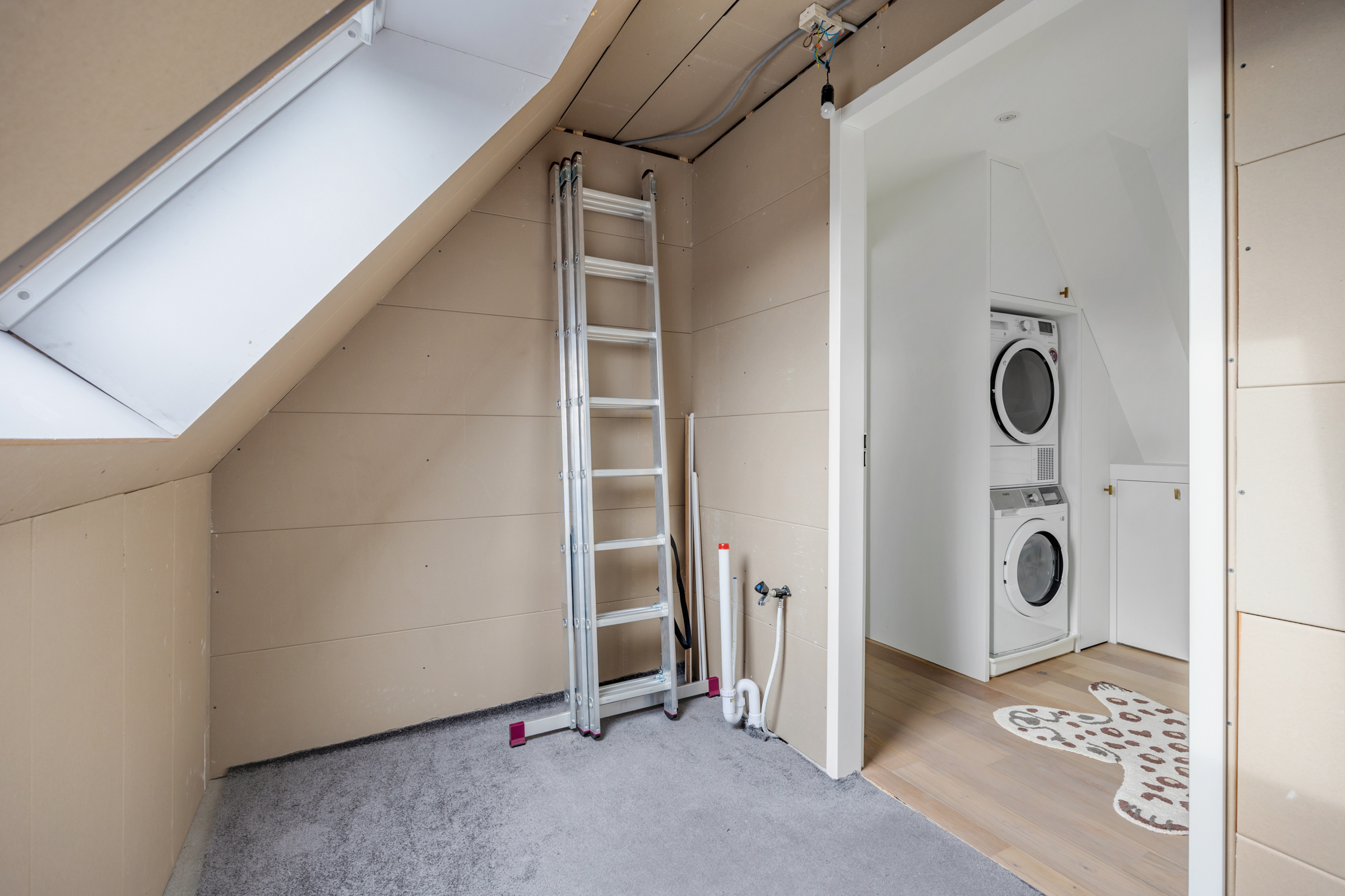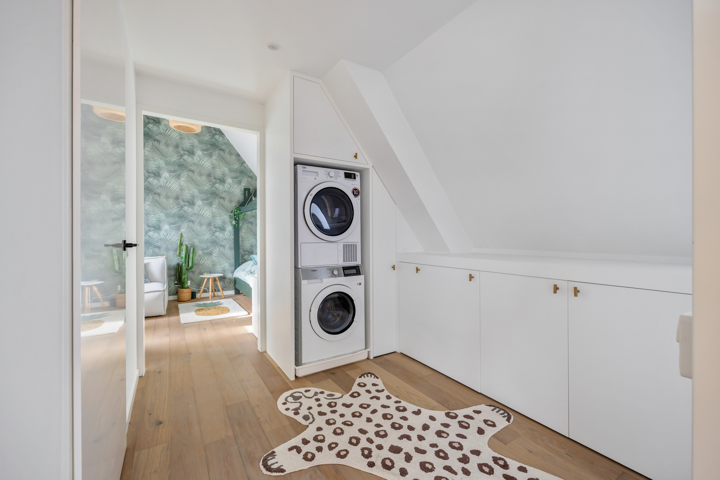 Fijne en lichte overloop met praktische inbouwkasten en opstelplaats voor wasmachine en droger. Vanuit de overloop is er toegang tot twee ruime slaapkamers en een extra berging, die al is voorbereid voor de realisatie van een tweede badkamer.