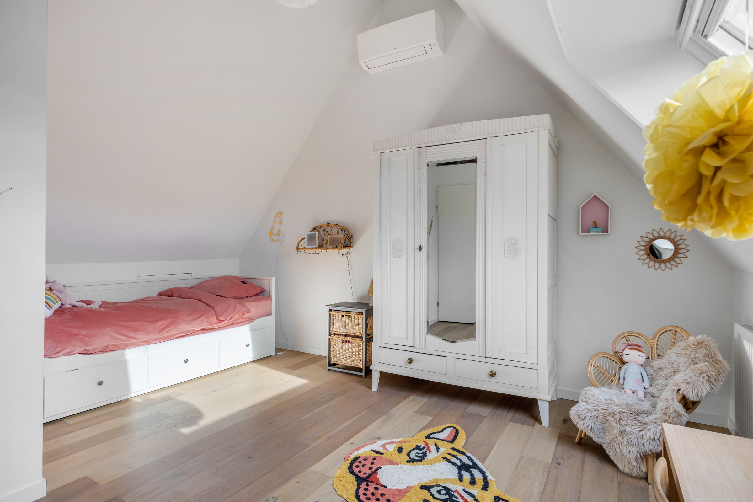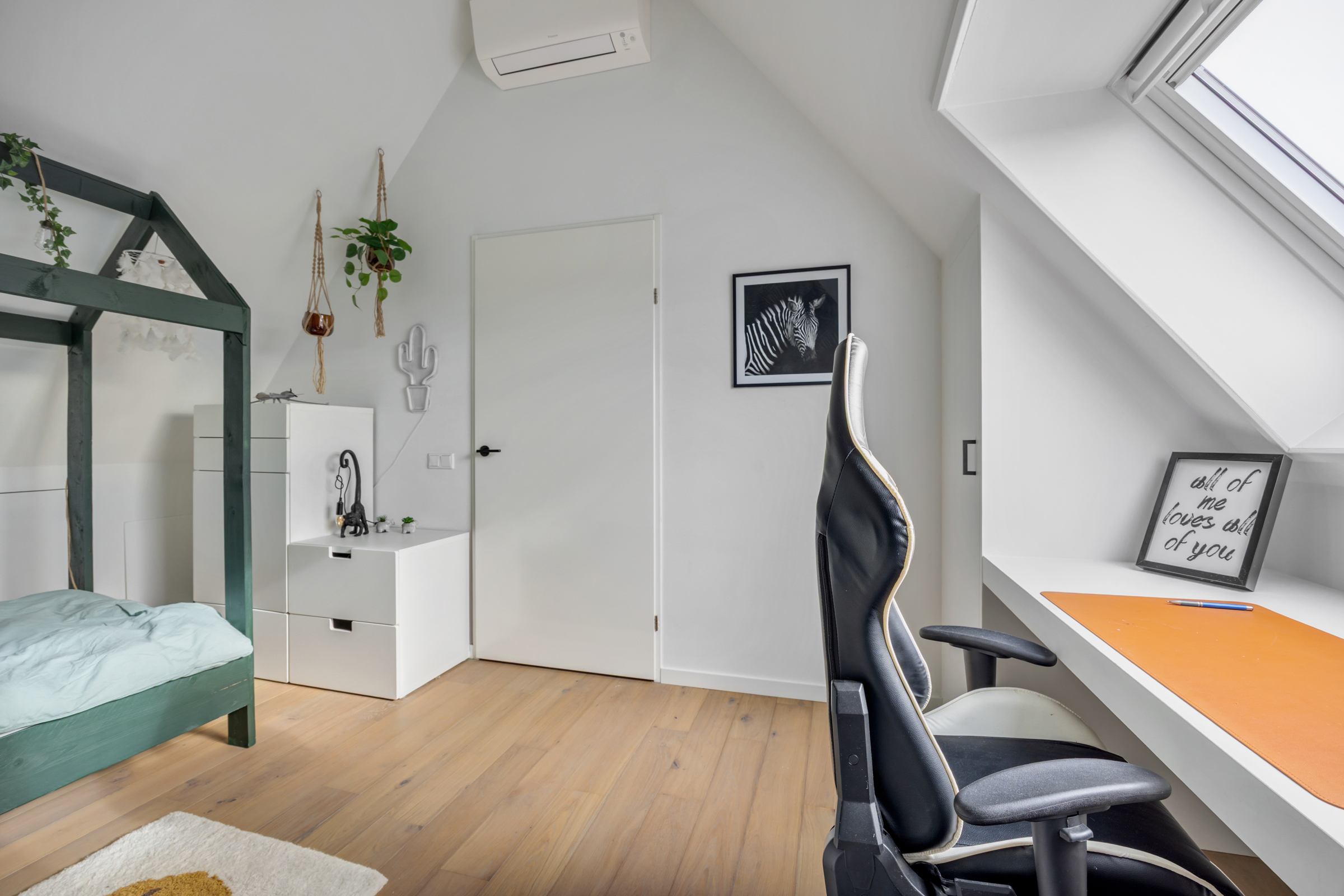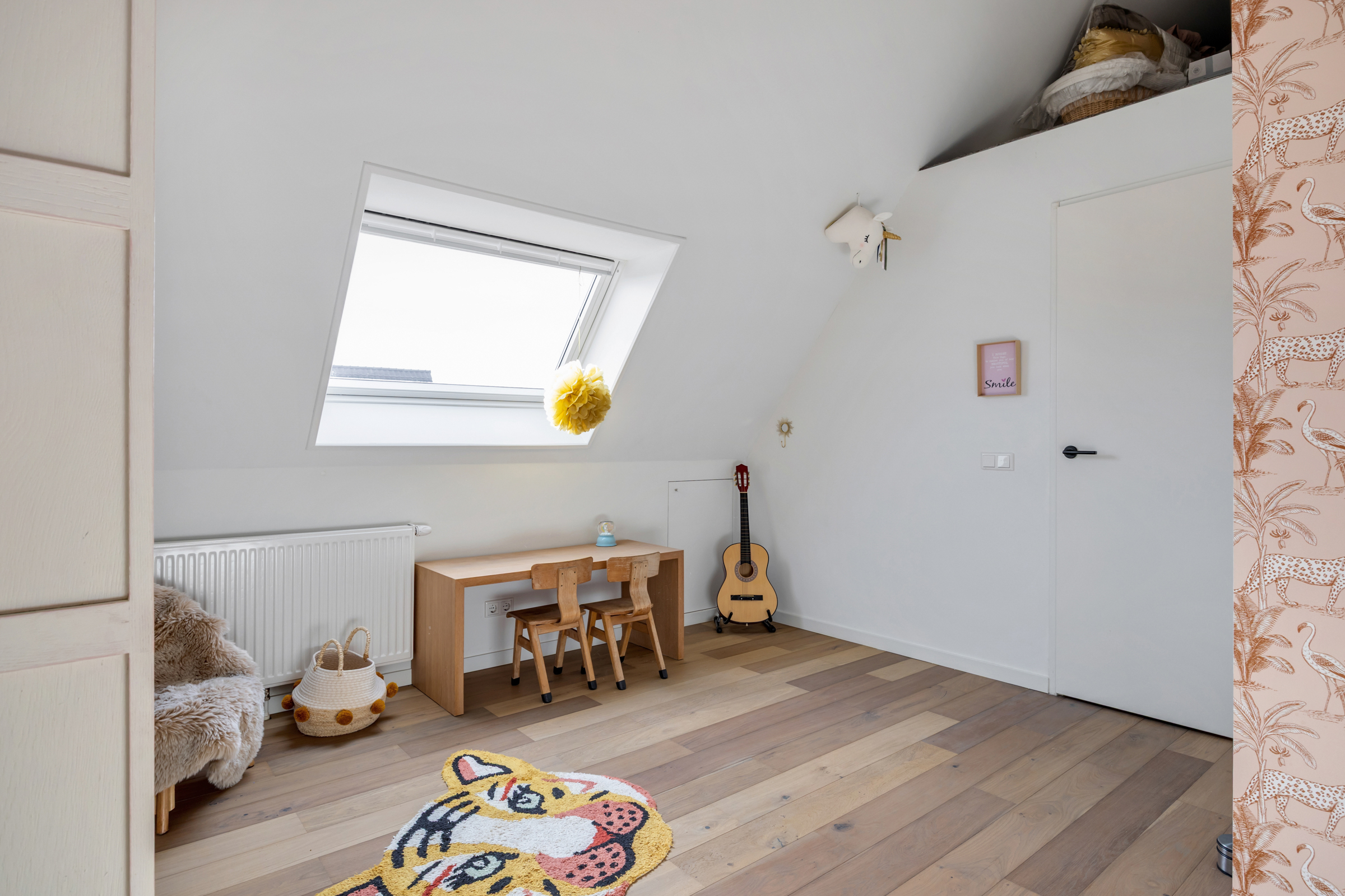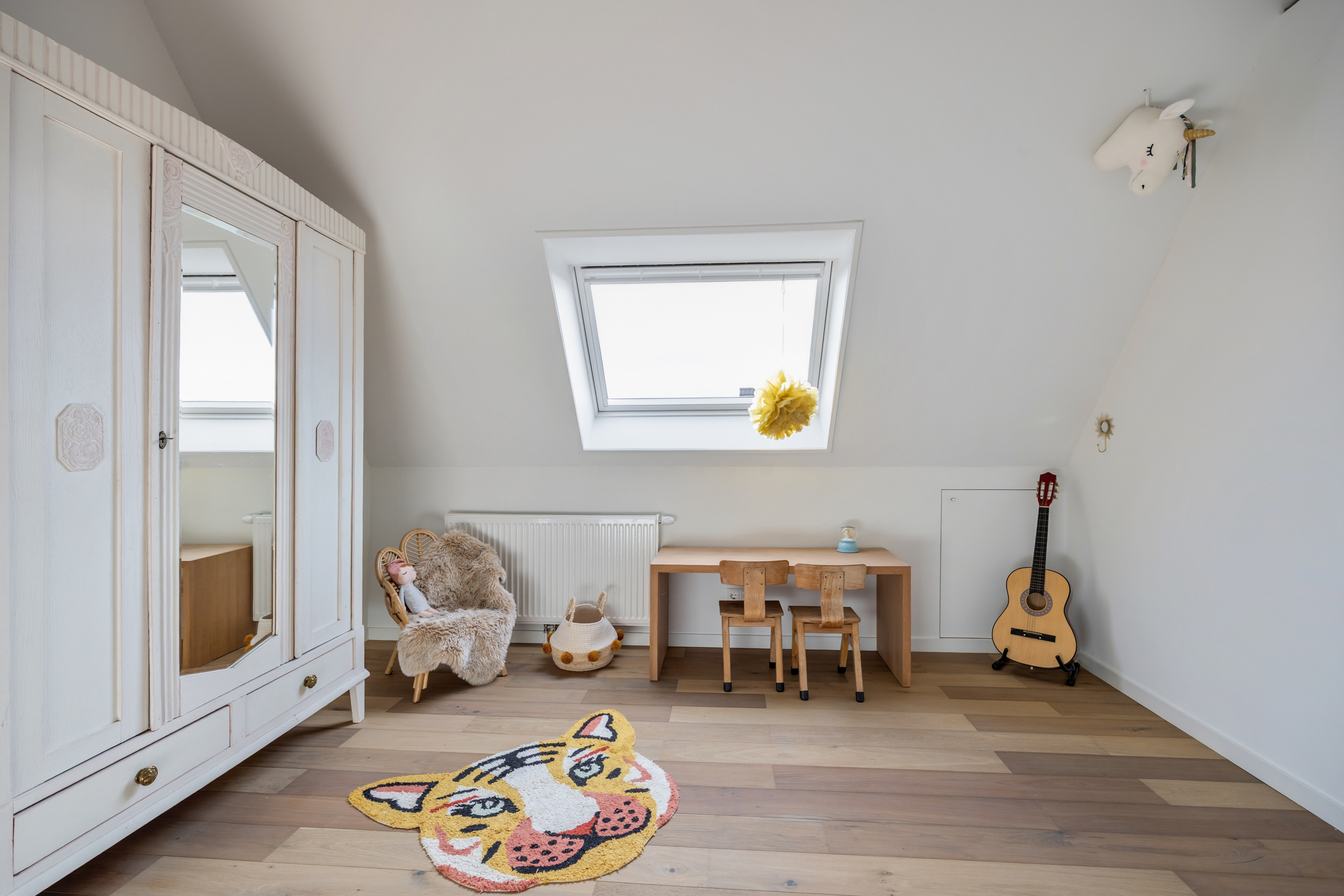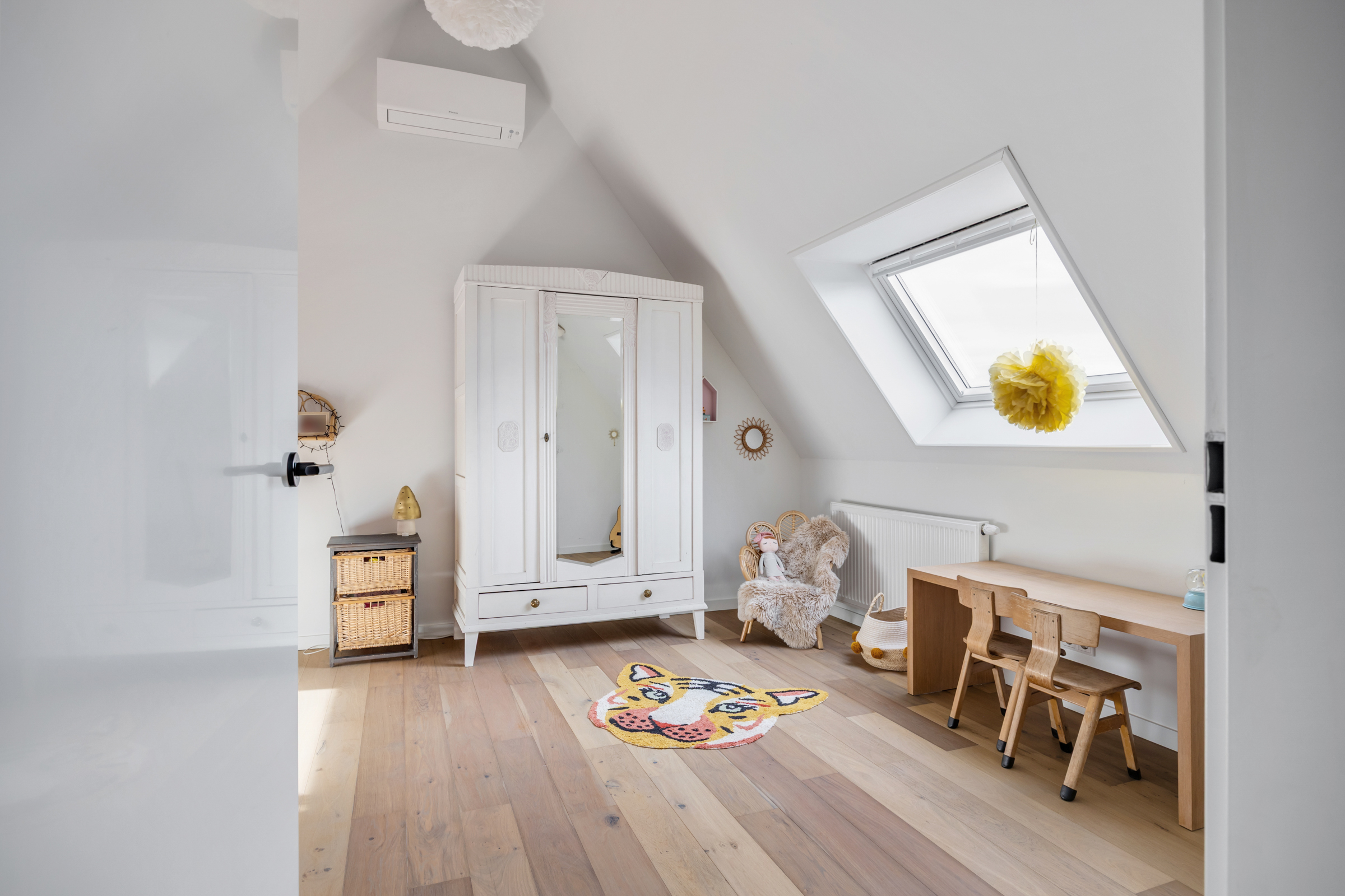 De derde slaapkamer, gelegen aan de voorzijde, beschikt over een fraaie lamelparketvloer, strak gestuukte wanden en plafond, bergruimte achter de knieschotten en een groot dakraam waardoor veel daglicht binnenvalt. Daarnaast is deze kamer voorzien van airconditioning, wat zorgt voor een aangenaam klimaat het hele jaar door. De tussenkamer heeft eveneens een dakraam en is reeds voorbereid op de aanleg van een tweede badkamer – ideaal voor wie extra comfort of flexibiliteit zoekt.