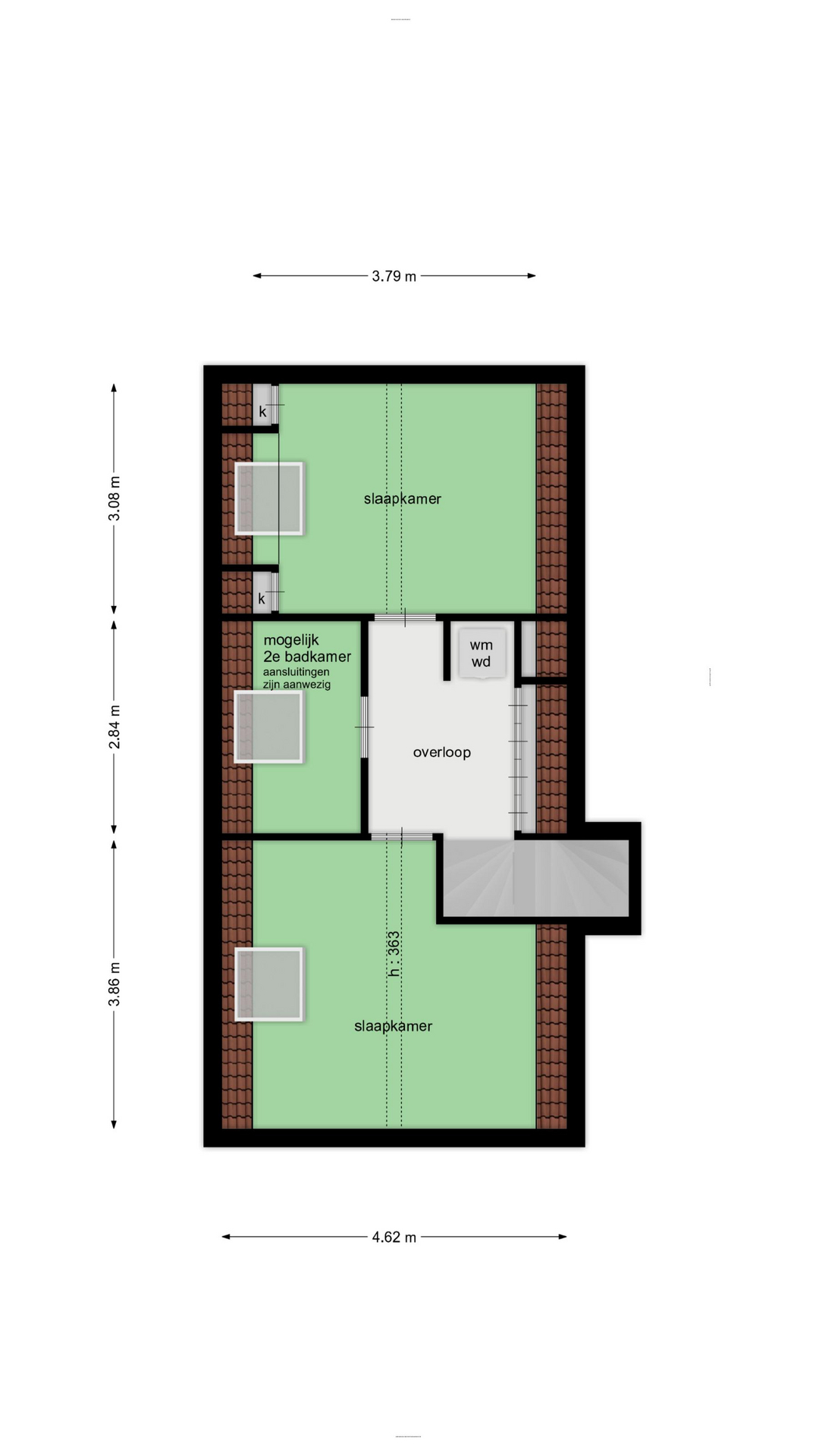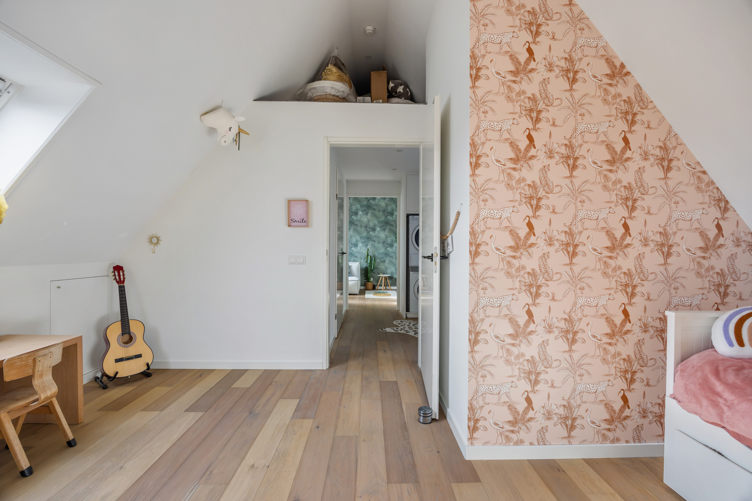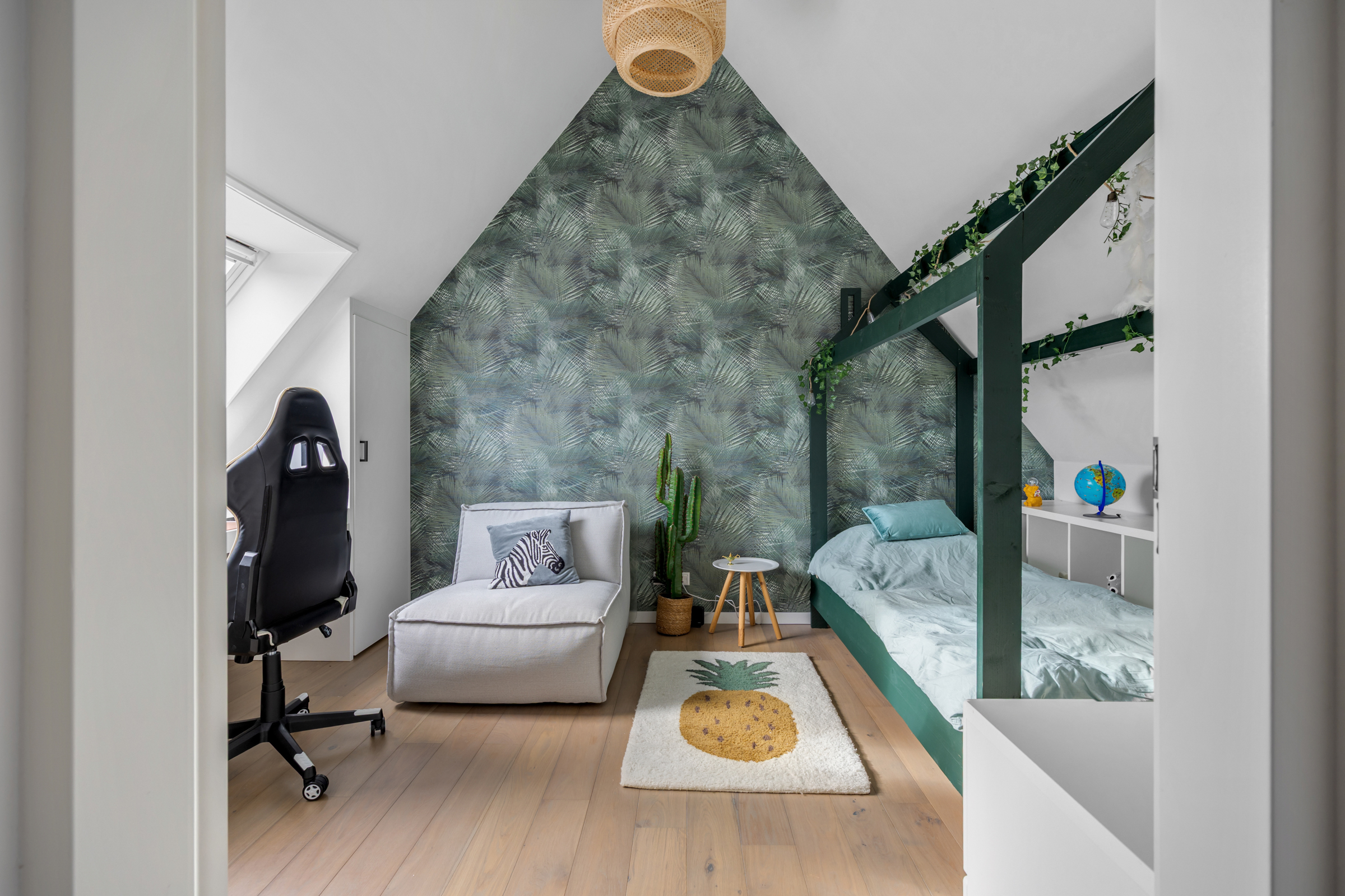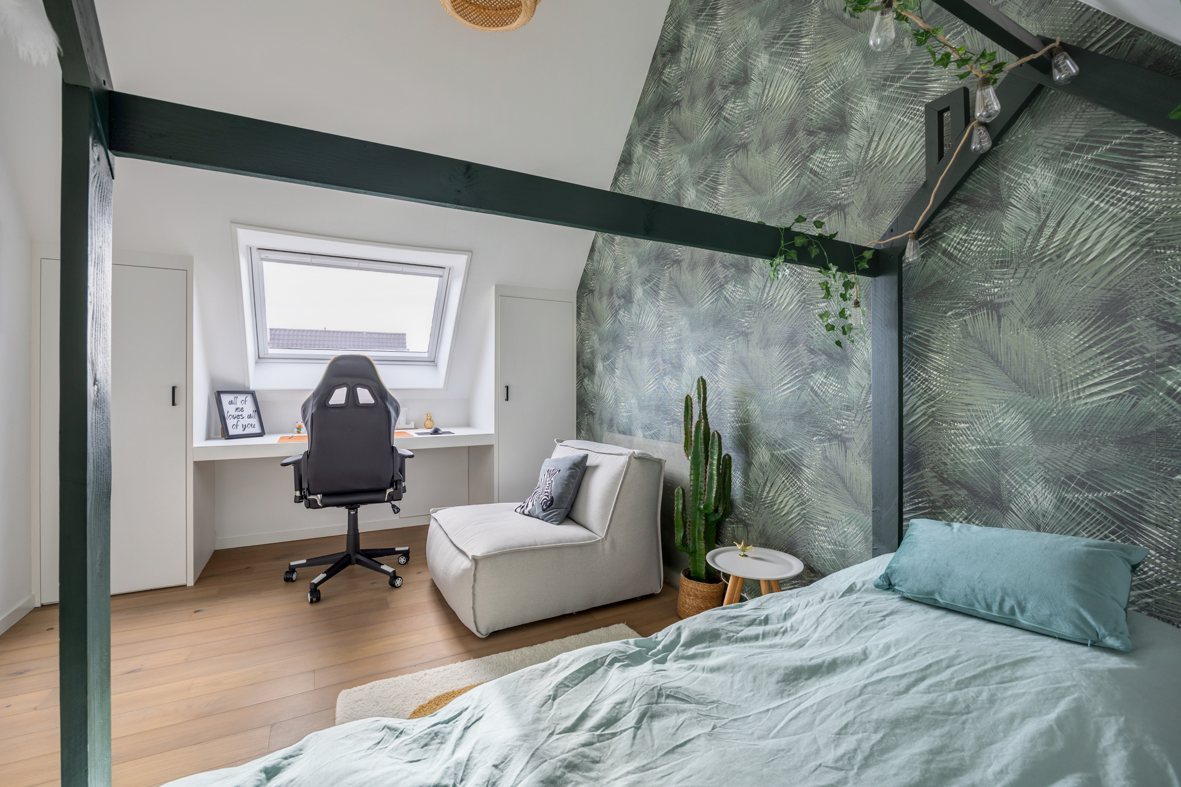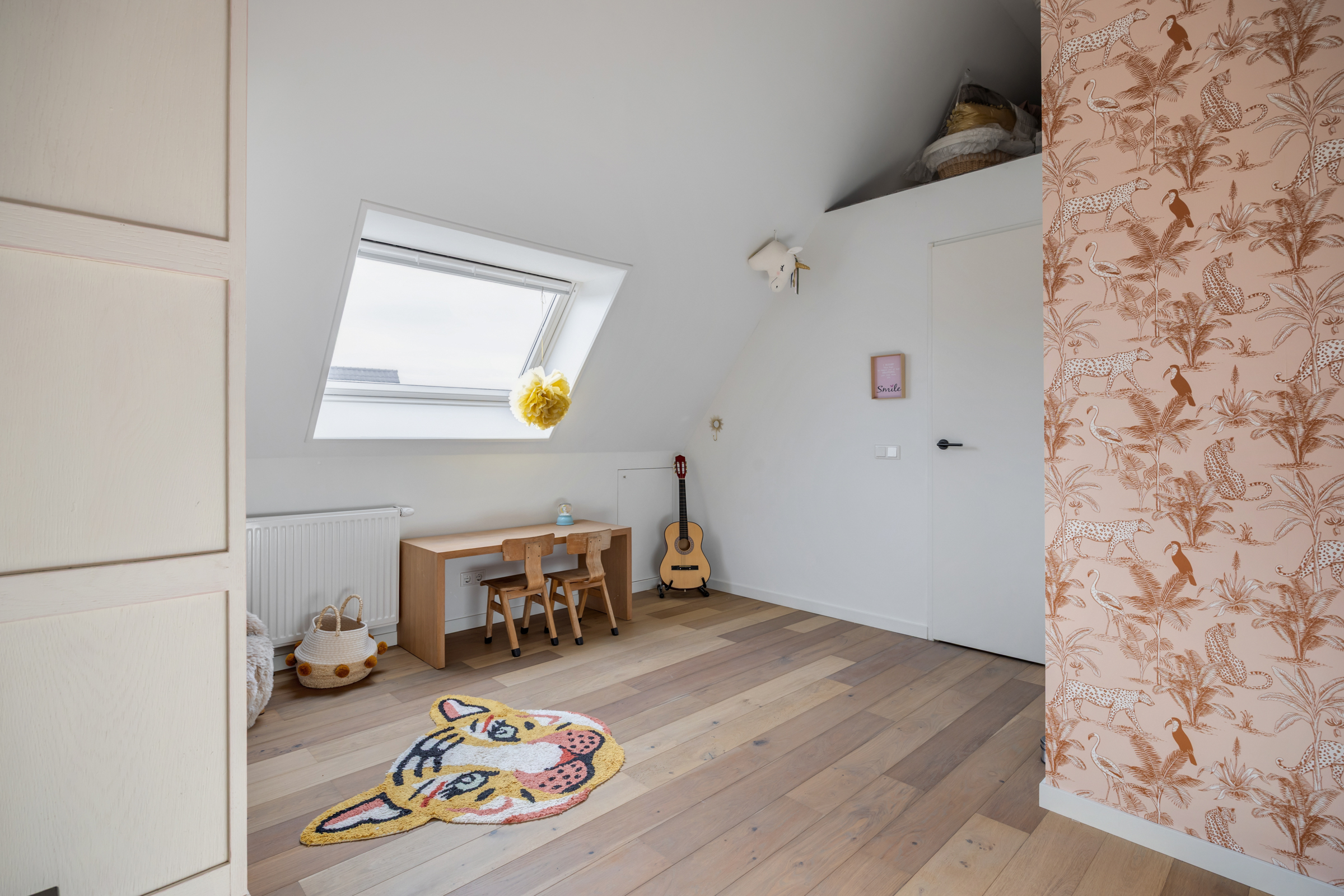 De derde slaapkamer, gelegen aan de voorzijde, beschikt over een fraaie lamelparketvloer, strak gestuukte wanden en plafond, bergruimte achter de knieschotten en een groot dakraam waardoor veel daglicht binnenvalt. Daarnaast is deze kamer voorzien van airconditioning, wat zorgt voor een aangenaam klimaat het hele jaar door. De tussenkamer heeft eveneens een dakraam en is reeds voorbereid op de aanleg van een tweede badkamer – ideaal voor wie extra comfort of flexibiliteit zoekt.